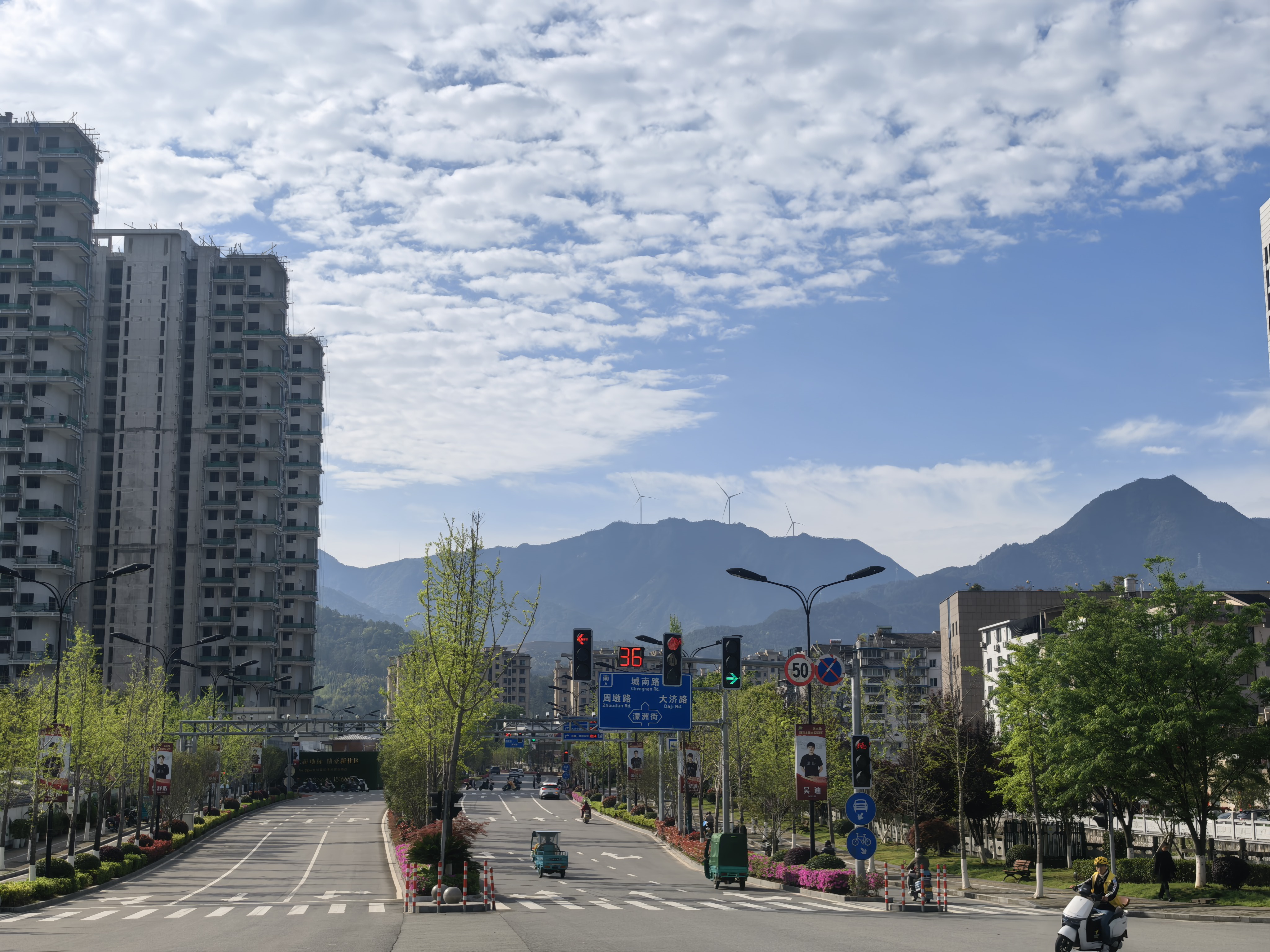 城南路转角,春日微风里,电动车掠过斑马线,远山在蓝天白云下静静守望。