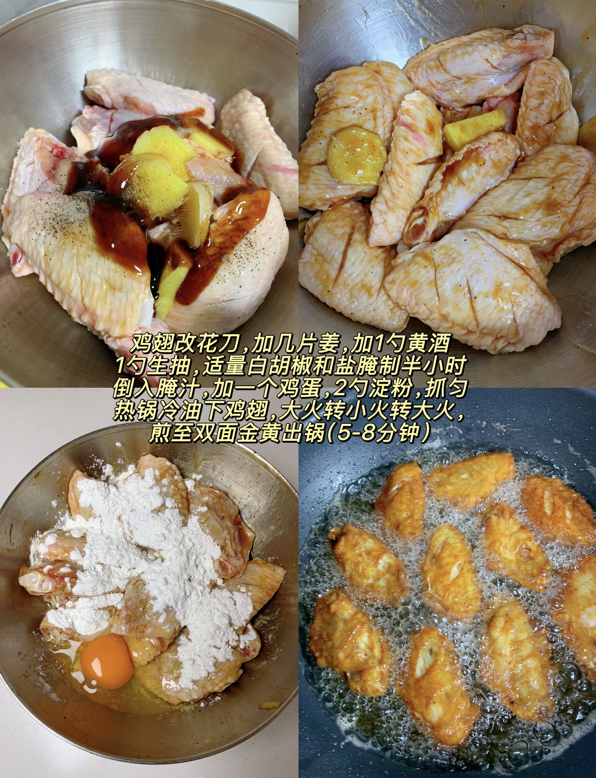 炸鸡翅做法:鸡翅改花刀,加几片姜,加1勺黄酒,1勺生抽,适量白胡椒和盐腌制半小时,倒出腌汁,加一个鸡蛋,2勺淀粉,抓匀,热锅冷油下鸡翅,大火转小火转大火,煎至双面金黄出锅(5-8分钟)