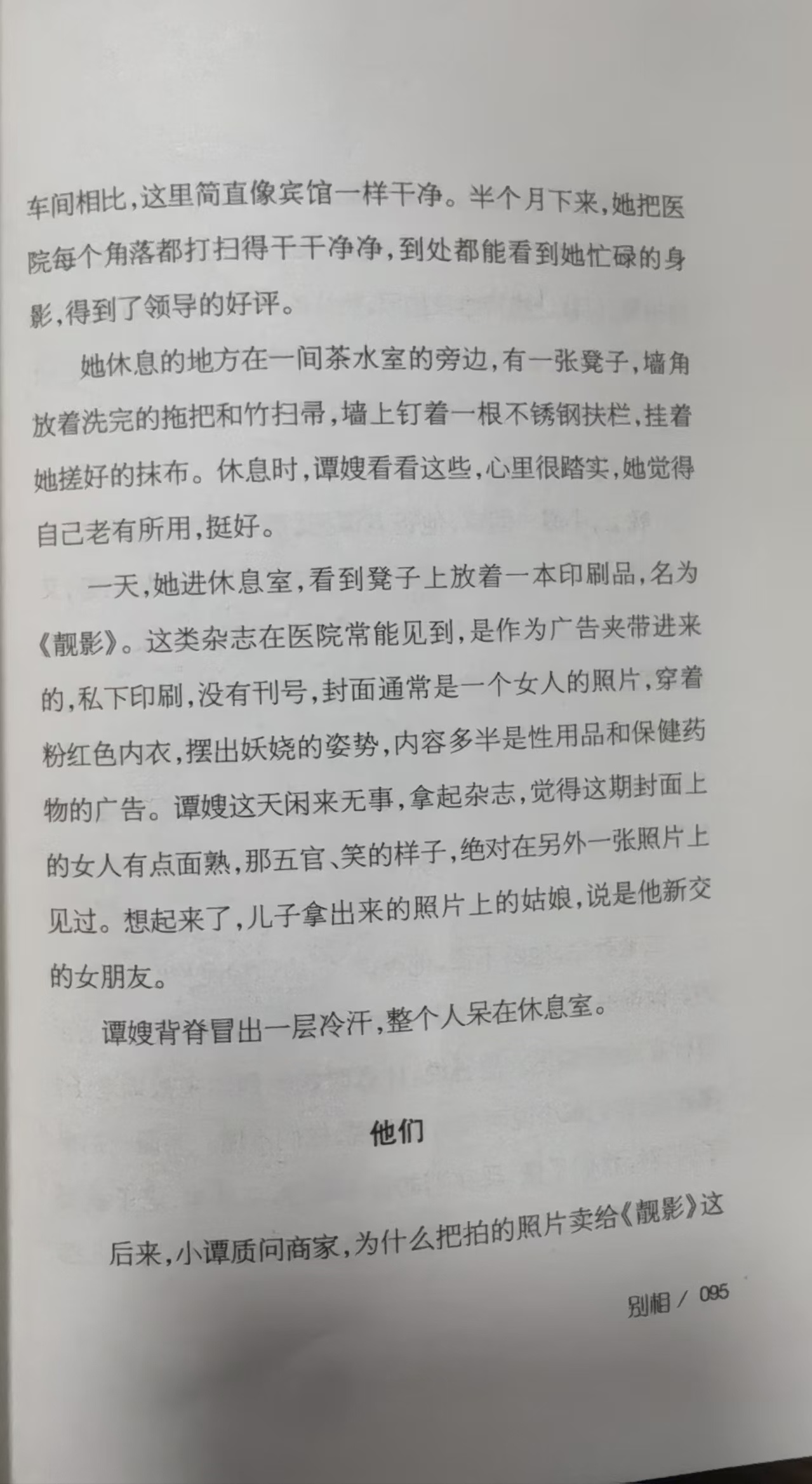 半个月下来,她把医院每个角落都打扫得干干净净,到处都能看到她忙碌的身影,得到了领导的好评。 她休息的地方在一间茶水室的旁边,有一张凳子,墙角放着洗完的拖把和竹扫帚,墙上钉着一根不锈钢扶栏,挂着她搓好的抹布。休息时,谭嫂看看这些,心里很踏实,她觉得自己老有所用,挺好。——赵雨《岭上》