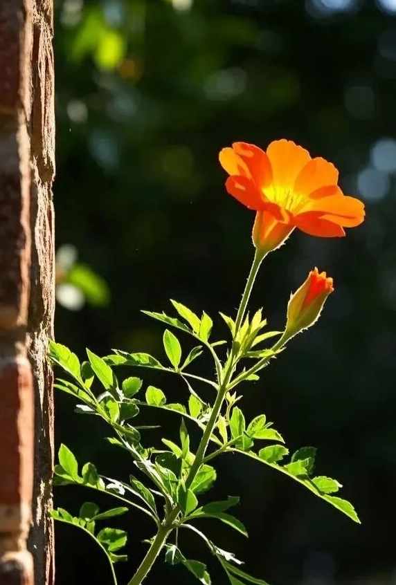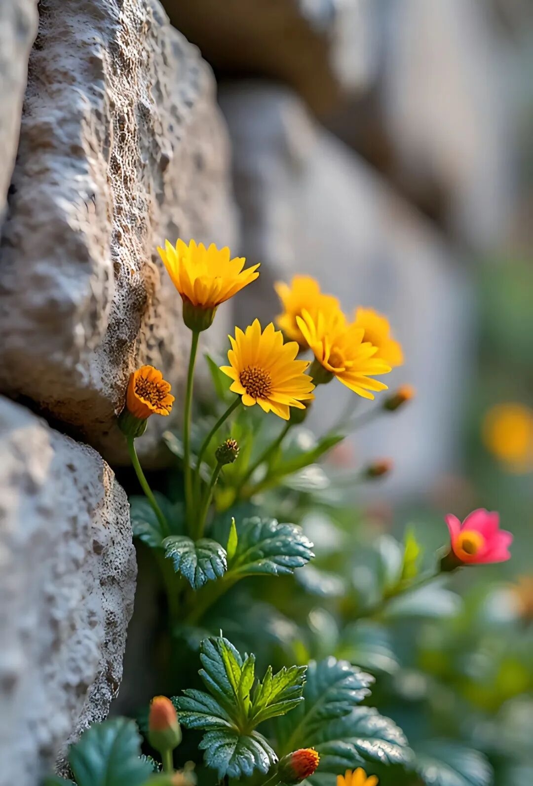 谁说石头缝里开不出花?橙粉黄三色野花,在砖墙石缝间晒着太阳,倔强又可爱~