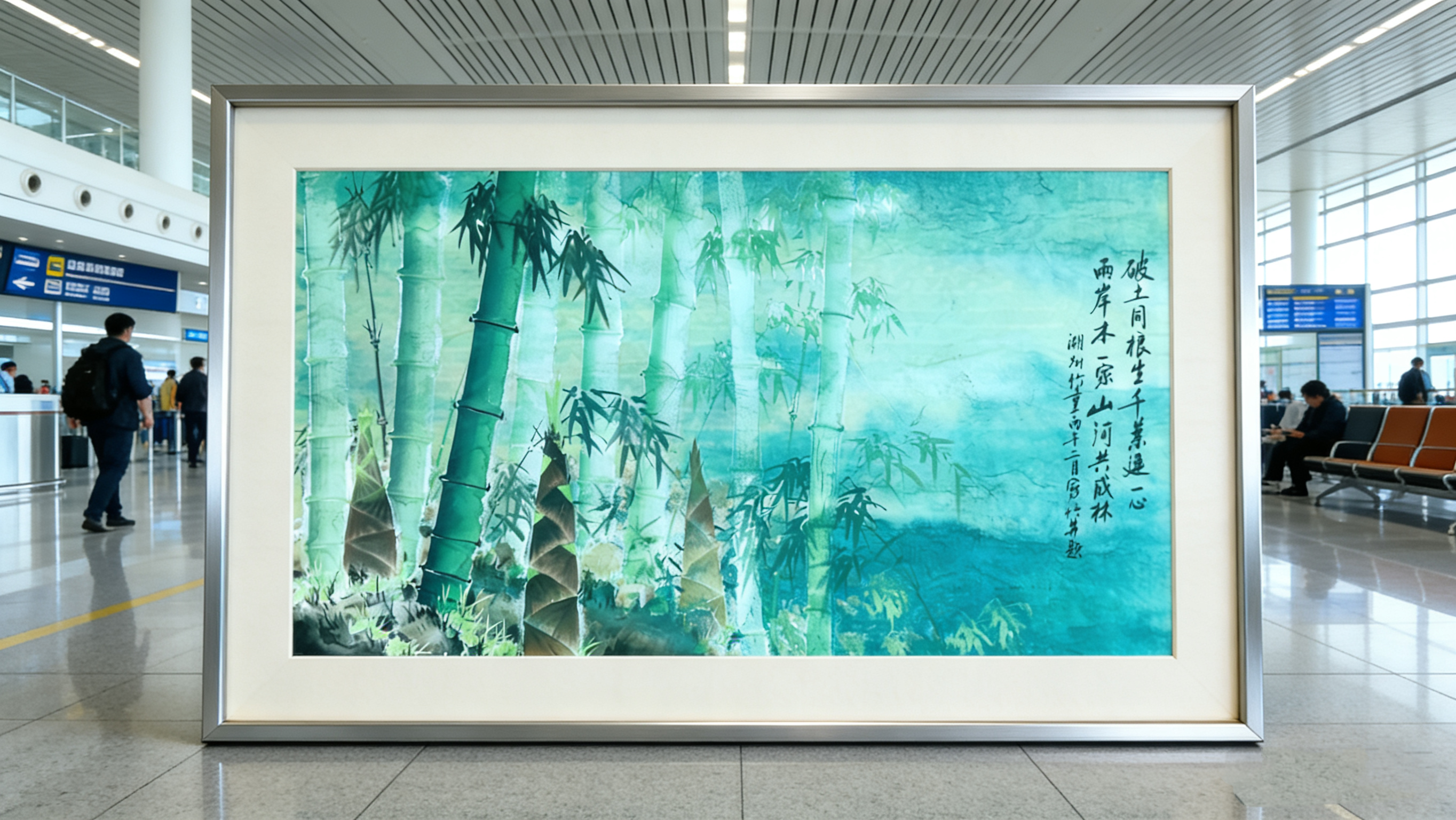 竹笋画卷:根脉相连的艺术宣言 一、意象解读:竹之精神,两岸之喻 这幅画作以破土而出的竹笋群像为核心意象,构建了一幅极具象征意义的视觉诗篇。画家选择竹笋而非成竹作为表现主体,颇具深意——竹笋是竹之初心,是生命的起点,正如两岸同胞同文同种、血脉相连的最初渊源。 画面中,数株竹笋从同一片土壤中竞相萌发,"破土同根生"的题诗在此获得完美的视觉诠释。竹笋外壳的褐色与内部嫩绿的渐变,暗示着保护与新生的辩证关系;而背景中已然成林的翠竹,则预示着这些新生命终将长成参天大材,"千葉連一心"——万千叶片虽各据一枝,却共享同一根系的营养与律动。 二、技法分析:传统笔墨与当代表达 从画面效果来看,画家延续了您此前"雪竹"创作中探索的分层画法与洗墨法,但在色彩运用上更为大胆创新: 青绿基调:以石青、石绿为主调,营造江南竹林特有的湿润氤氲之气,同时赋予画面清新向上的时代感 虚实相生:背景竹林以淡墨渲染,朦胧如远山云雾;前景竹笋则以较浓的墨色勾勒轮廓,形成强烈的空间纵深感 光影处理:画面右侧的光源处理颇具现代意识,竹笋表面的明暗变化暗示着晨光穿透林叶的自然效果 这种"以古开今"的技法路径,恰如两岸文化同源的隐喻——根基是传统,生长却指向未来。 三、主题升华:山河共成林的家国情怀 题诗的后两句"兩岸本一家,山河共成林",将画面从自然审美推向人文境界。画家以"林"喻"邻",以竹之成林象征两岸同胞终将共筑民族复兴的盛世景象。 值得注意的是,画面构图采用低视角仰视,观者仿佛蹲下身来,与这些刚刚破土的竹笋平视。这种视角选择消解了距离感,邀请观者以谦卑而亲近的姿态,见证生命的萌发与成长——正如两岸人民应当放下成见,回归本真,在共同的根脉中寻找和解与共生之道。 四、结语 这幅《竹笋画卷》是一幅"有温度的政治",也是"有立场的艺术"。它不诉诸口号式的直白表达,而是借助中国文人画传统的象征体系,将"两岸一家亲"的宏大叙事,转化为可感可触的生命意象。在湖州竹派的传统中,竹子从来不仅是植物,更是人格与理想的投射;而此作将这一传统推向新的维度——竹,亦可成为民族集体命运的隐喻。