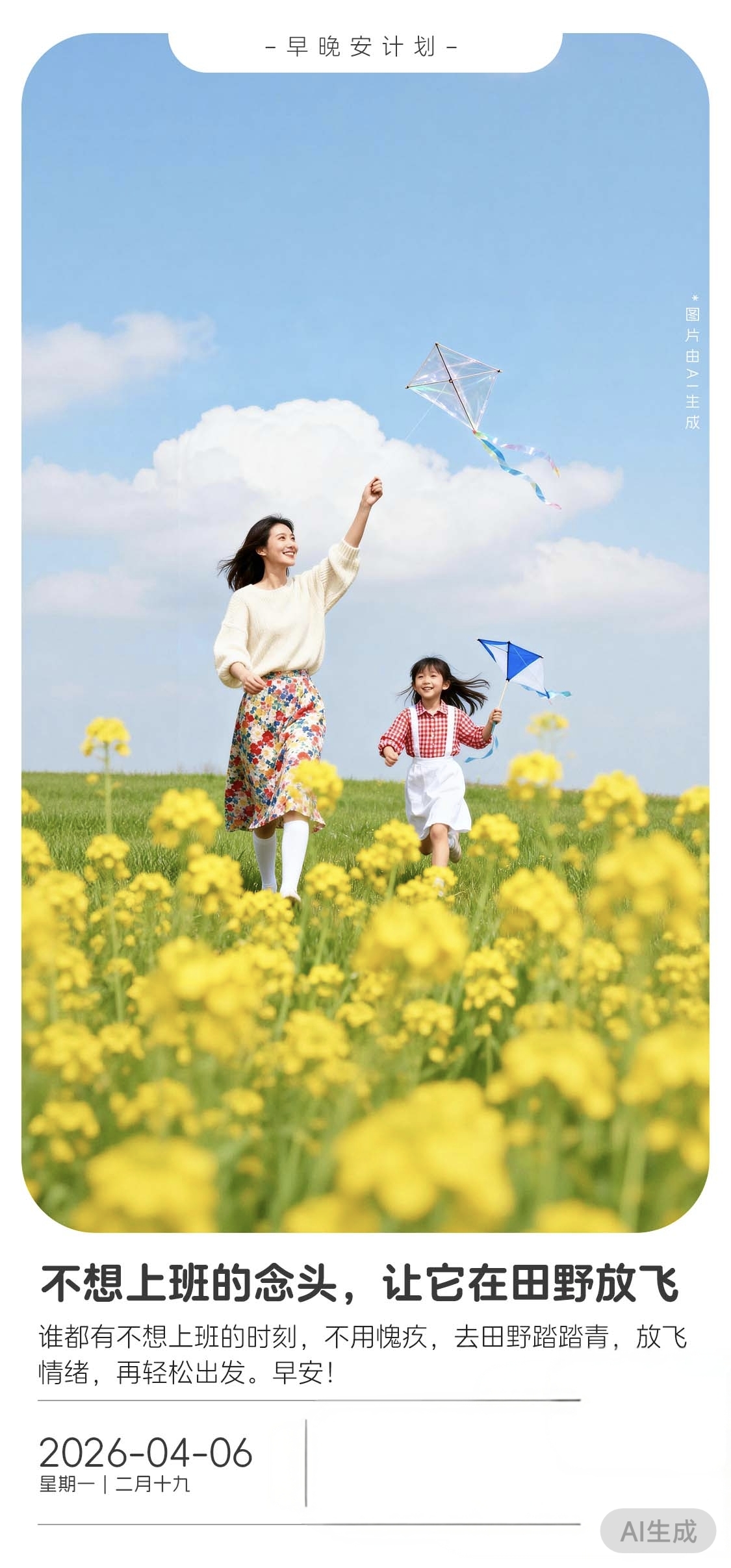 《田野放飞时》 清晨的风,带着油菜花的甜香,轻轻拂过脸颊。天空是水洗过的蓝,云朵像被谁随手揉软的棉花糖,蓬松地浮在半空。脚下的田野,是铺展到天边的金黄——那是油菜花盛开的季节,每一朵小花都仰着脸,向着太阳微笑,也向着奔跑的人们招手。 一位母亲,穿着米白毛衣与碎花长裙,发丝随风飞扬,她高举手臂,手中线轴牵引着一只透明骨架、彩带飘舞的风筝,像在与风对话,又像在放飞某种轻盈的梦想。身旁的小女孩,红格子衬衫配白色背带裙,奔跑如风,手中握着一只蓝白相间的小风筝,笑声清脆,像一串银铃,撞在花海之间,荡开一圈圈快乐的涟漪。 她们不赶时间,也不问归期。只是跑,只是笑,只是让风筝越飞越高,直到融入云层,仿佛把心底那些“不想上班”的念头,也一并托付给天空。那些被生活压弯的脊背,在这一刻被风吹得挺直;那些被琐事填满的思绪,在这一刻被花香洗得澄澈。 谁没有不想上班的时刻?谁没有想逃离格子间、奔向旷野的冲动?不必愧疚,不必自责。情绪本就需要出口,就像风筝需要风。去田野踏青吧,让脚步踩碎焦虑,让笑容驱散阴霾。把心交给风,让它在高空自由盘旋;把身体交给大地,让它在泥土与花香中重新充电。 当夕阳西下,风筝收线,心情也悄然归位。不是逃避,而是蓄力;不是懈怠,而是温柔地告诉自己:我值得这样的放松,也值得更好的出发。 早安,亲爱的你。愿你今日,如这田野般开阔,如这风筝般自由——哪怕暂时想逃,也逃得轻盈,飞得漂亮,再带着满身花香,微笑回到人间烟火里。 ——2026年4月6日,星期一,二月十九,晨光正好,宜放风筝,宜放飞心情。(图源中国移动)
