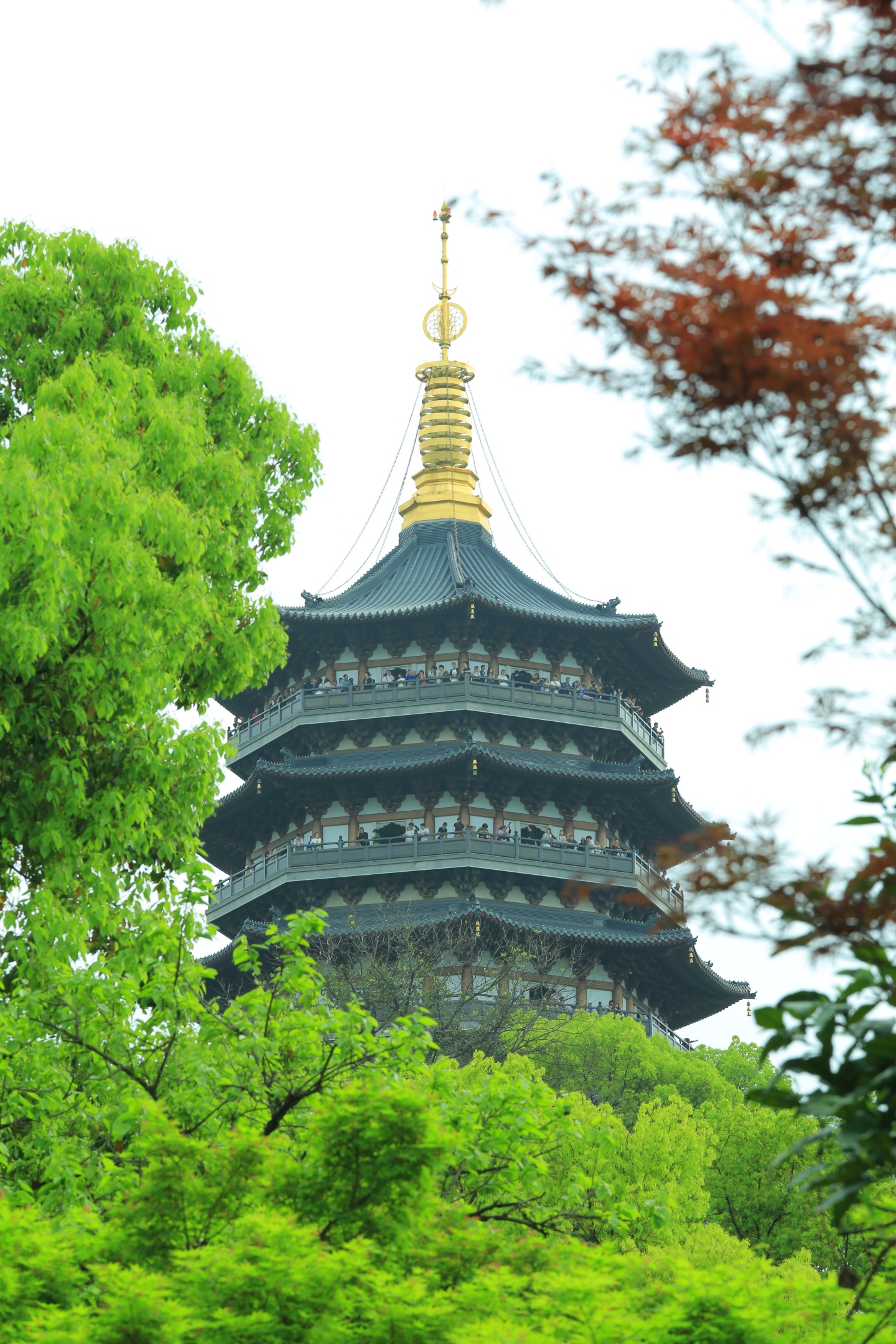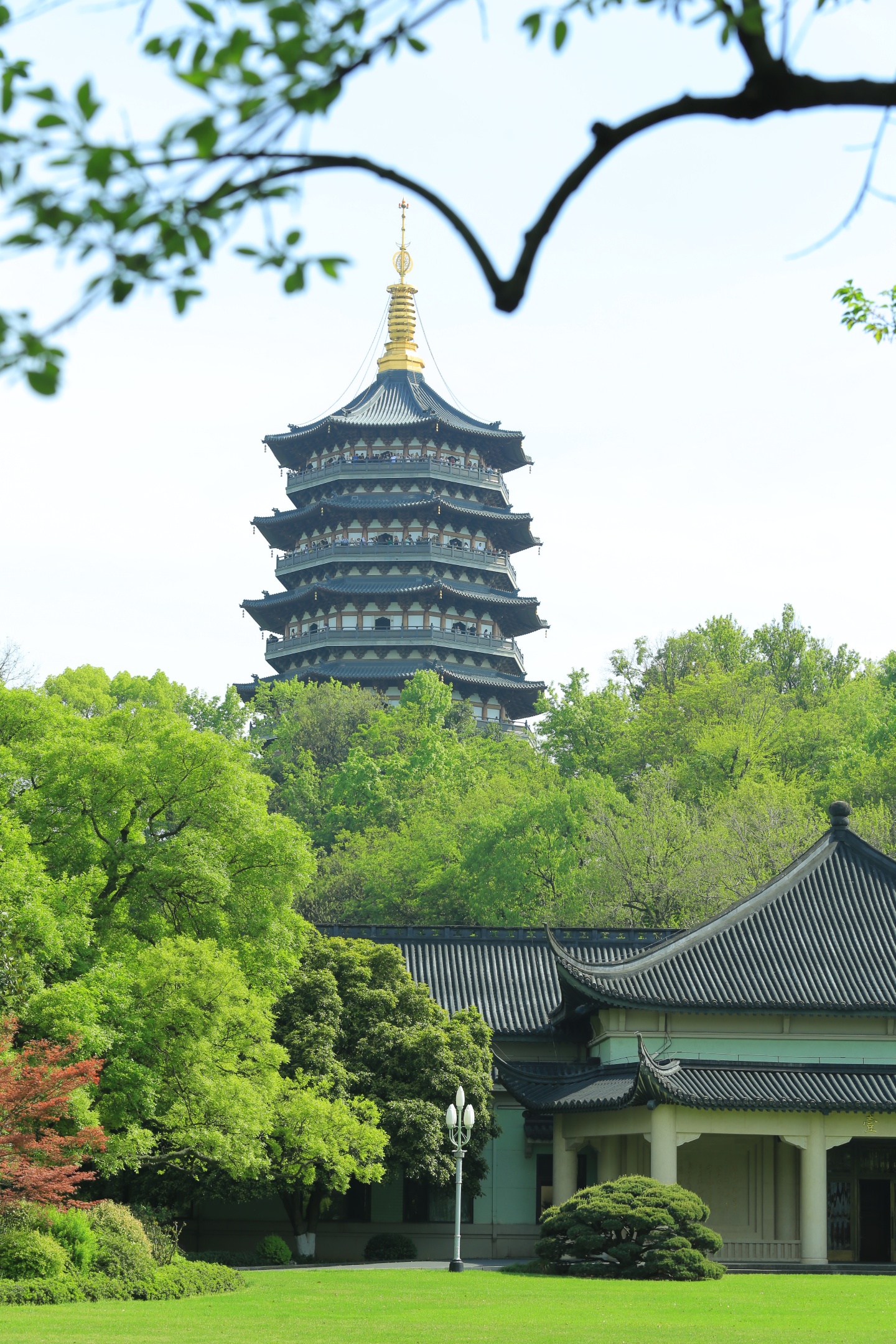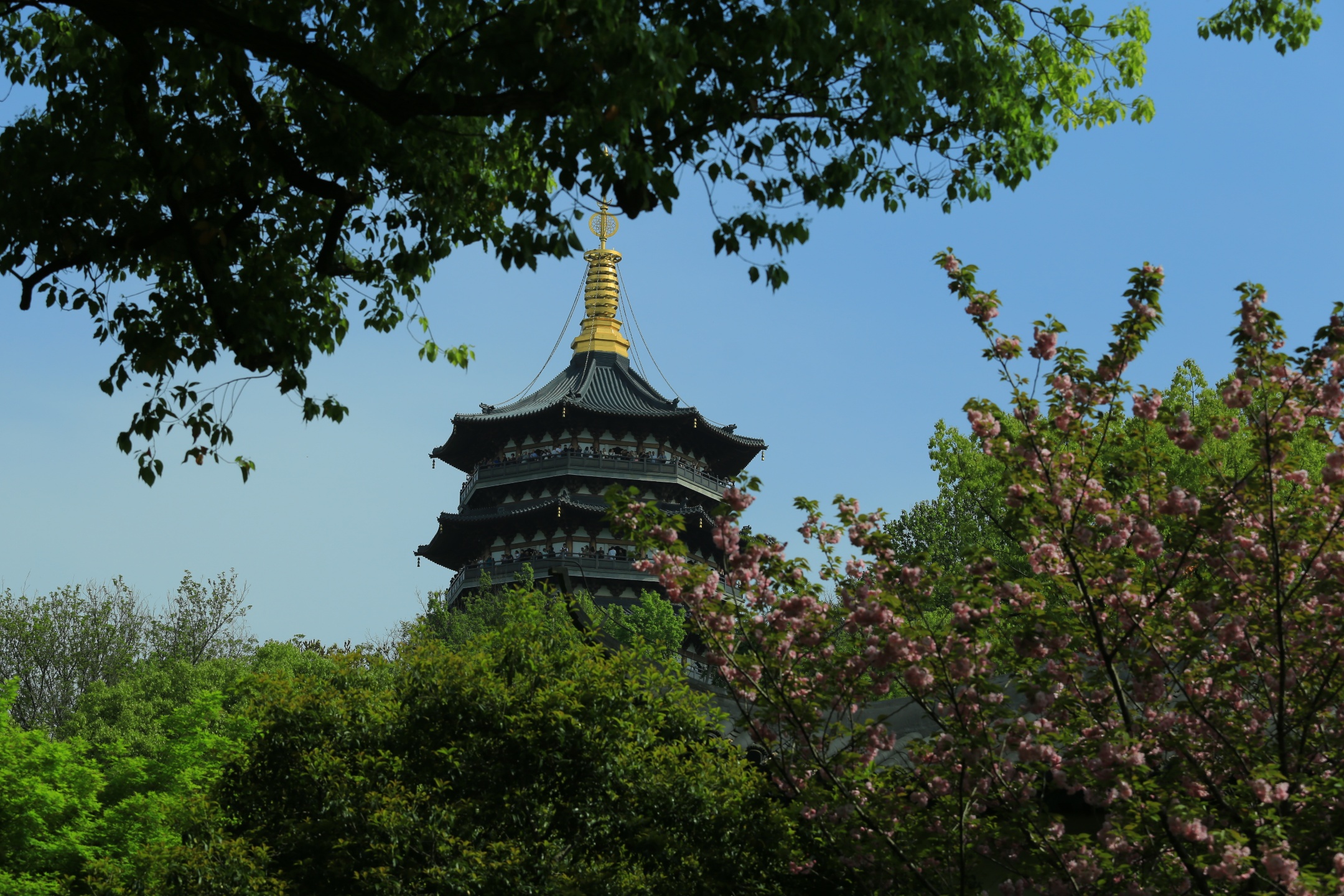 西湖边柳绿樱粉,雷峰塔倒映湖中,游船划开一池春色~随手一拍都是壁纸!