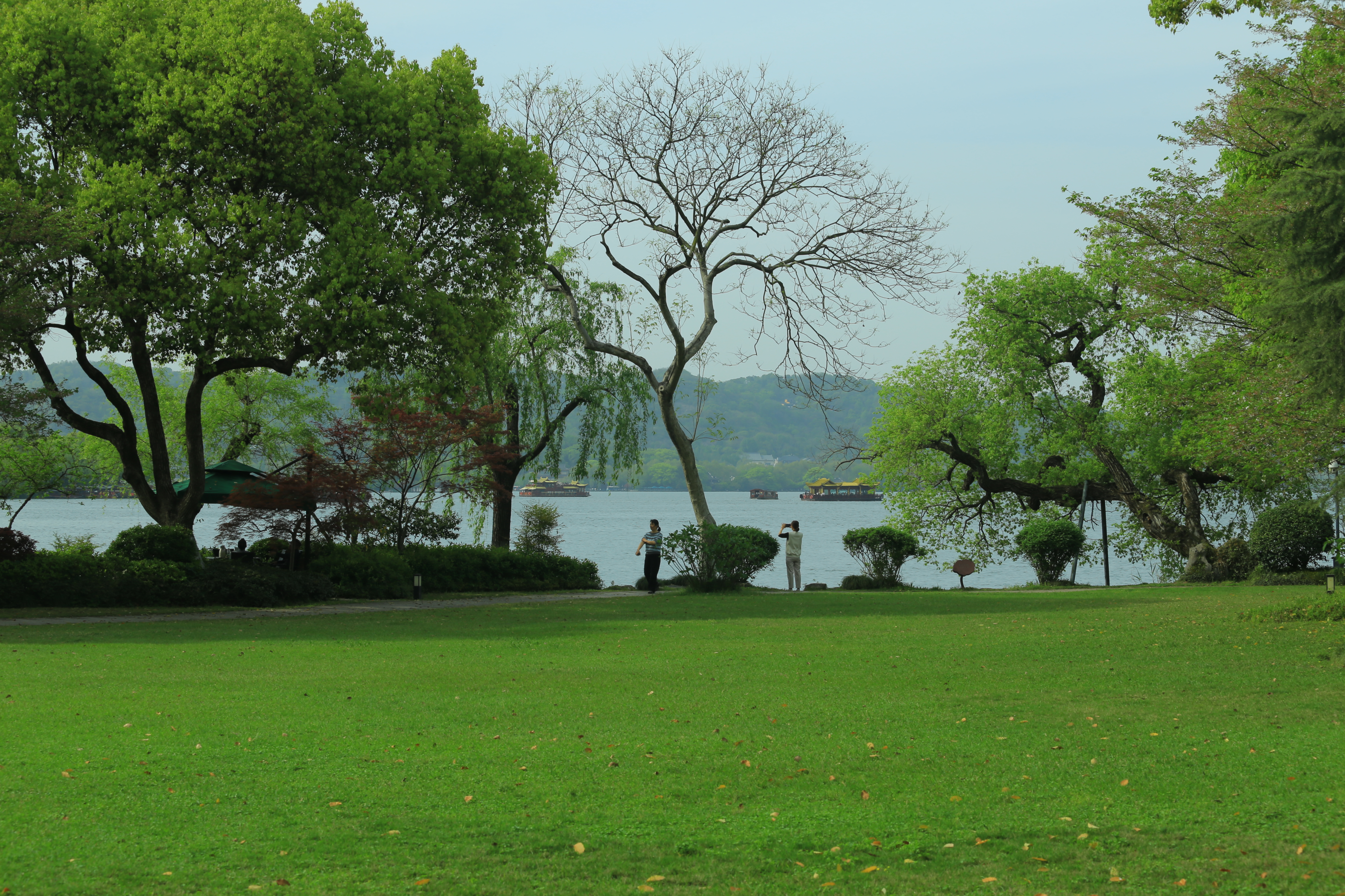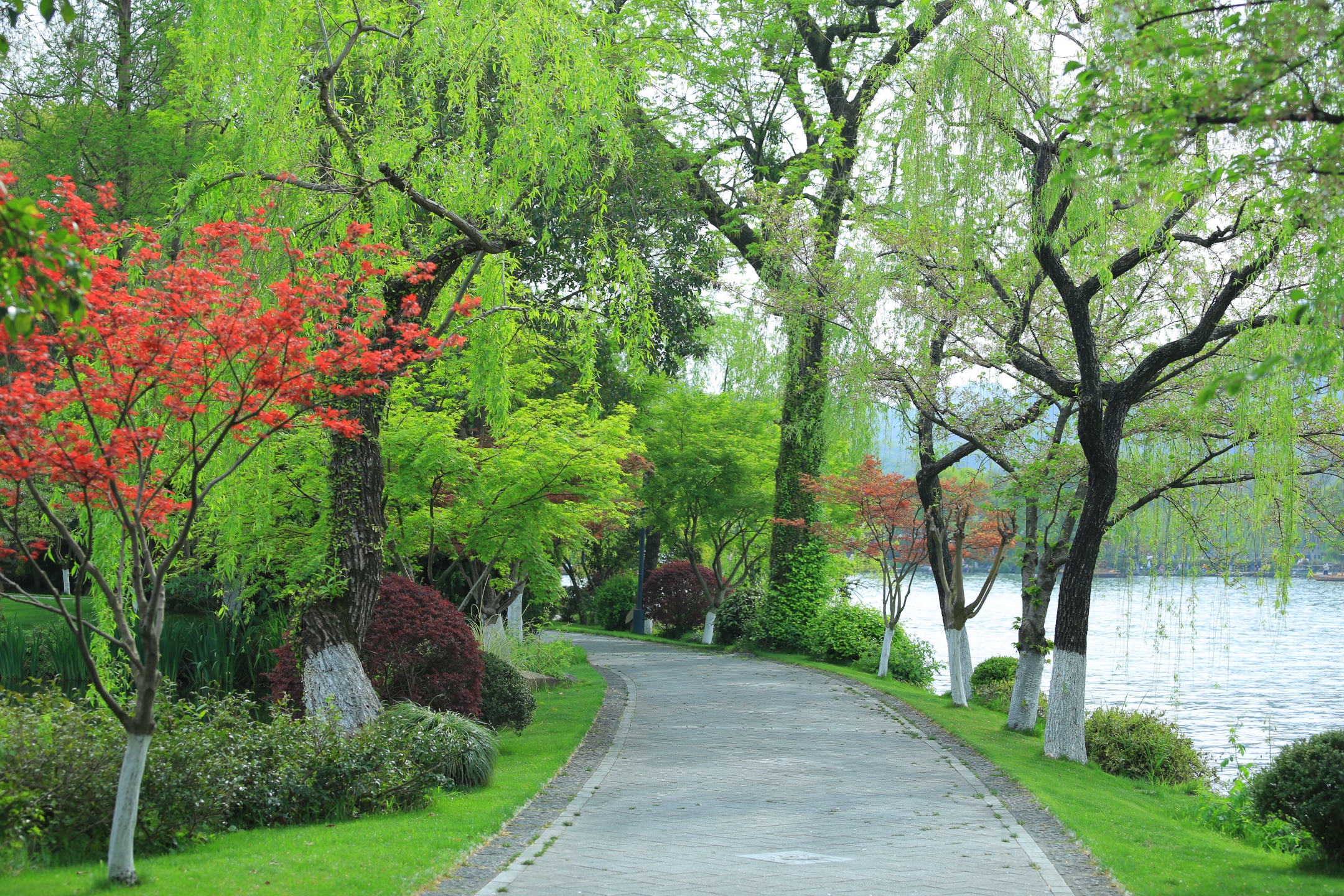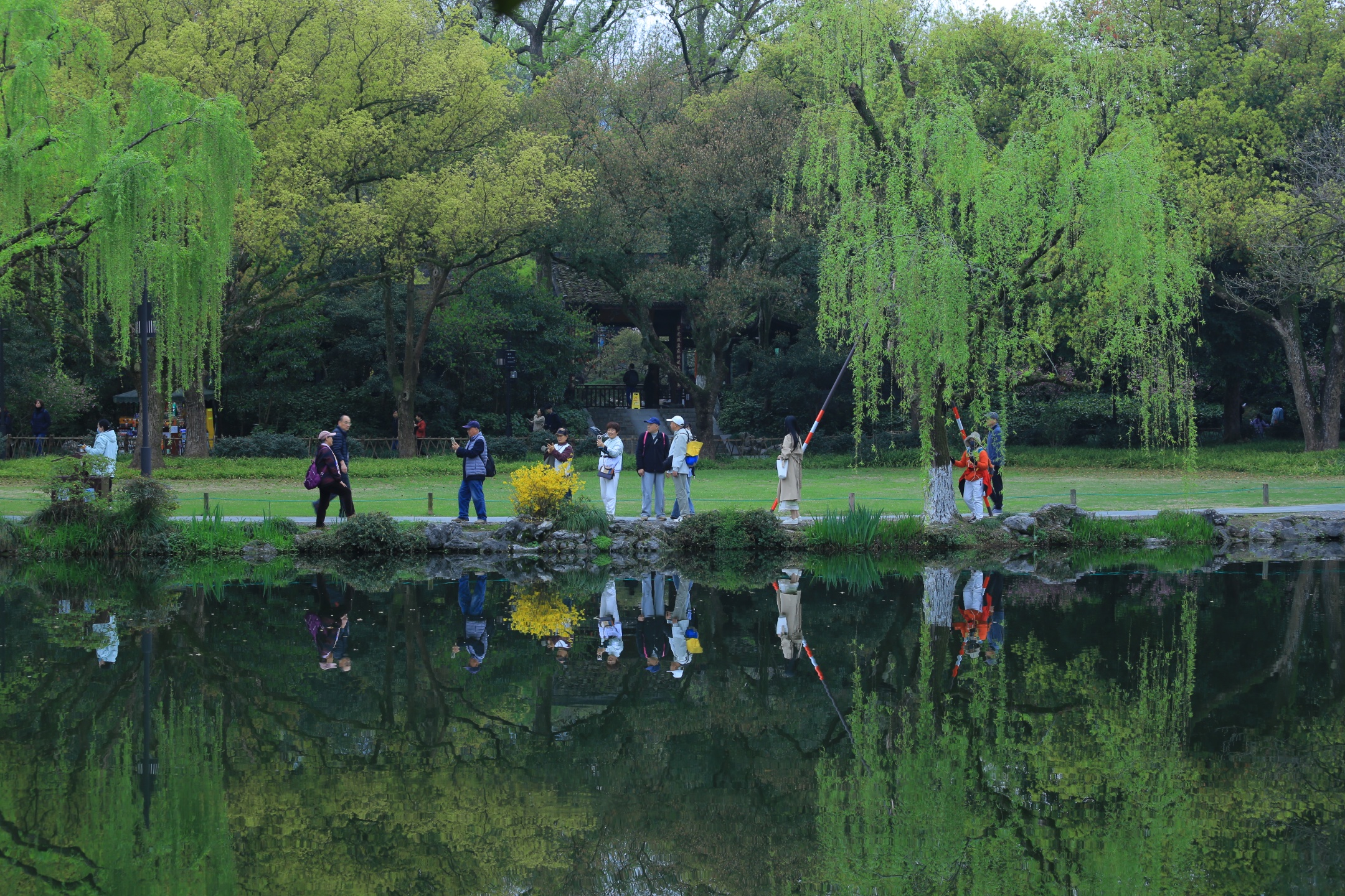 西湖边柳绿樱粉,雷峰塔倒映湖中,游船划开一池春色~随手一拍都是壁纸!