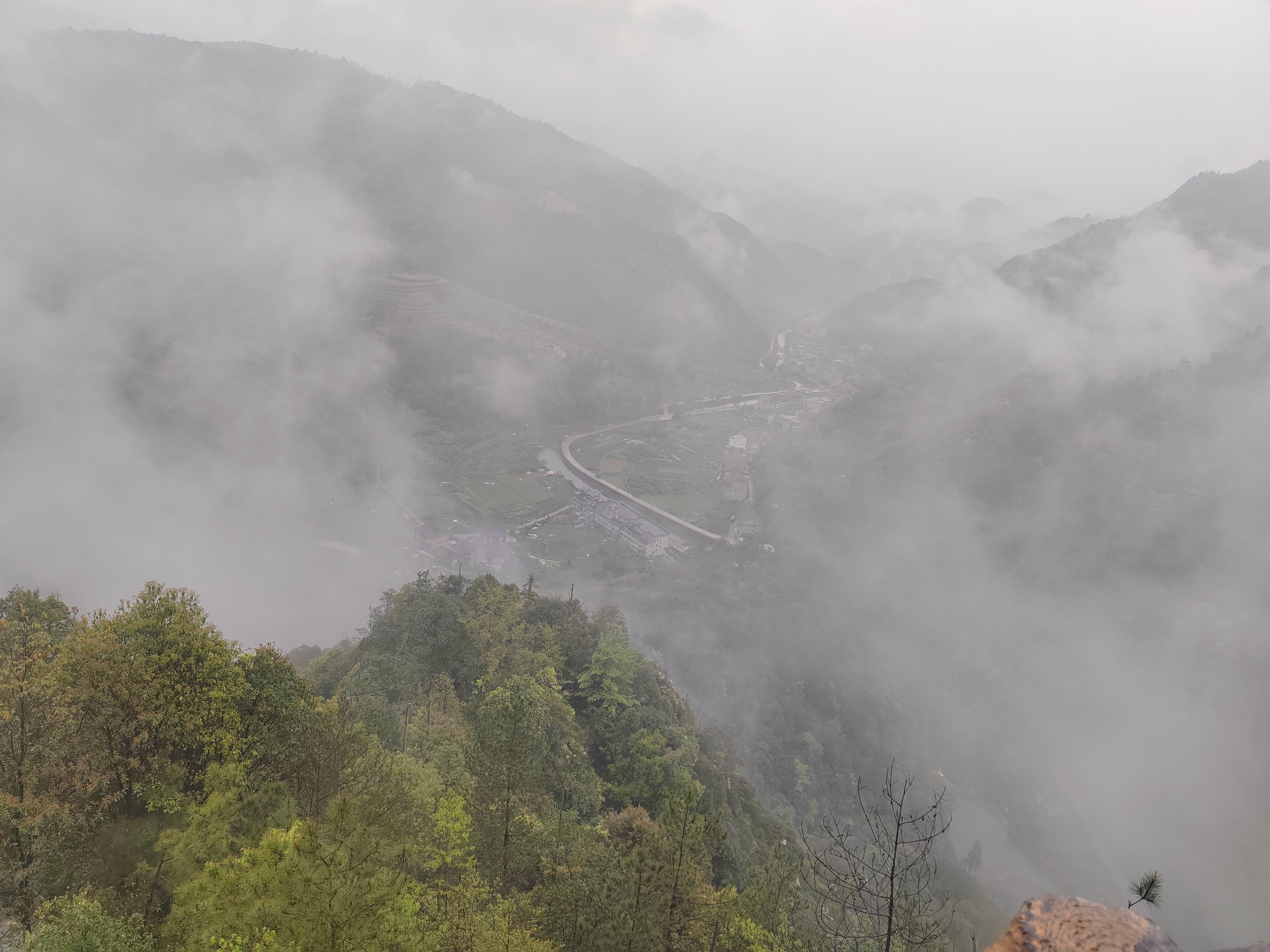 在山上往下看,雾气蒙蒙的村庄