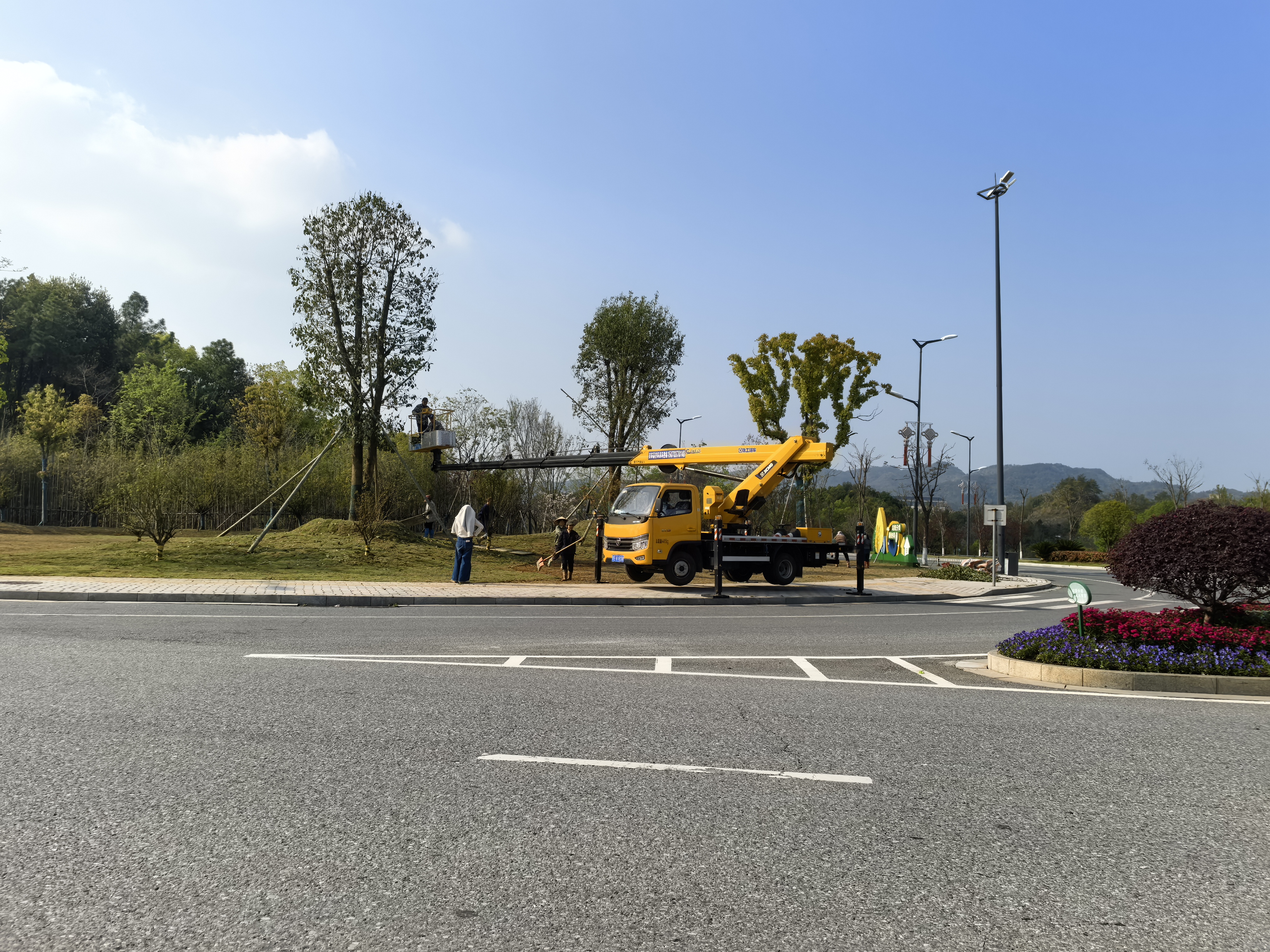 晴天下的城市美颜师上线!黄车升空,剪出春日线条~🌳🔧 #园林养护日常#做自己的春天# #镜头下的美好生活#
