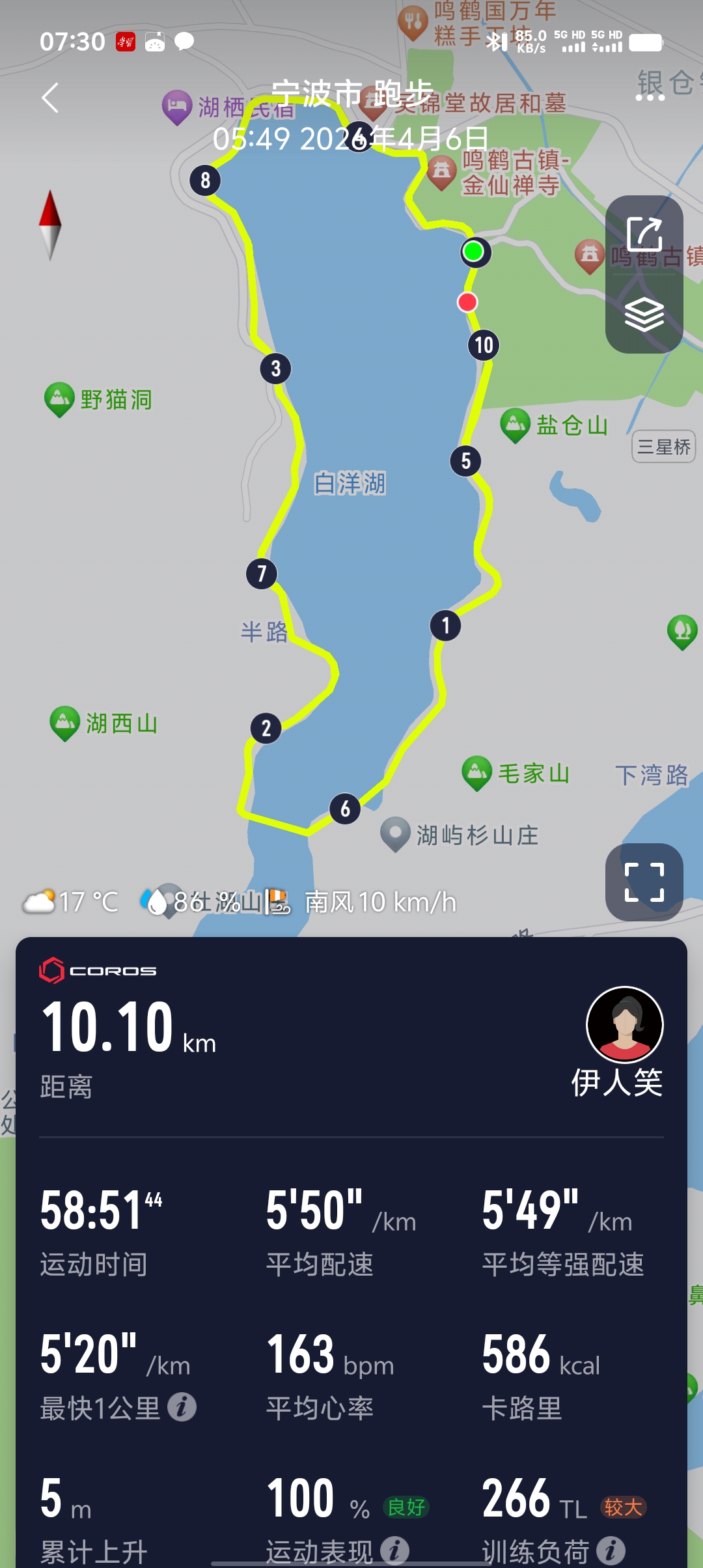 一周一山一嘉宾热身早餐跑,晨跑白洋湖,金仙寺倒影入画,10.10公里配速5'50",山色湖光全收进镜头里~炫起来!