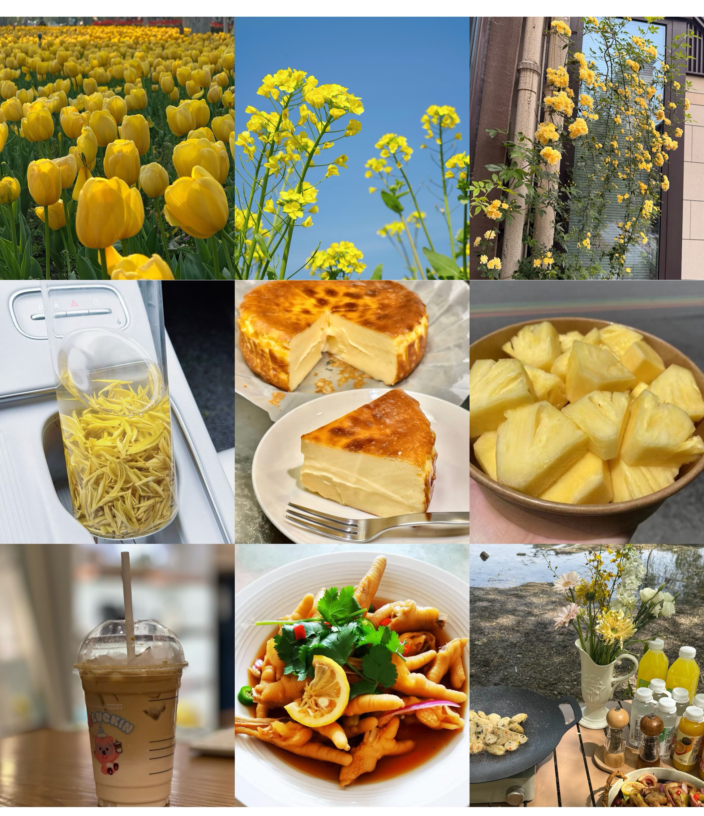 春日限定明黄色九宫格✨ 从花海的明媚,到甜品的治愈,再到烟火的鲜活 每一张都是生活里的小美好 愿我们永远明亮,永远热爱