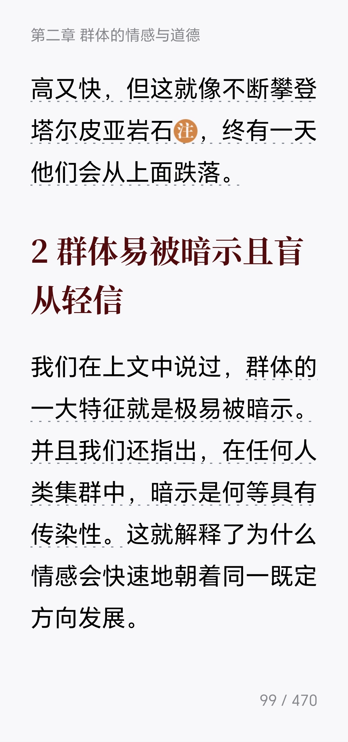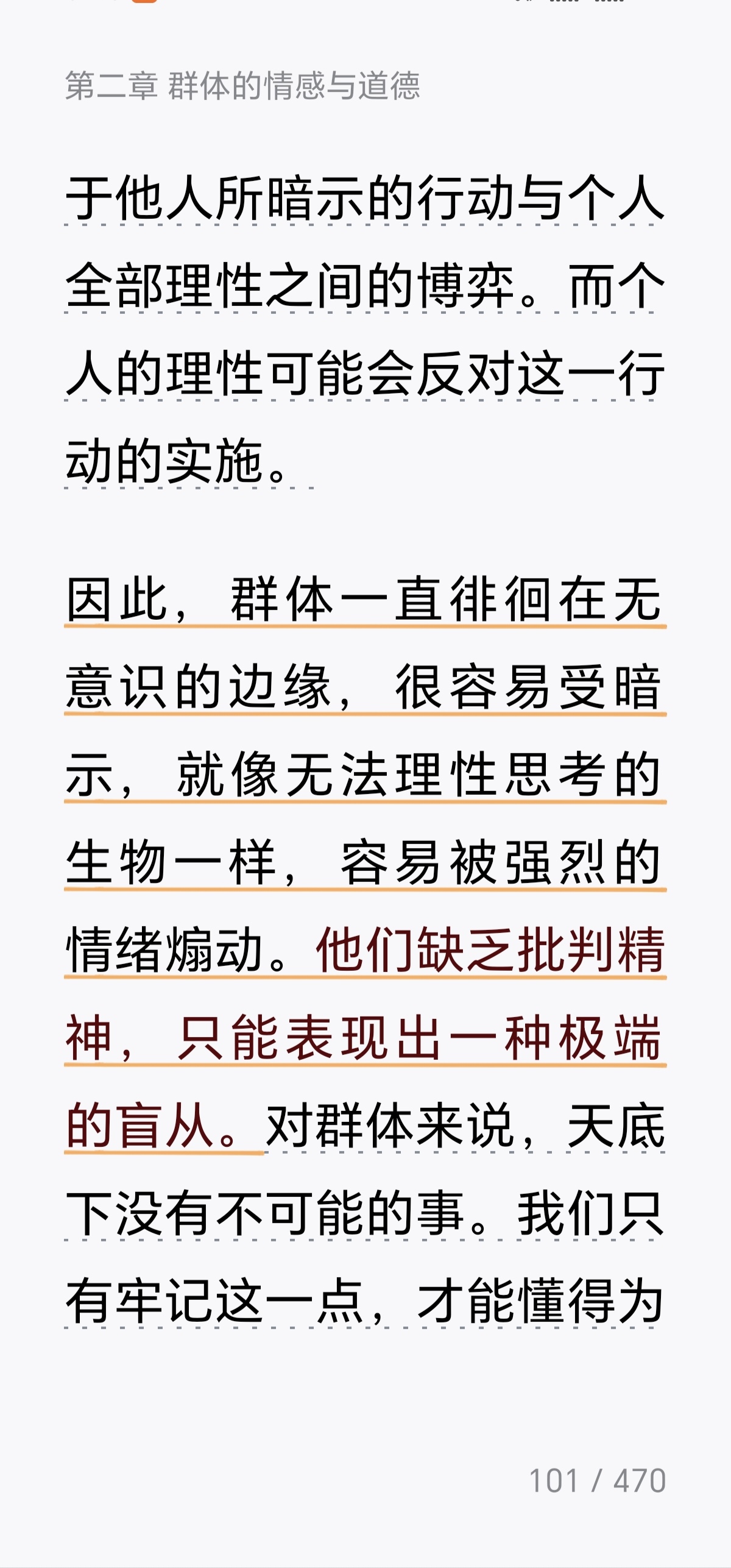 《乌合之众》第二章《群体的情感和道德观》主要分析了群体在情感与道德层面的五大特征:冲动、多变和急躁;易受暗示和轻信;情绪的夸张与单纯;偏执、专横和保守;以及矛盾的双重道德性。 群体受无意识本能支配,缺乏理性判断能力,极易接受暗示并相互传染,导致情绪走向极端。群体对强权卑躬屈膝,对弱者却专横跋扈,既保守又排斥进步。值得注意的是,群体的道德水平具有双重性,既能犯下残忍暴行,也能展现崇高的自我牺牲精神。看到这里,我明白了为什么有人会利用舆论造神,毁掉自己的道德,希望大家还是擦亮眼睛,明辨是非。