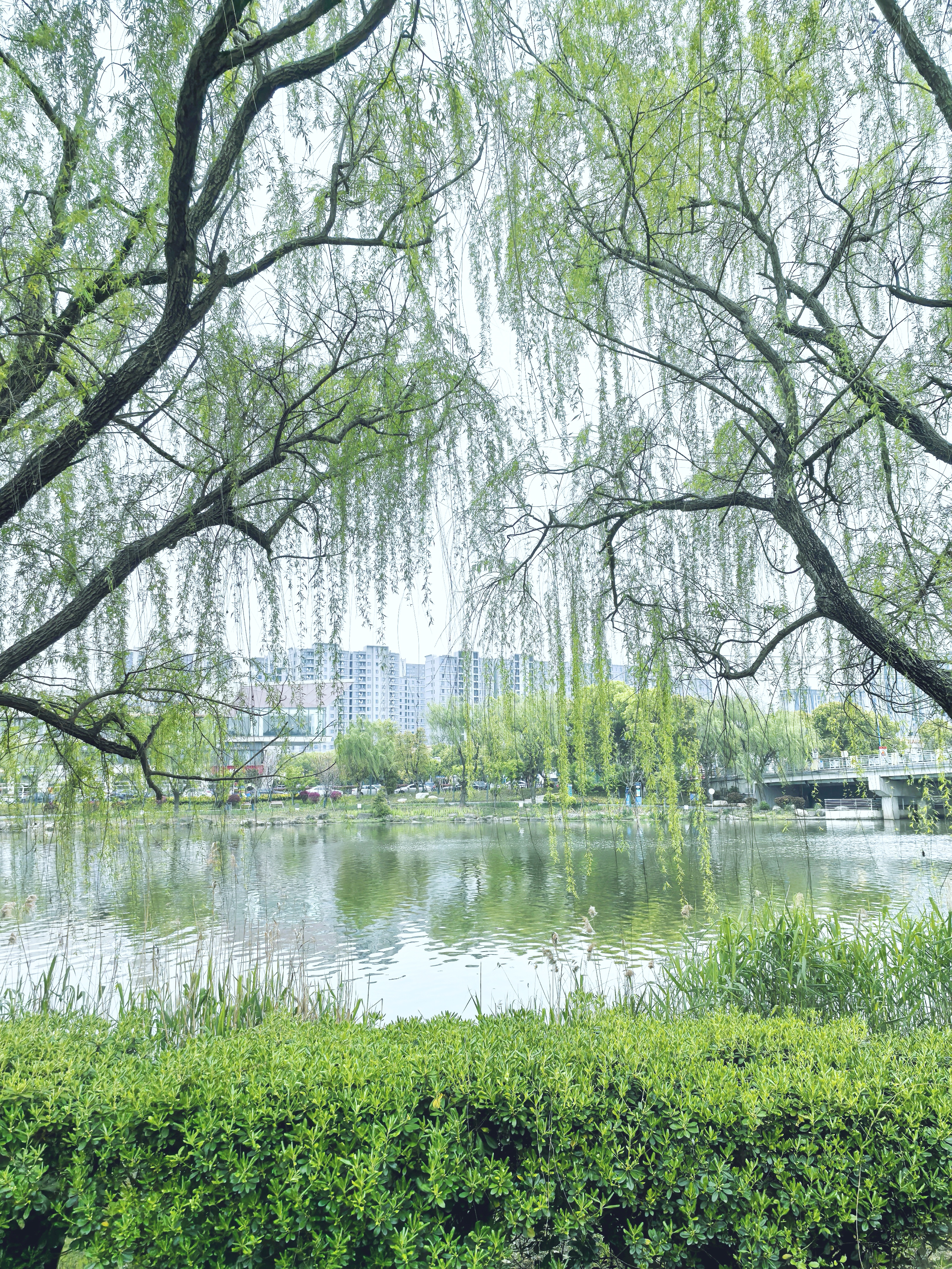 垂柳拂水,倒影摇曳,坐在长椅上静静欣赏