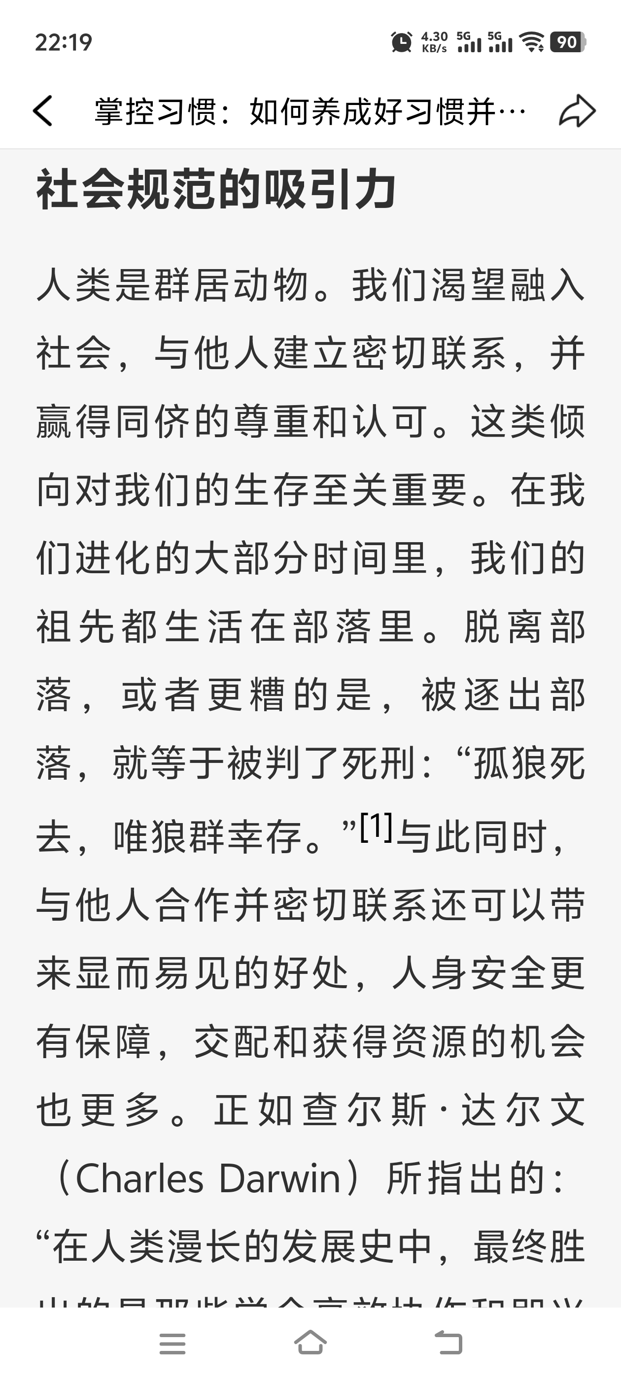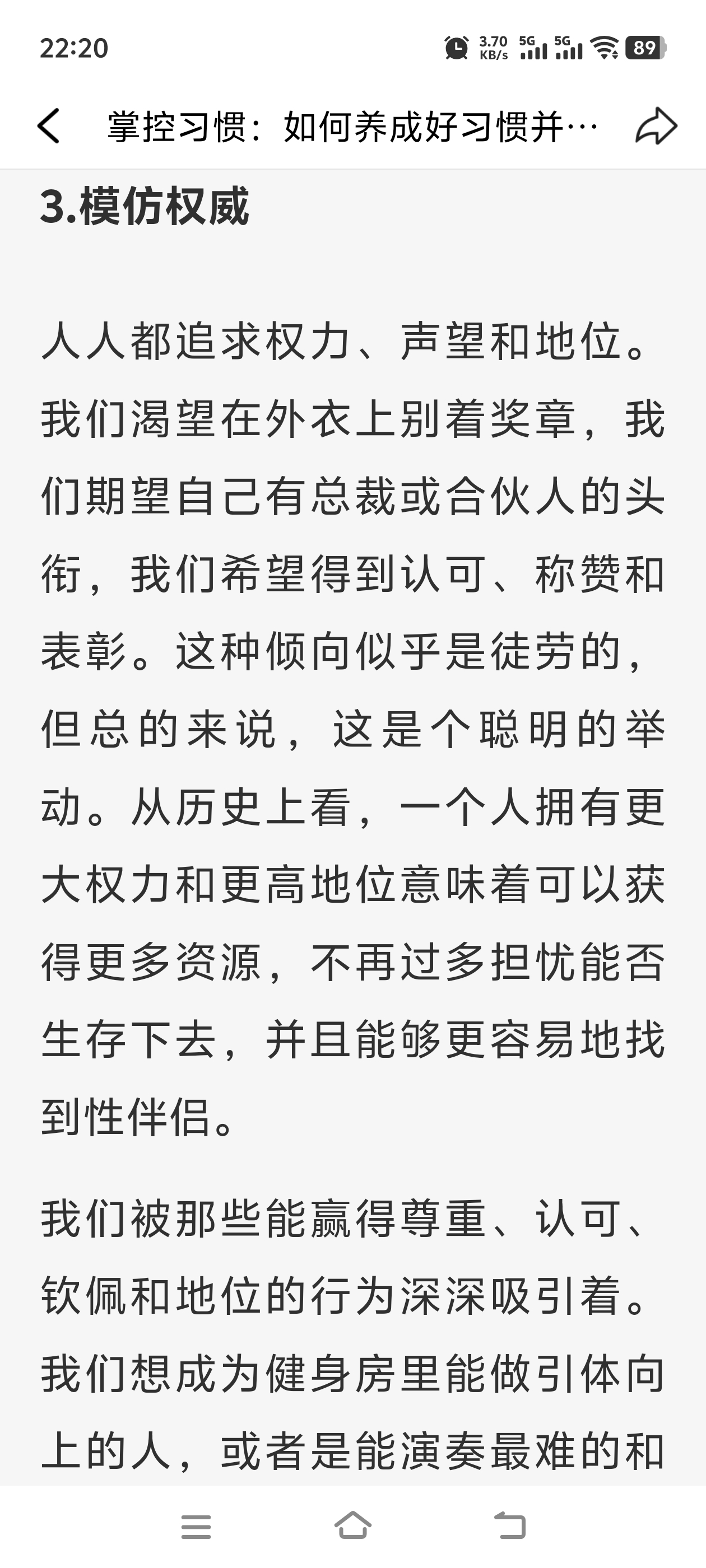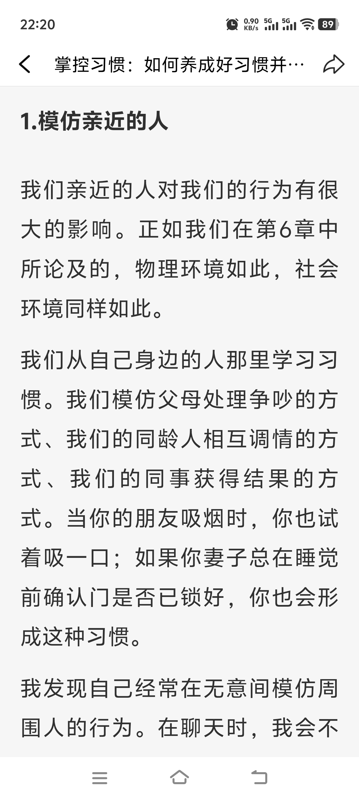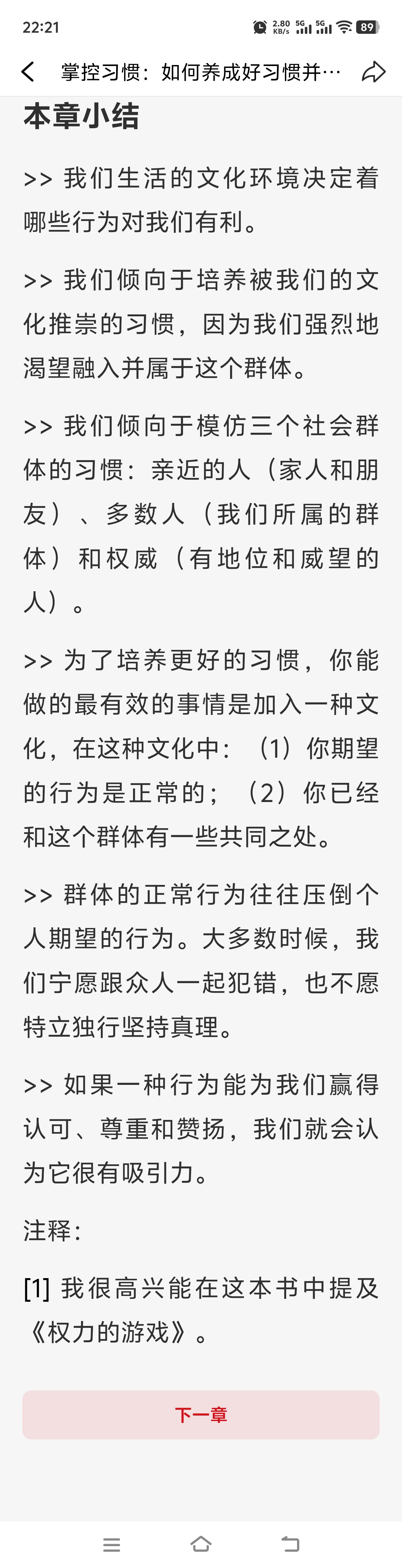 《掌控习惯》(Atomic Habits) 第9章 在习惯形成中亲友所起的作用 我们生活的文化环境决定着哪些行为对我们有利。 我们倾向于培养被我们的文化推崇的习惯,因为我们强烈地渴望融入并属于这个群体。 我们倾向于模仿三个社会群体的习惯:亲近的人(家人和朋友)、多数人(我们所属的群体)和权威(有地位和威望的人)。 为了培养更好的习惯,你能做的最有效的事情是加入一种文化,在这种文化中:(1)你期望的行为是正常的;(2)你已经和这个群体有一些共同之处。 群体的正常行为往往压倒个人期望的行为。大多数时候,我们宁愿跟众人一起犯错,也不愿特立独行坚持真理。 如果一种行为能为我们赢得认可、尊重和赞扬,我们就会认为它很有吸引力。
