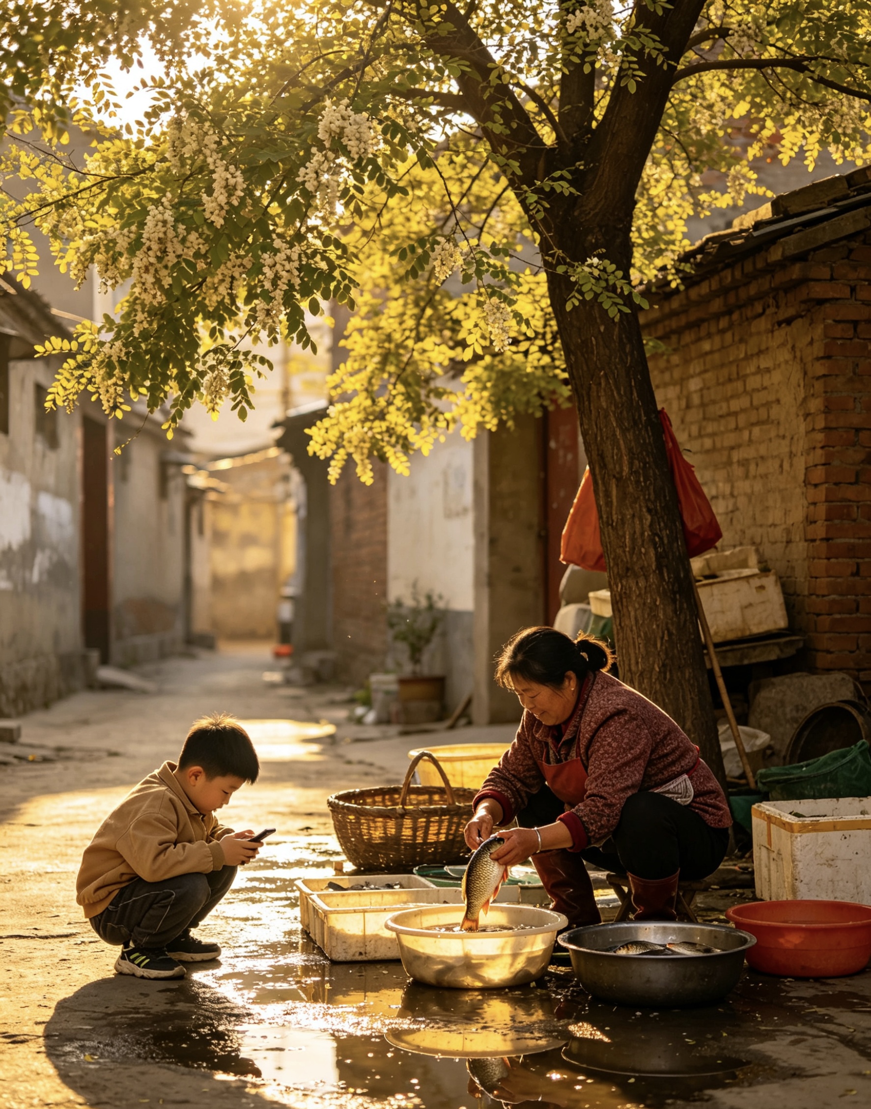 四月春日打卡的第一天,推开窗,发现春天换了副面孔。 三月的春天是热闹的,花赶着趟儿地开,你方唱罢我登场,轰轰烈烈的。四月的春天却安静下来——该开的花都开过了,该落的也落了,剩下的,是满世界的绿。 那棵泡桐树已经完全被叶子占领了。叶子从嫩绿变成了深绿,厚厚的,密密的,把天空遮得严严实实。树下落了一层东西——不是花,是细小的枝桠,大概是昨夜那场雨打断的。白发老太太蹲在那儿捡,一根一根地拾起来,码得整整齐齐。 “这是做什么用?”我问。 “晒干了,冬天烧炉子。”她抬头看我一眼,“春天掉下来的树枝,是最好的引火物。” 三月捡花,四月捡枝。树还是那棵树,人还是那个人,可做的事已经不一样了。春天就是这样,一个阶段有一个阶段的事,急不得,也慢不得。 巷口卖鱼的女人换了个位置。 天气热了,她把摊子挪到了巷口的槐树底下,有阴凉。水盆里的鱼也不一样了——三月的鱼瘦,一冬没怎么吃食;四月的鱼肥了,在水里扑腾得格外有力。 “春天快过完了。”我说。 “哪有,”她笑了,“四月才刚开始。春天还长着呢。” 她说着,从盆里捞出一条鲫鱼,在阳光下看了看,“你看这鱼,多精神。四月的鱼最好吃,不瘦不肥,刚刚好。” 她儿子今天也在,蹲在旁边看手机。忽然抬头说:“妈,下周学校有春游,我不回来了。” 女人愣了一下,手里的鱼差点滑出去。可她很快笑了:“去吧去吧,春天嘛,该玩就玩。我一个人忙得过来。” 她的声音很平静,可手上收拾鱼的动作明显慢了下来。一刀一刀的,像是舍不得把这条鱼收拾完。 河边,钓鱼的老人换了个姿势。 天气热了,他不再坐在太阳底下,而是挪到了柳树下。柳条垂下来,正好给他搭了个凉棚。他的保温杯也换了,从保温的换成了凉茶的,杯壁上凝着一层细细的水珠。 “四月了。”我走过去。 “是啊,”他指指河面,“你看,水也变了。” 我看去,河水确实不一样了。三月的河水浑黄浑黄的,带着上游的泥沙;四月的河水清了,能看见水面下几尺深的地方,有水草在摇。 “鱼也不一样了。”他说,“三月的鱼懒,在水底不爱动;四月的鱼活了,到处游,到处找食。” 他甩出鱼线,动作比三月时快了些。“人也一样,三月还缩着,四月就舒展了。” 我在他旁边坐下,阳光从柳叶缝里漏下来,落在身上暖洋洋的,不晒,正好。 那条窄巷里的杏树,已经完全变了样。 花没了,果也没了——杏子早摘光了。现在满树都是叶子,绿得发亮,厚厚实实的,把院子遮得阴凉。老太太把竹椅搬到了树荫底下,坐着择菜。老头还是躺在旁边,可收音机不开了,说天热了,听着心烦。 “四月了,该吃新东西了。”老太太看见我,从屋里端出一碗绿豆汤,“尝尝,今年新绿豆。” 汤是凉的,放了冰糖,甜丝丝的,喝下去从喉咙一直凉到胃里。我端着碗,看头顶的杏树叶在风里轻轻摇,忽然觉得,四月也很好。 “杏子没了,可绿豆下来了。”老太太说,“每个季节有每个季节的吃食。春天不光是花,还有豆,还有笋,还有鱼。” 她顿了顿,又说:“你们这些打卡的,三月打完了四月还打,不累啊?” 我笑了:“不累。春天的事,怎么会累。” 那片拆迁地,现在彻底变了样。 地基打好了,钢筋水泥的框架立起来了。工人们在上面忙碌着,叮叮当当的,热闹得很。曾经的油菜花、曾经疯长的野草、曾经在废墟上跳舞的蜜蜂,都成了记忆。 我在围挡外面站了一会儿,看见围挡上贴着一张告示,上面写着“某某商业中心”,预计明年春天开业。 明年春天。又是春天。 傍晚回家,巷子里飘着和三月不一样的饭菜香。 蒜苔炒腊肉、蚕豆炒鸡蛋、凉拌莴笋……都是四月的东西。那浓烈的香椿味淡了,换成了清新的豆香。春天在换菜,也在换味道。 泡桐树下,白发老太太已经不在了。可树下放着一个小板凳,凳子上放着一把剪刀。大概是明天还要来,懒得拿回去了。 我站在树下,听着头顶叶子沙沙的响声,想着这二十一天的故事。三月过去了,可四月来了。花落了,可叶子长了。杏子摘了,可绿豆熟了。 春天不是一条直线,是一个圆。三月的花开完了,四月的叶子上场;四月的叶子长够了,五月的果实在等着。它一圈一圈地转着,转到最后,又回到起点。 打开笔记本,翻到新的一页。第二期打卡,第一天。 窗外传来笛声。还是那个邻居,还是那首《茉莉花》。可今天他吹得快了些,调子轻快明亮,像是在庆祝什么——庆祝四月来了,庆祝春天还在,庆祝那些三月的故事,四月还在继续。 我趴在窗台上听,忽然想起钓鱼老人的话:“四月,人就舒展了。” 是的,三月还在缩着,四月就舒展了。那些花、那些人、那些故事,都在四月里舒展开来,变成另一种样子。 明天,四月春日打卡第二天。春天还在,日子还长。 (注:故事经过艺术加工和模糊化处理,部分图片为AI制作~)