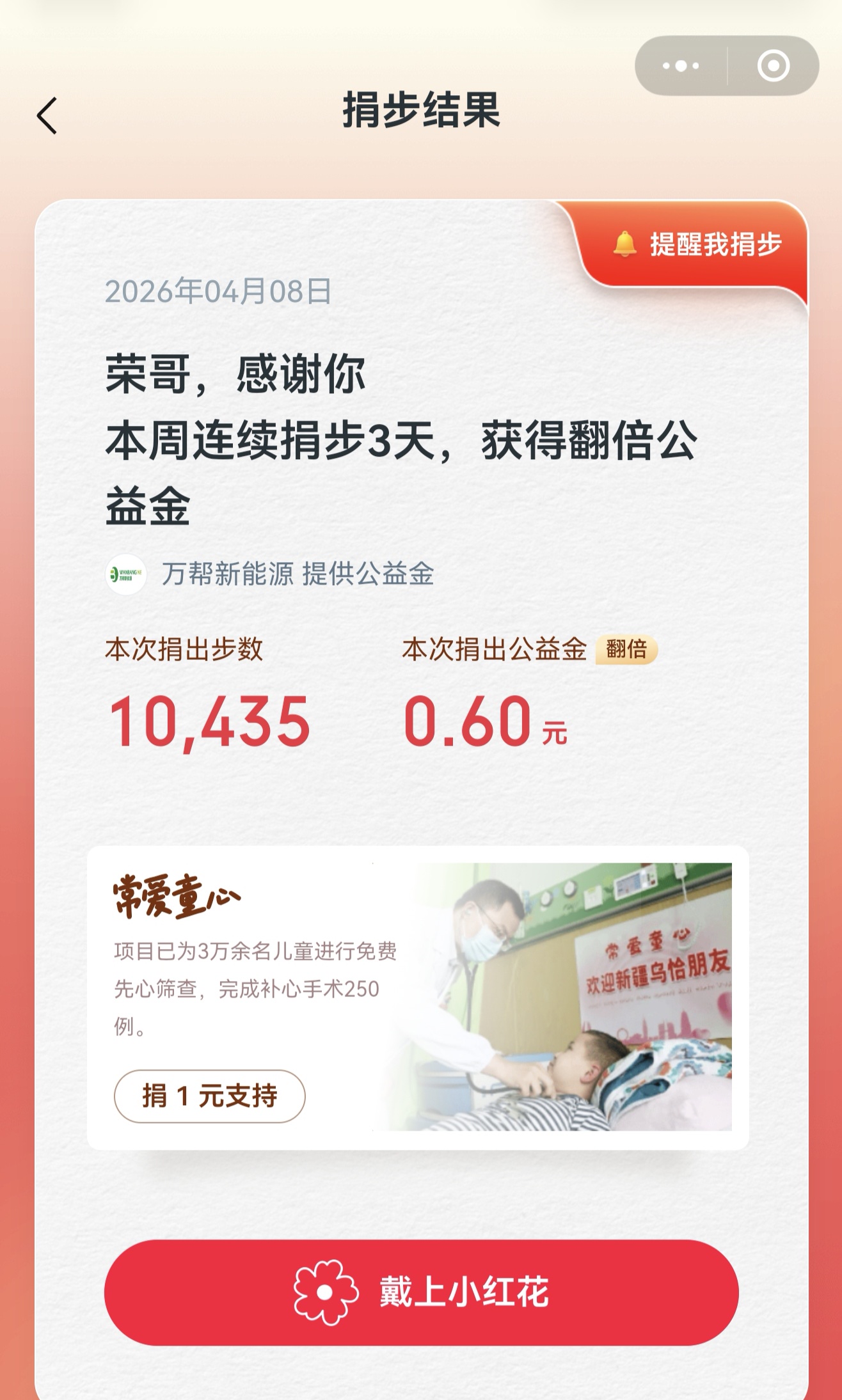 本周连续捐步3天,步数成功翻倍公益金~ 小小步数汇聚爱心,每一步都有温度,感谢万帮新能源支持,让善意持续发光✨