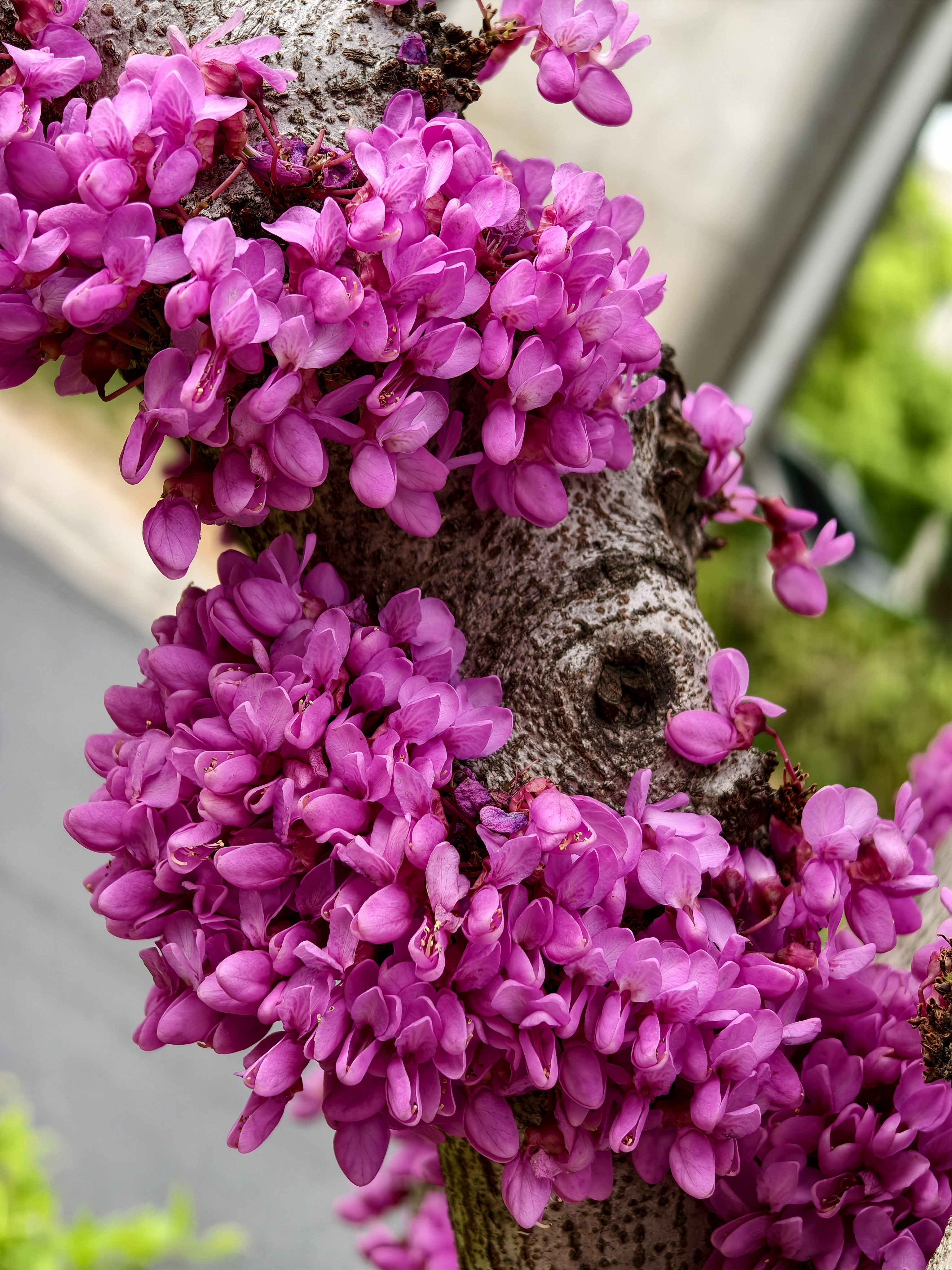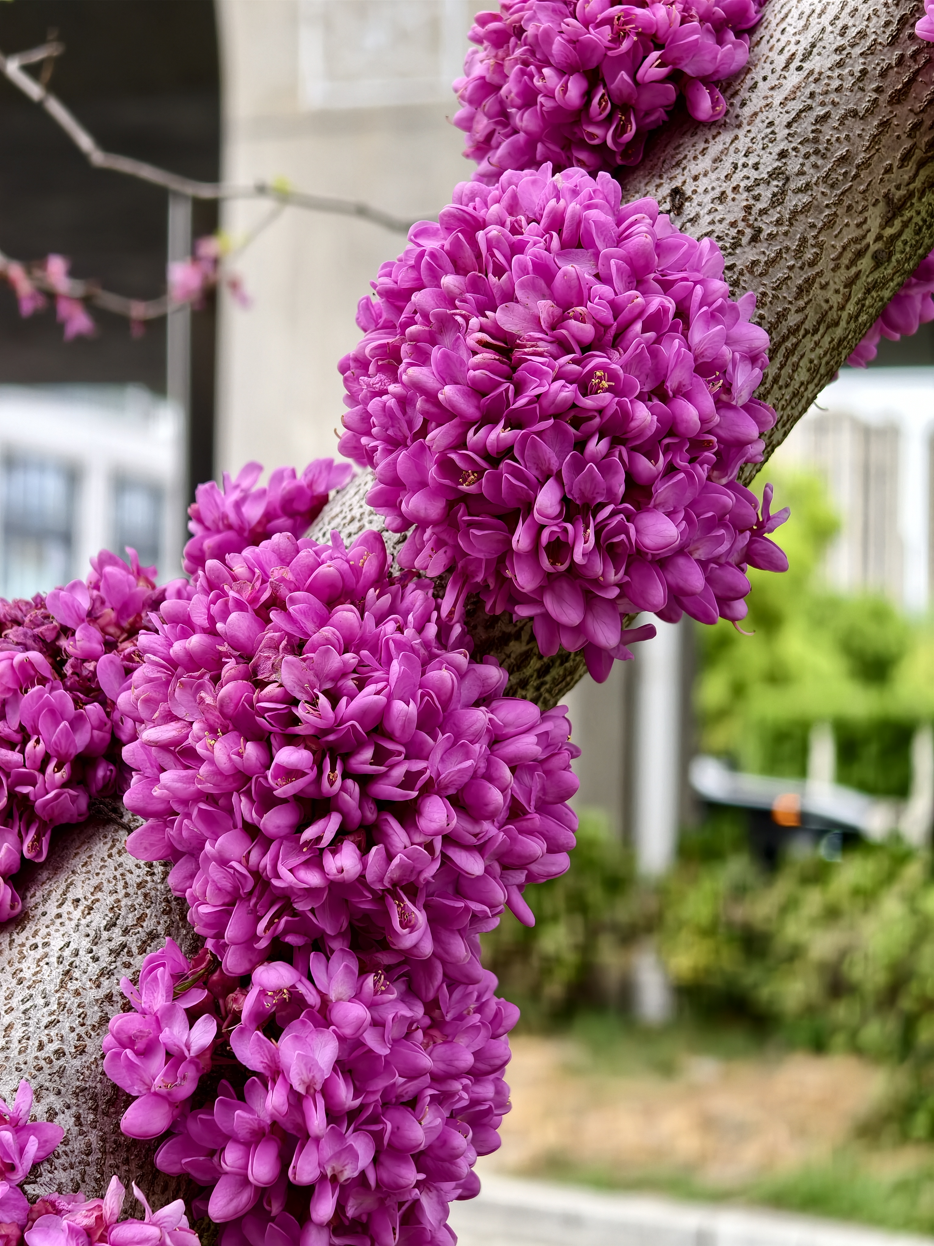 紫荆攀上老枝,紫雾浮于春光里;树皮刻着岁月,花簇燃尽寒意——原来最深的春,开在粗粝的静默中。