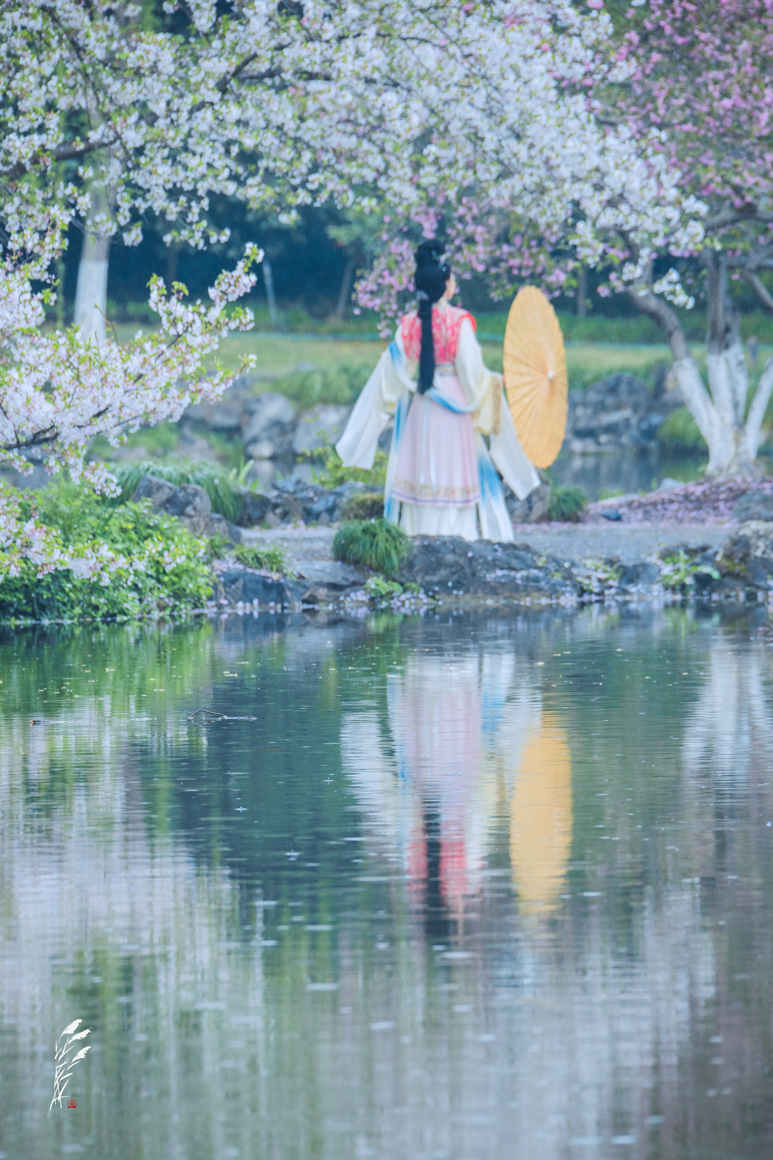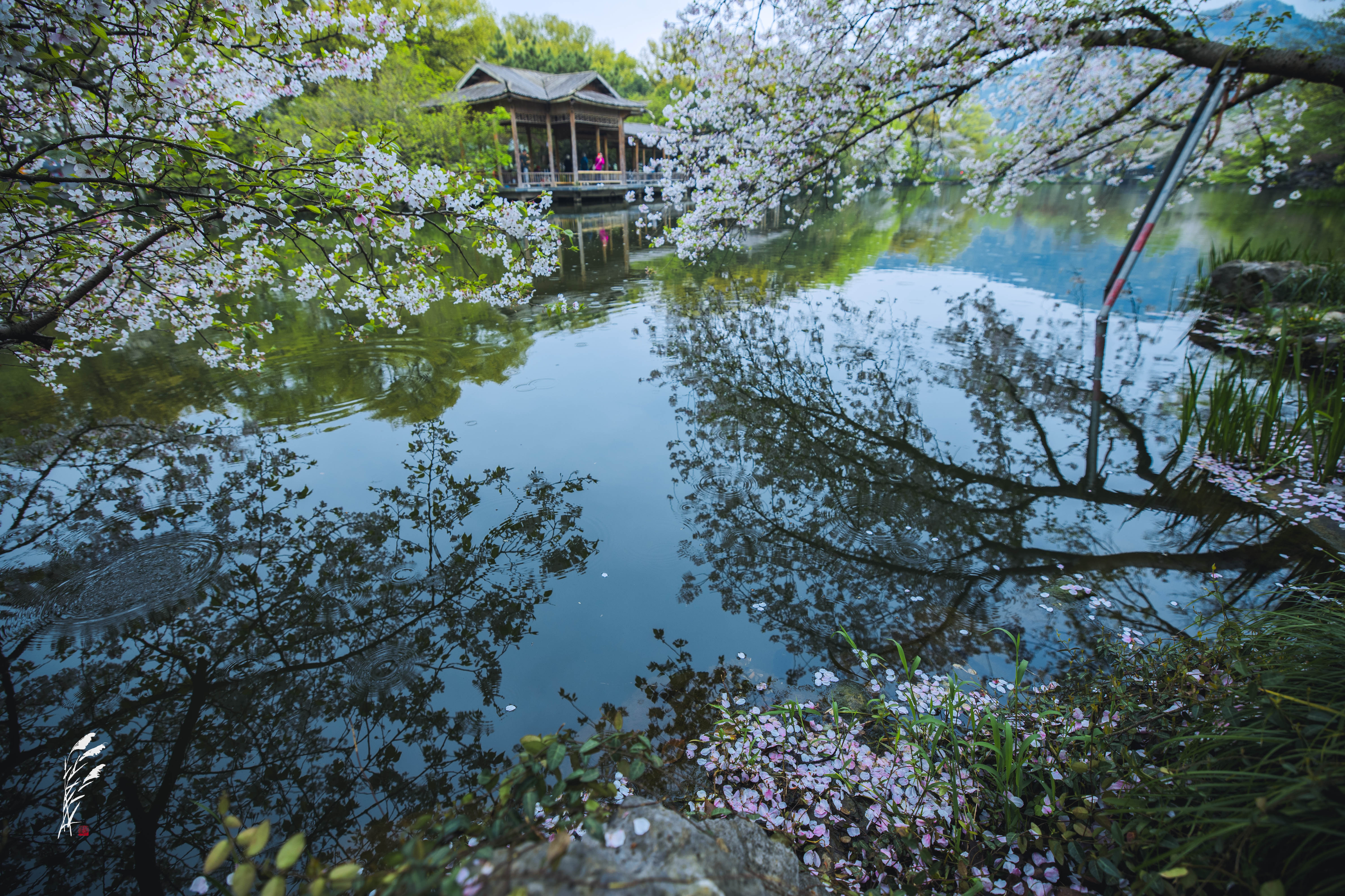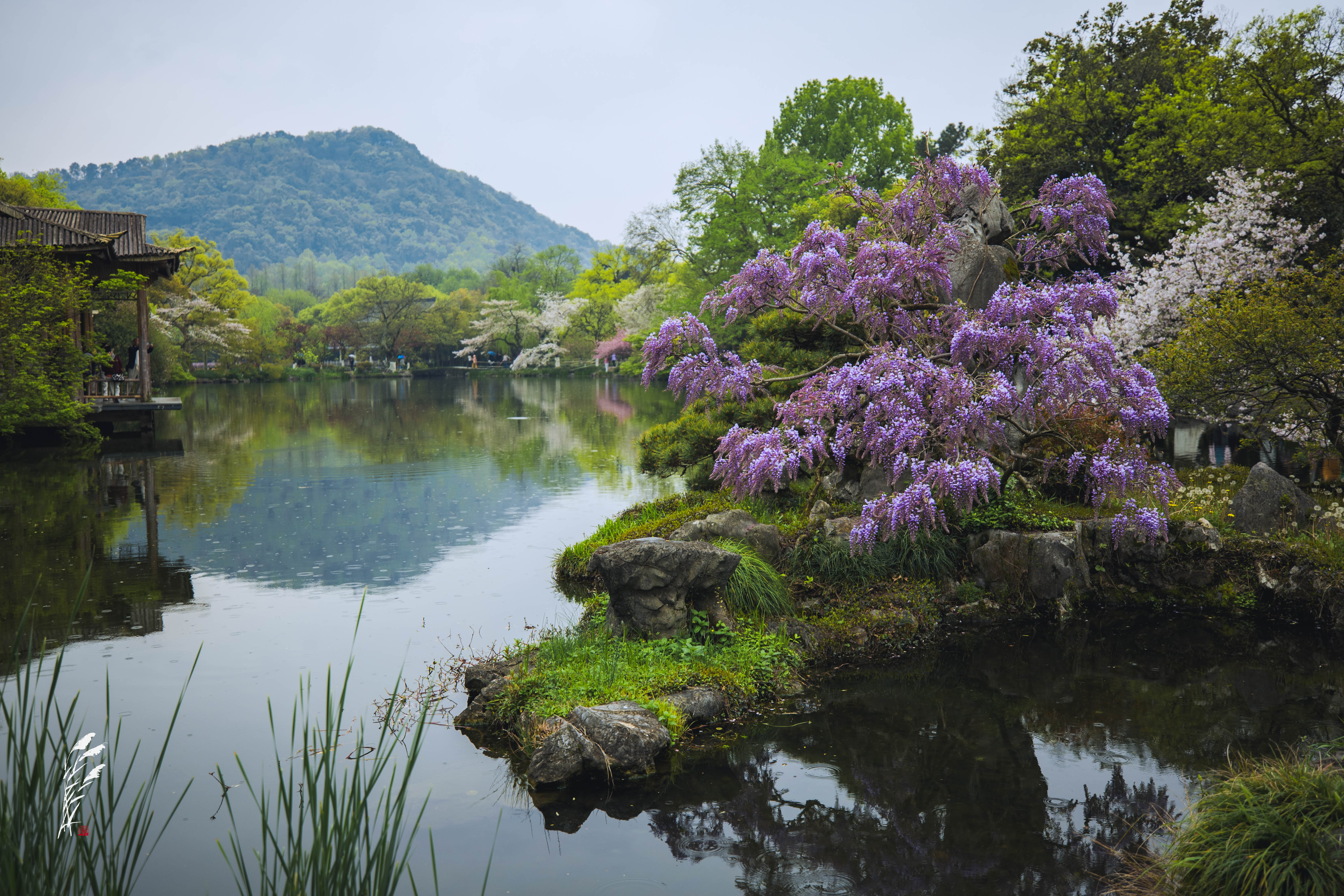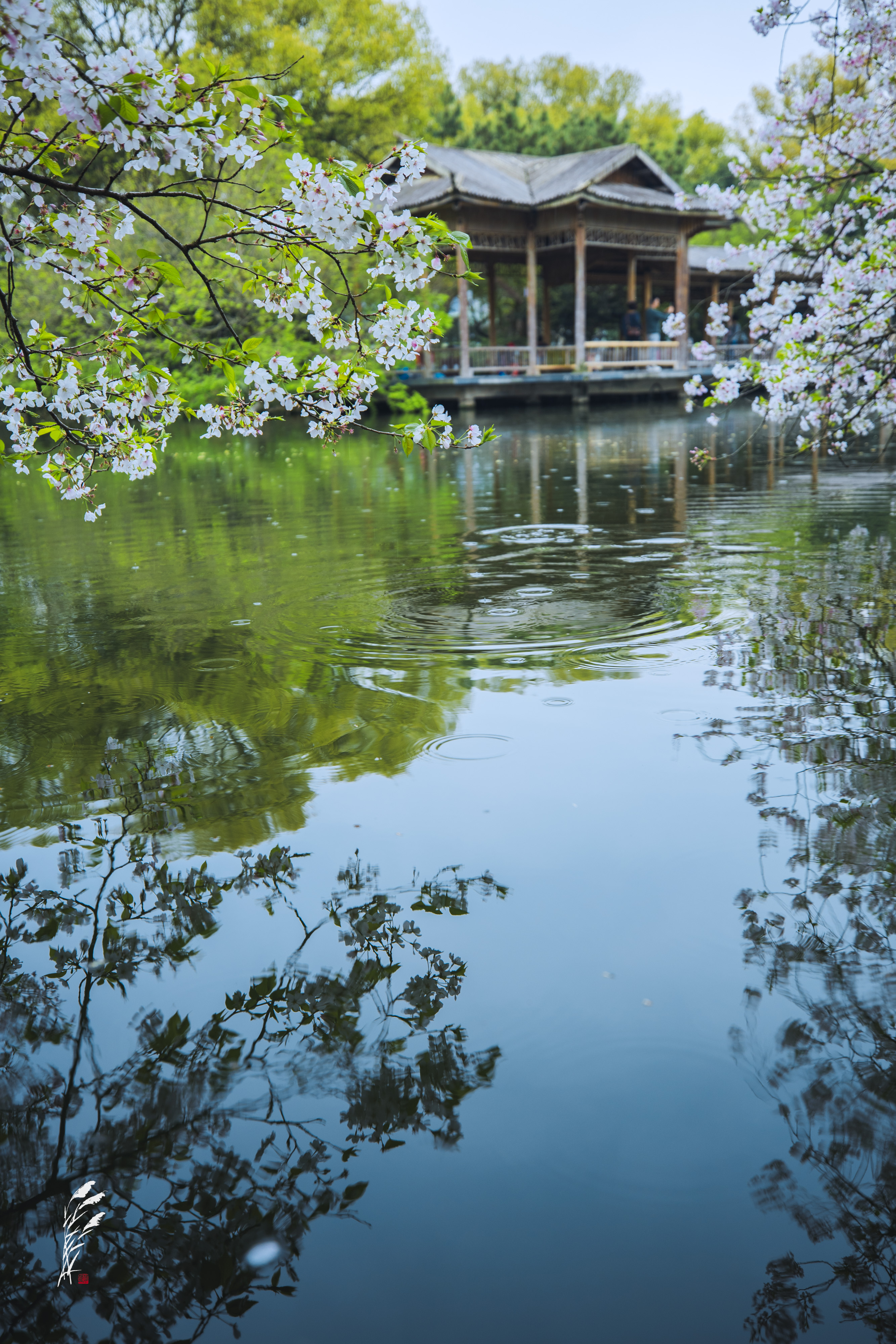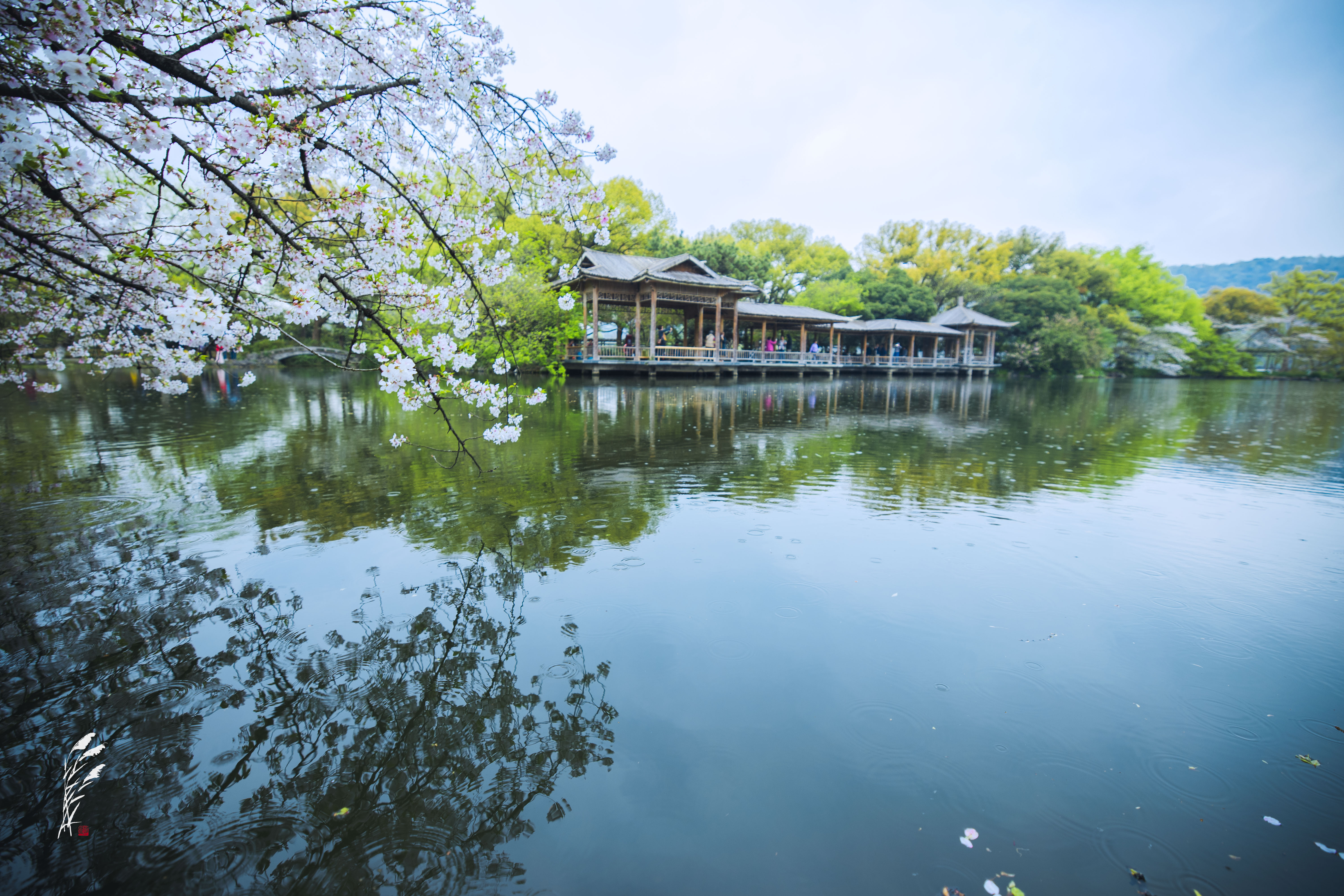 樱雨落香径,春波戏游鱼。 花港观鱼,雨意盈盈。 一湖烟雨朦胧,万般温柔皆在水中。