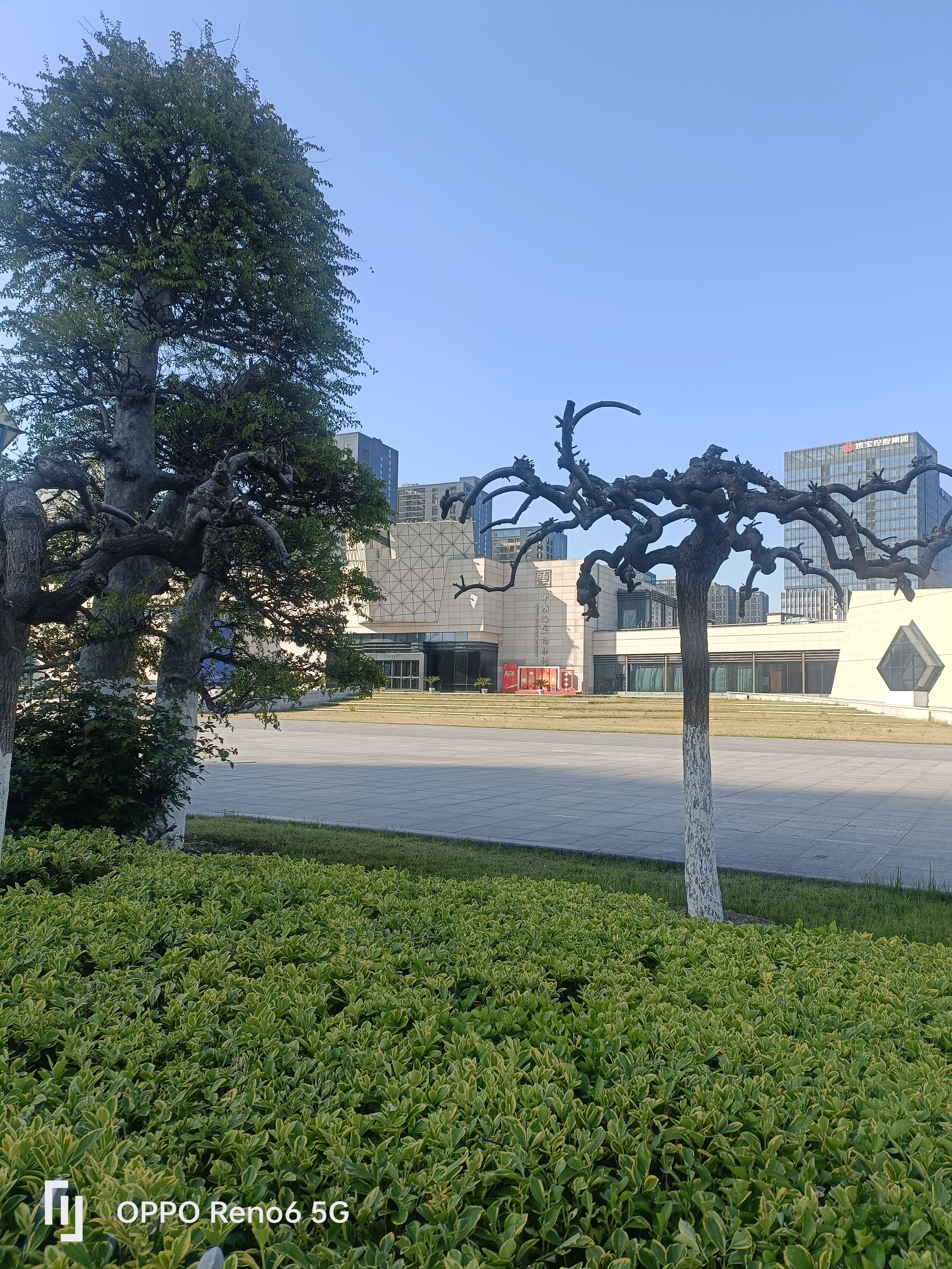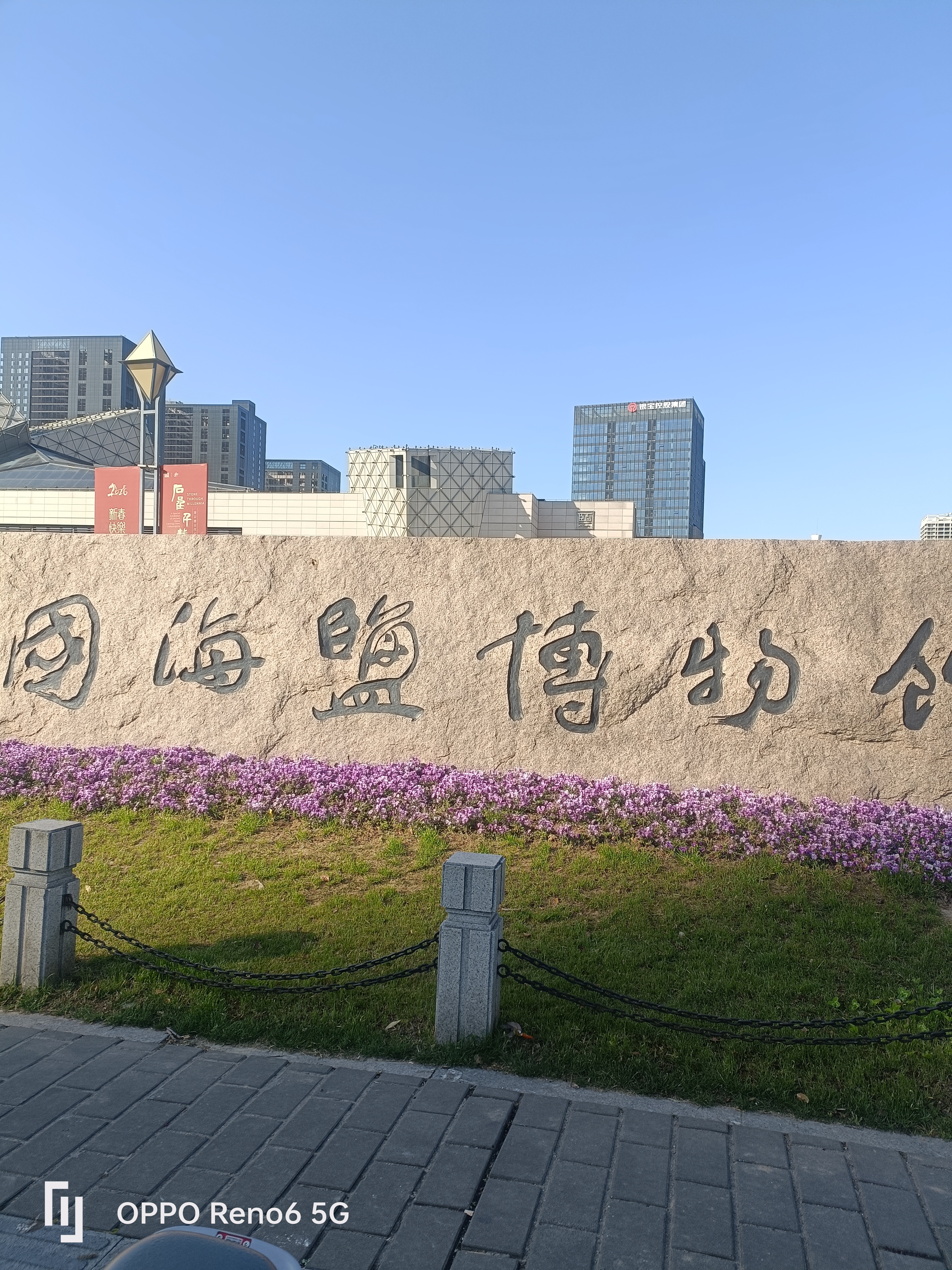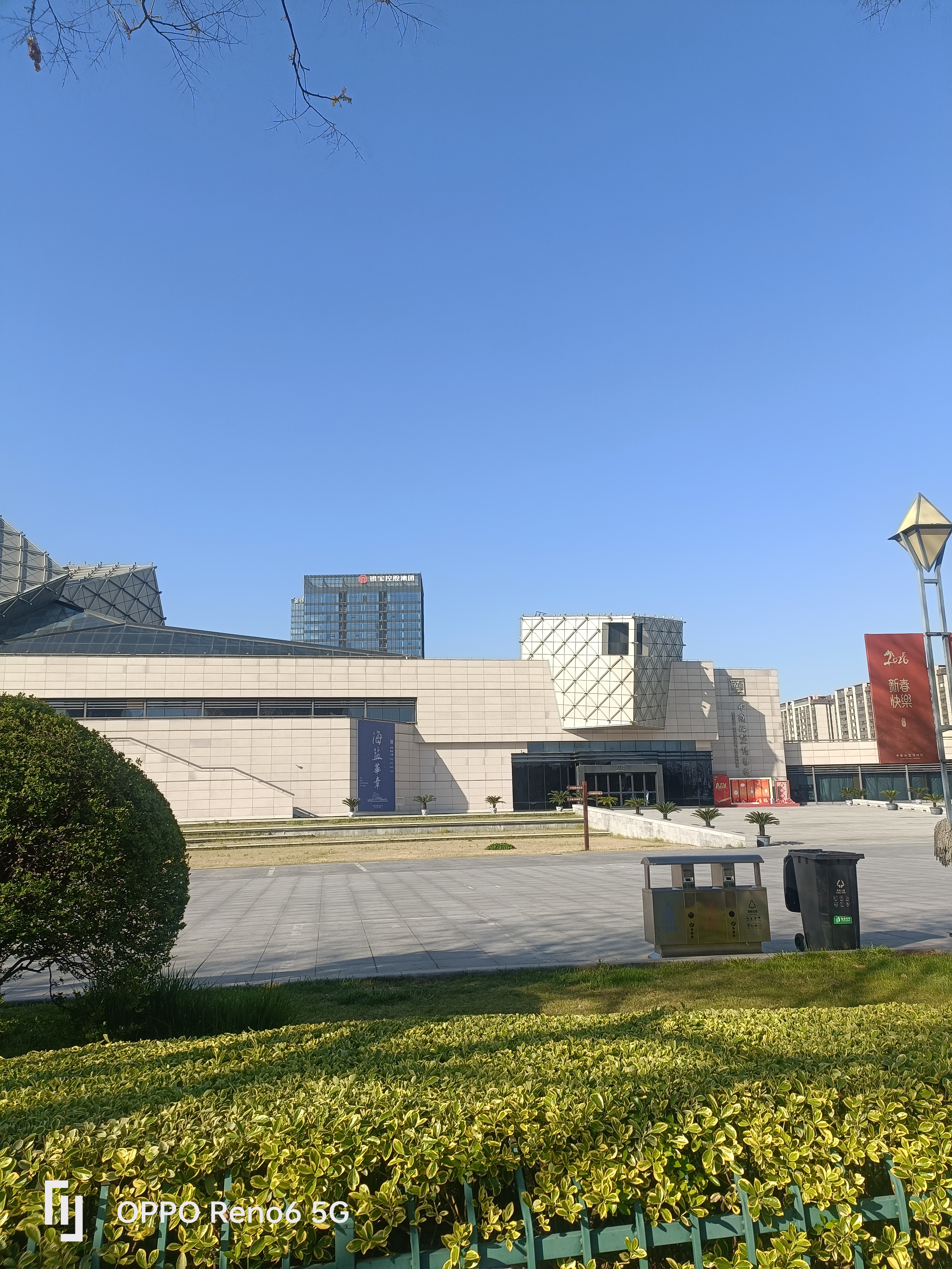 中国海盐博物馆前,现代建筑与蓝天相映,广场绿意盎然,紫花点缀其间,OPPO Reno6 5G定格新春城市人文景致。
