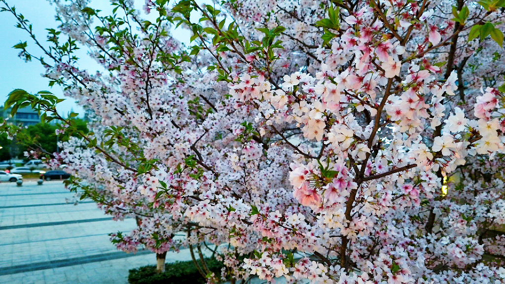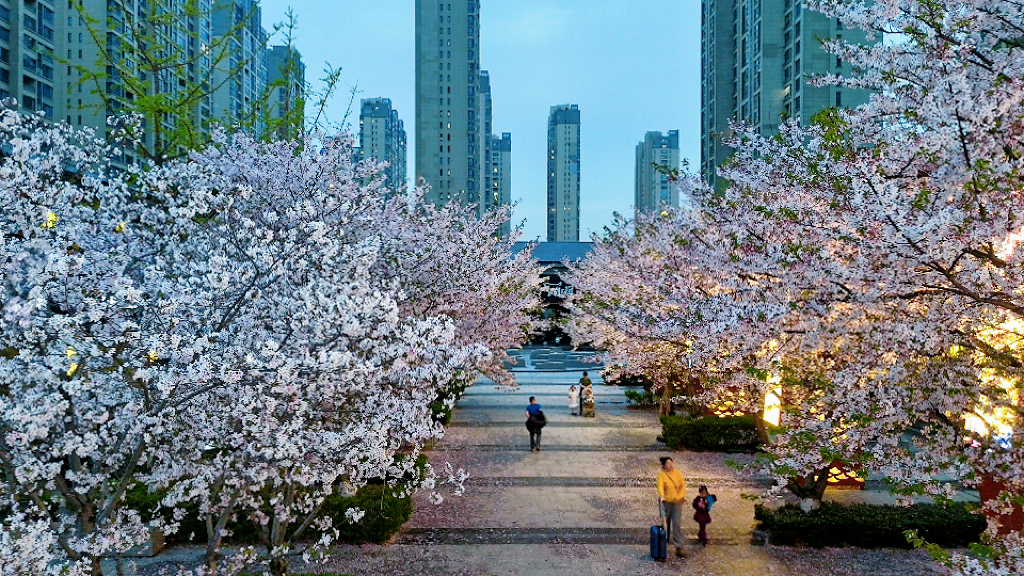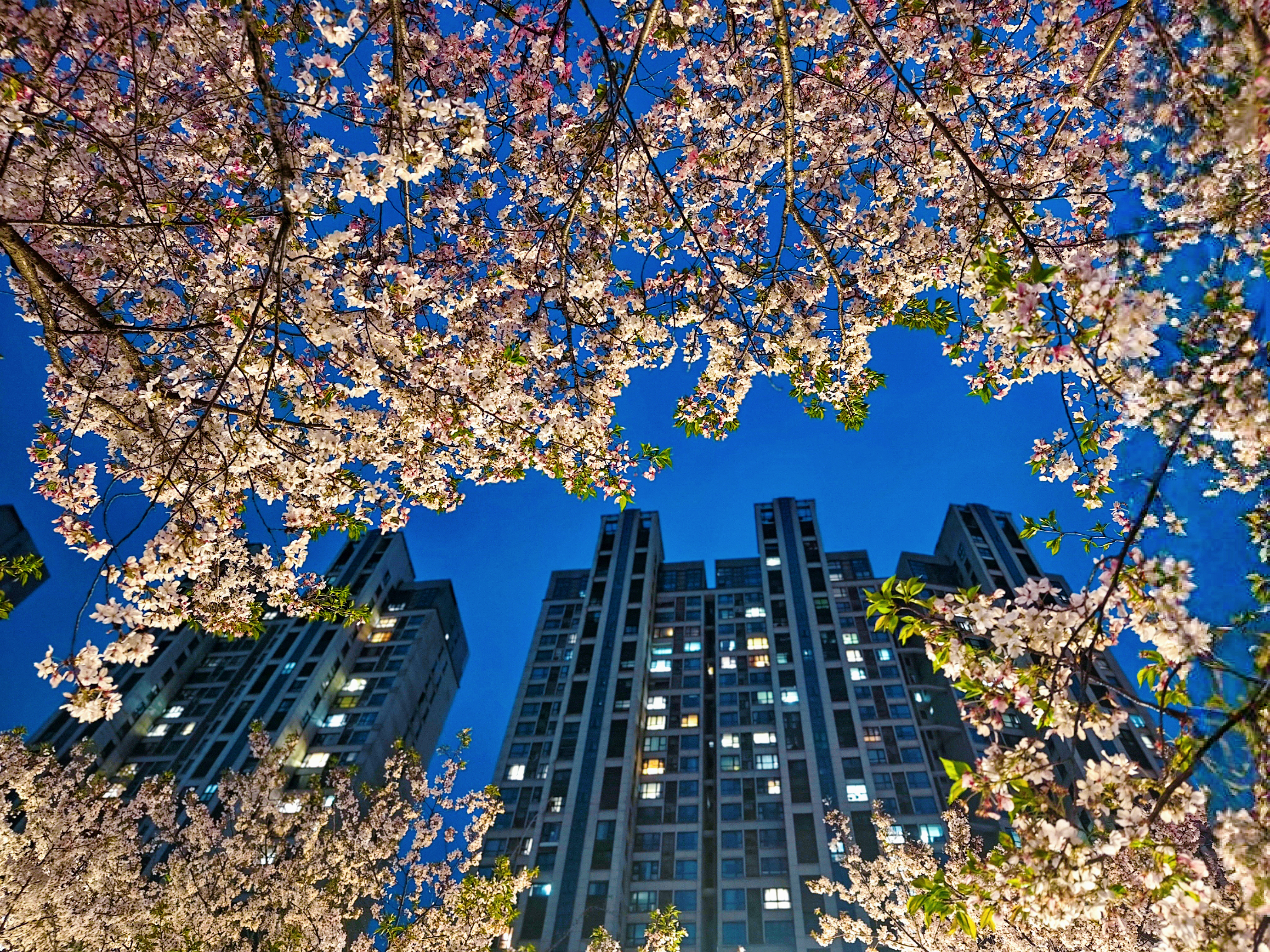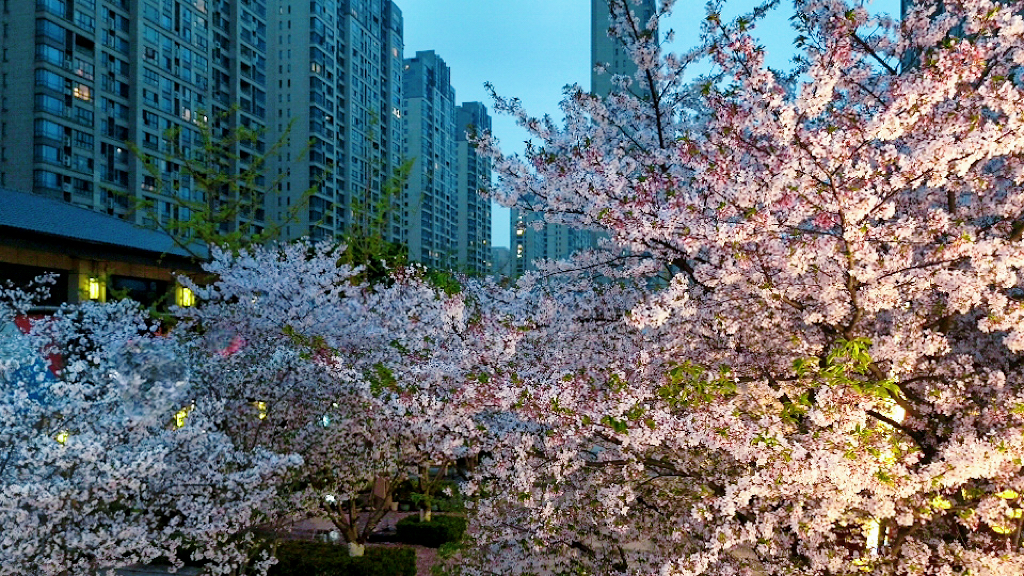 暮色沉蓝时,小区里的樱花凝作温柔粉雾,灯影与花光交织,酿成春日最浪漫的梦。