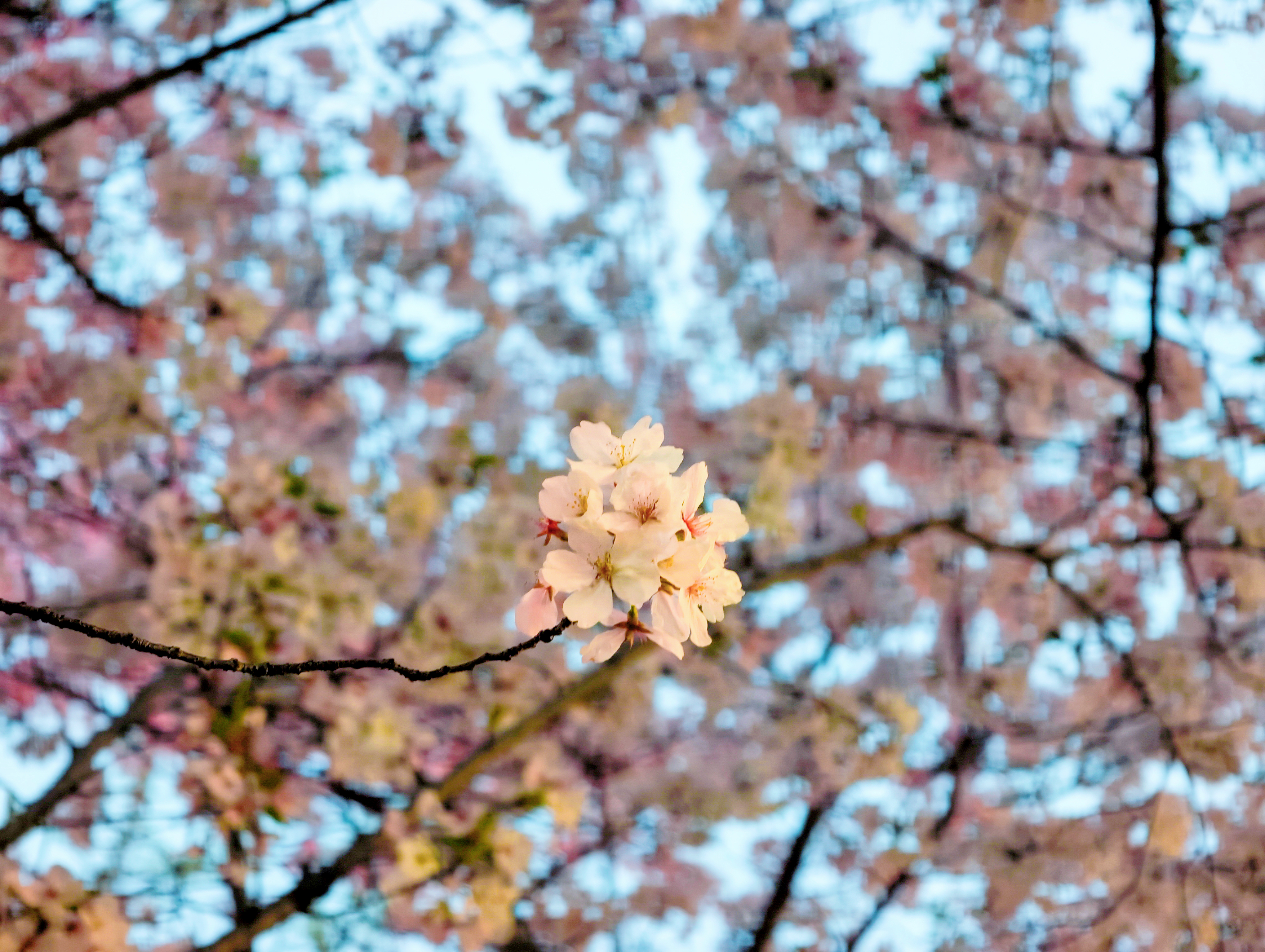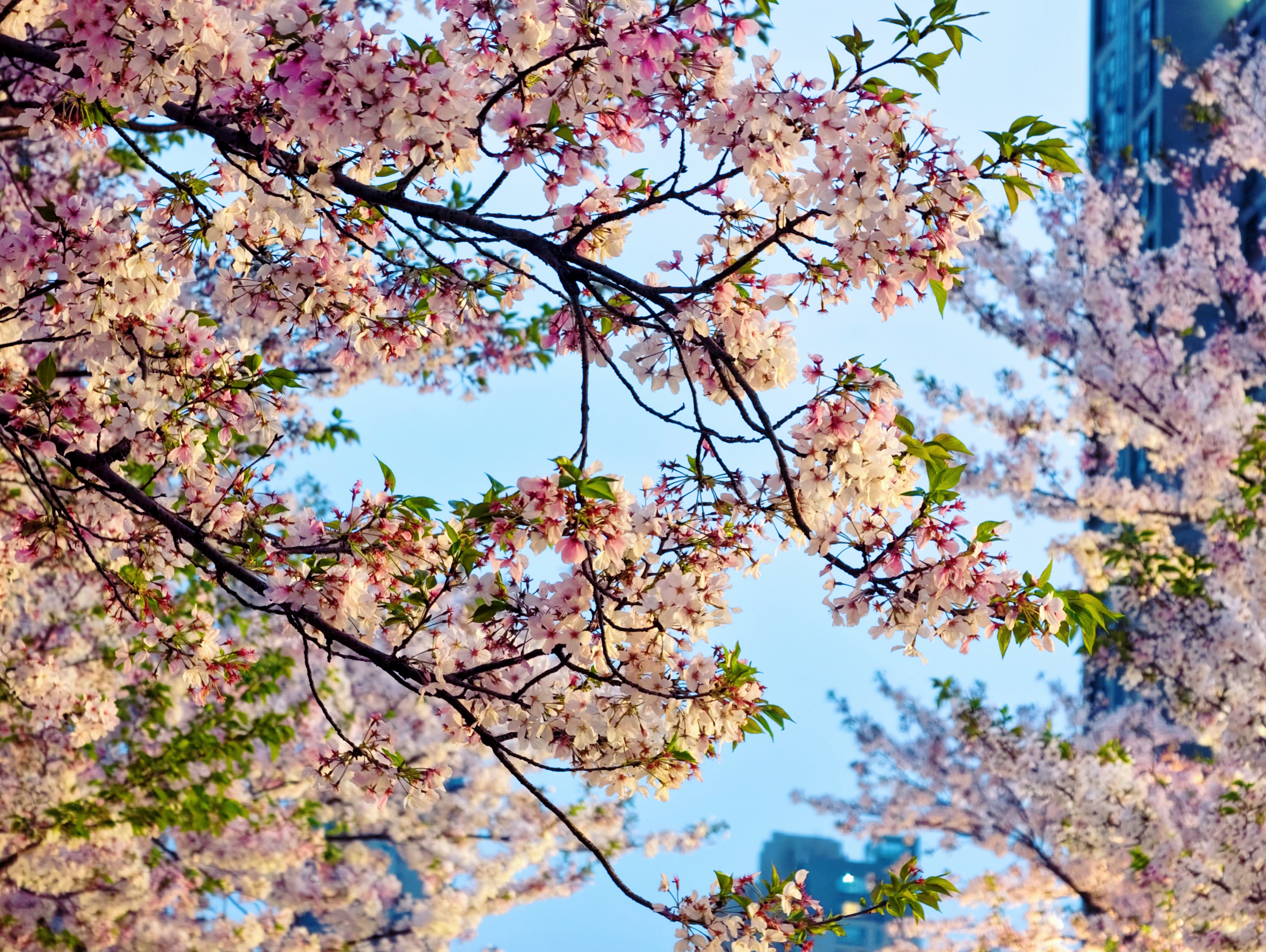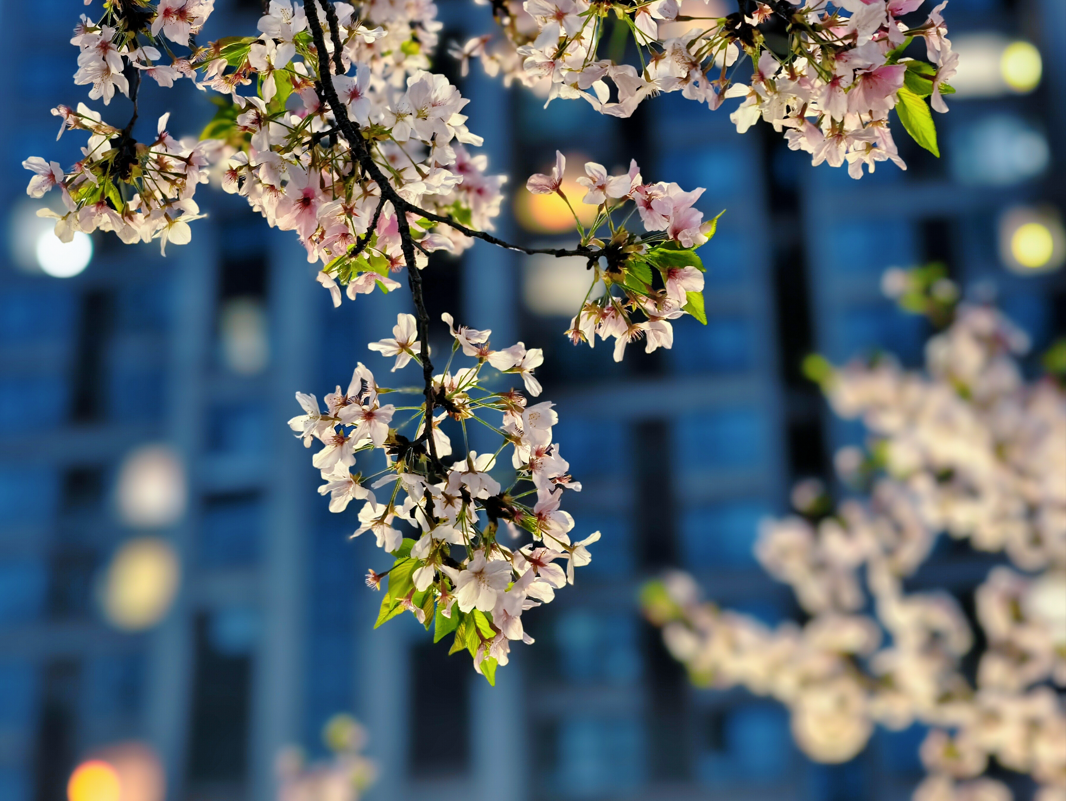 暮色沉蓝时,小区里的樱花凝作温柔粉雾,灯影与花光交织,酿成春日最浪漫的梦。