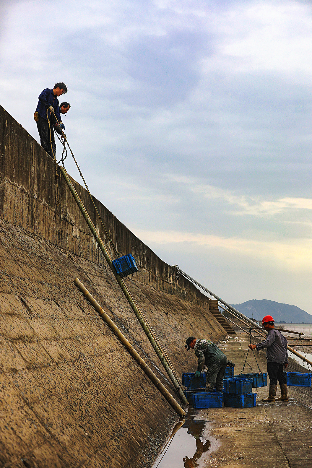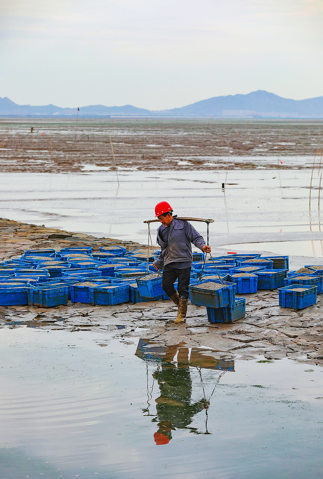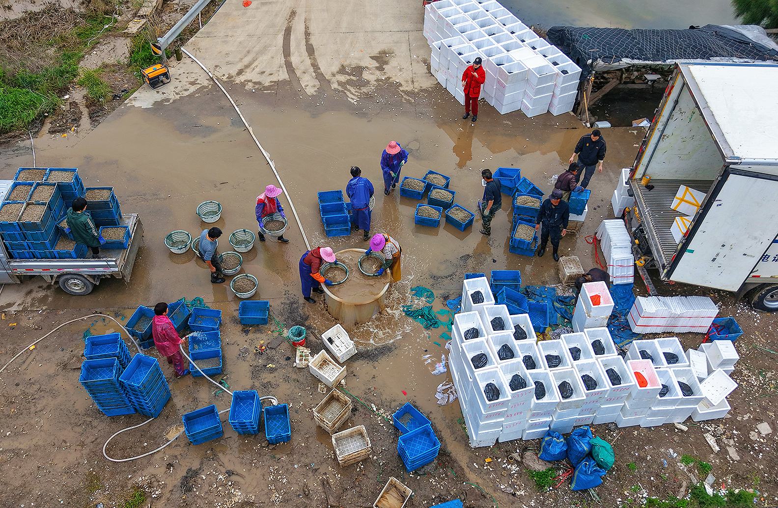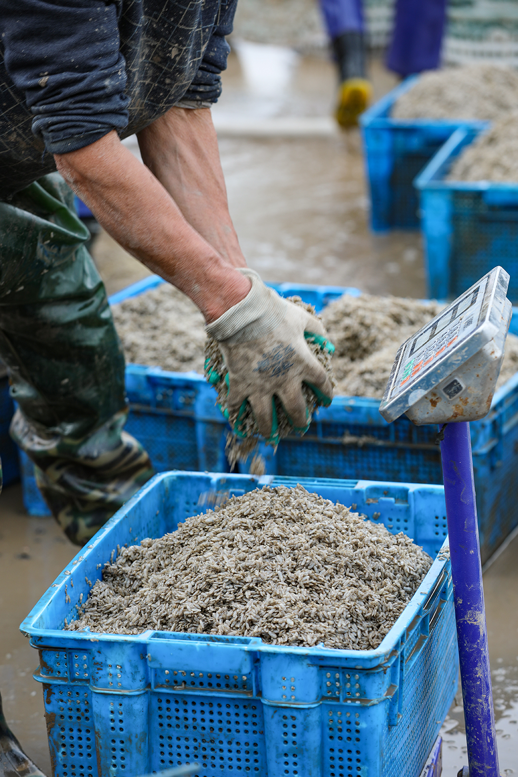 温岭市东浦新塘的蛏苗丰收。在海涂养殖基地上把蛏苗陶过来,运到塘岸边,挑到塘脚,用绳子拉到堤坝上,然后又挑到装运处(也有用无人机直接运的)。然后清洗,过称,打包(箱内放冰),运往大连等地。