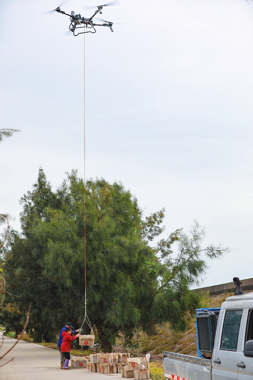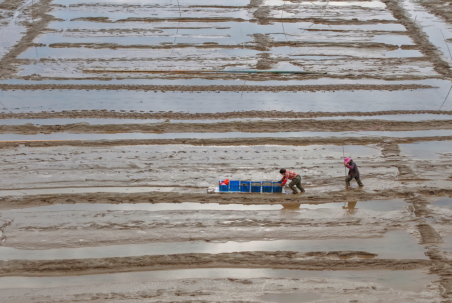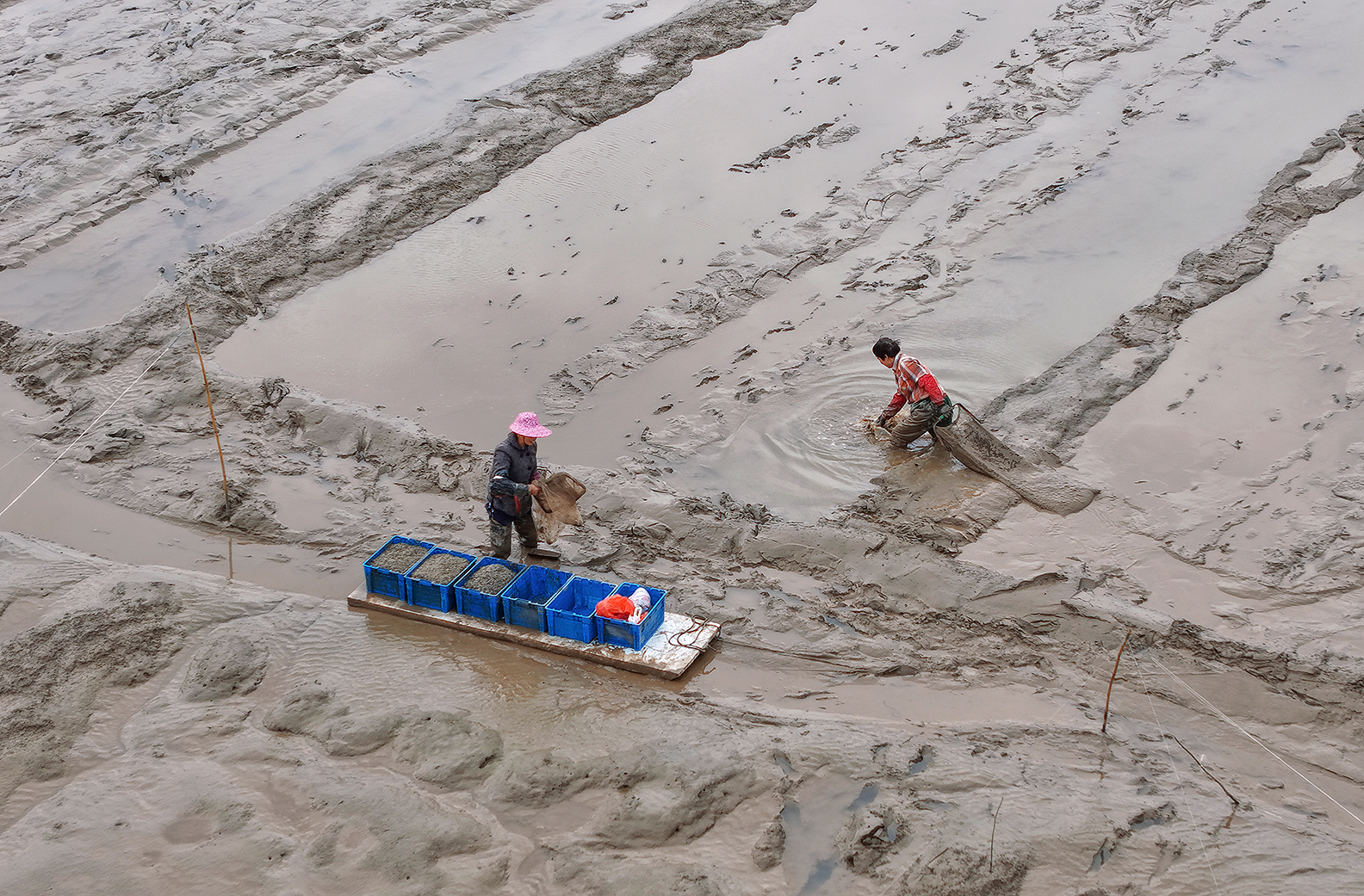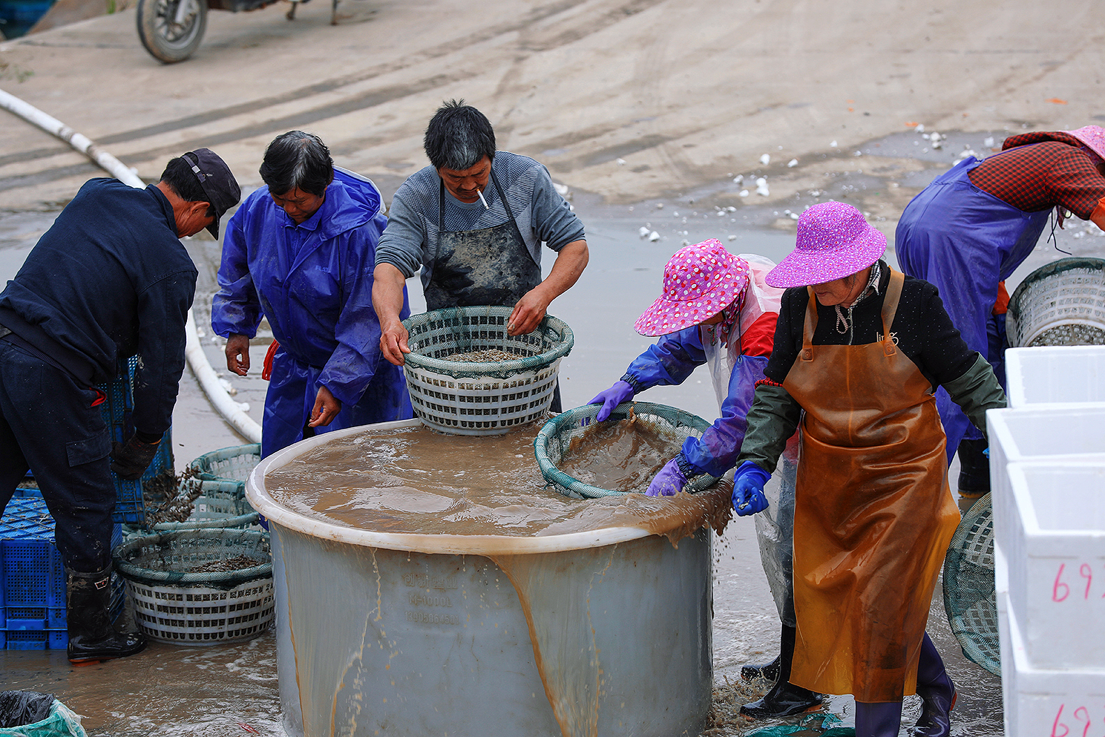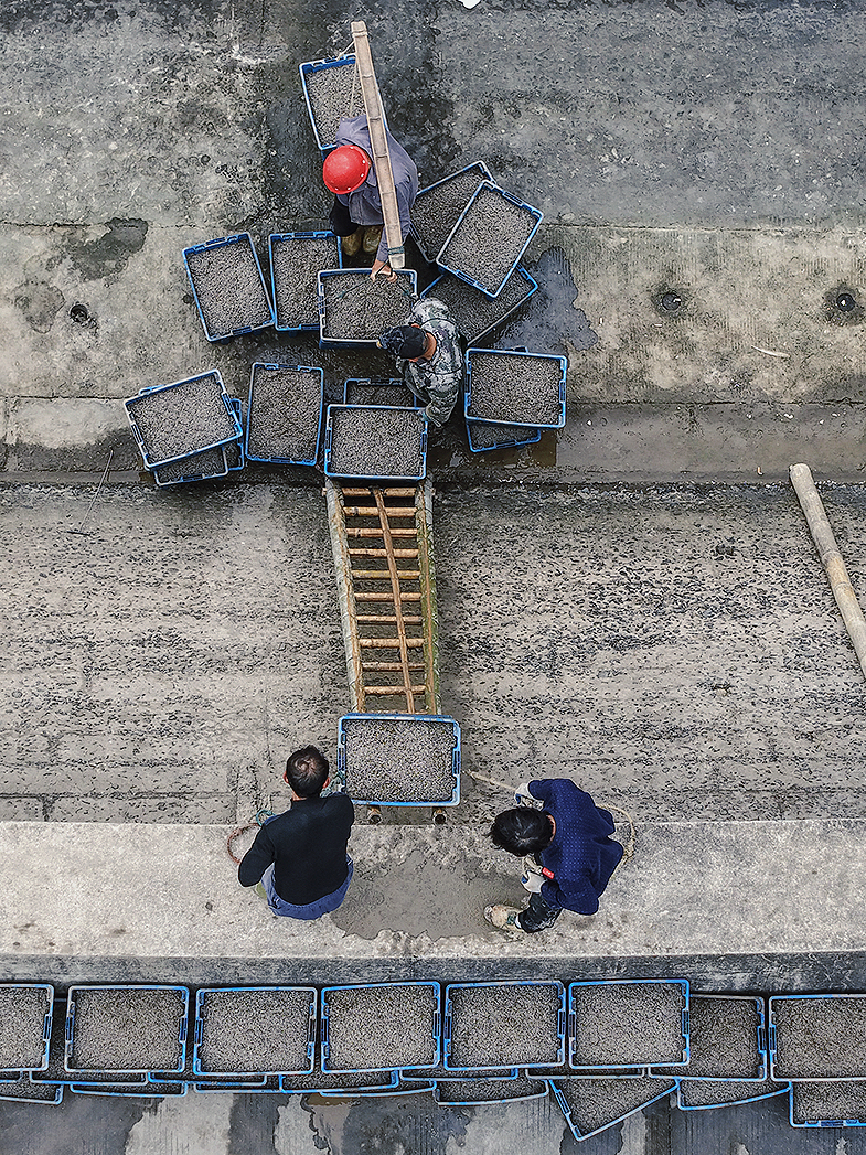 温岭市东浦新塘的蛏苗丰收。在海涂养殖基地上把蛏苗陶过来,运到塘岸边,挑到塘脚,用绳子拉到堤坝上,然后又挑到装运处(也有用无人机直接运的)。然后清洗,过称,打包(箱内放冰),运往大连等地。