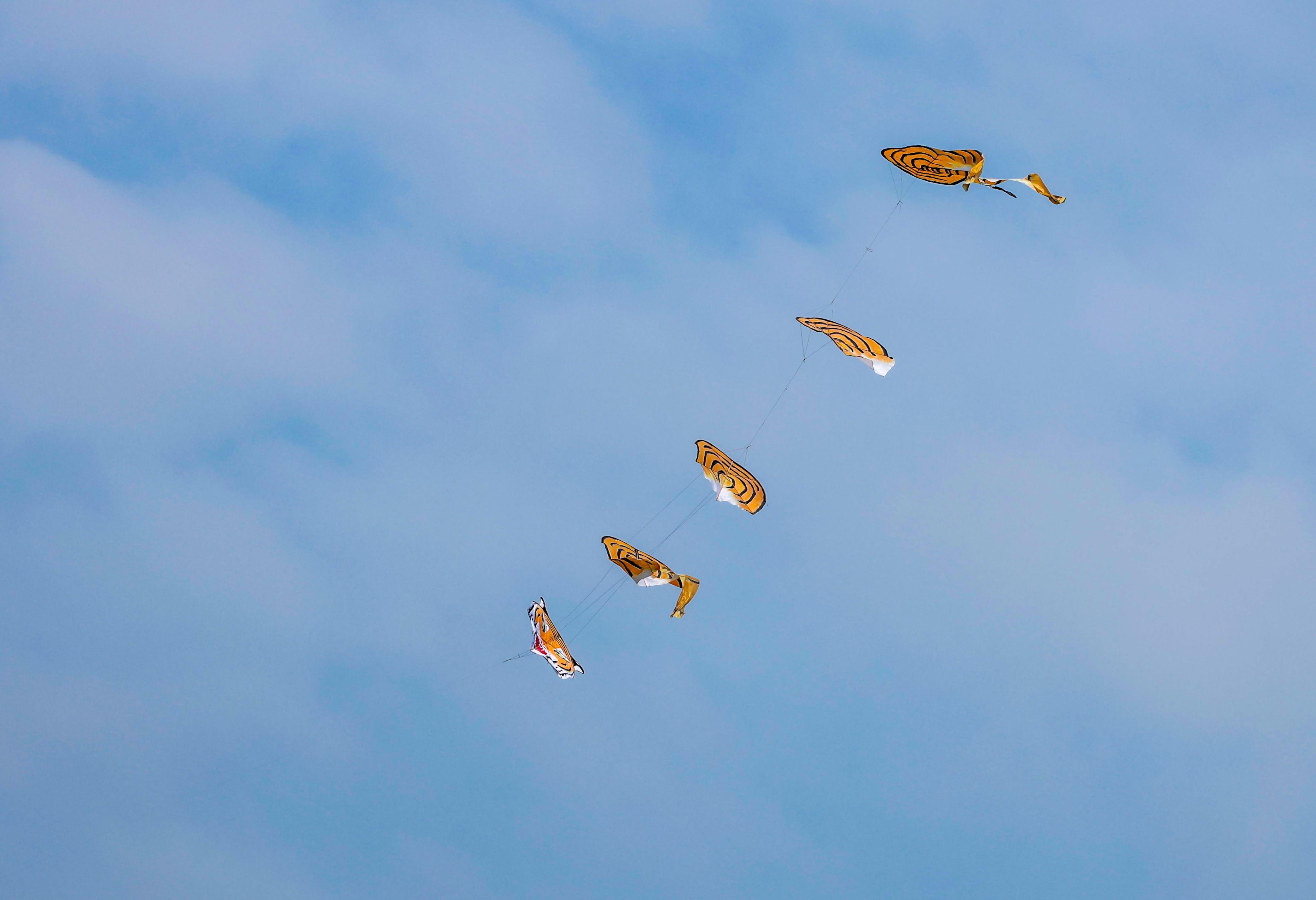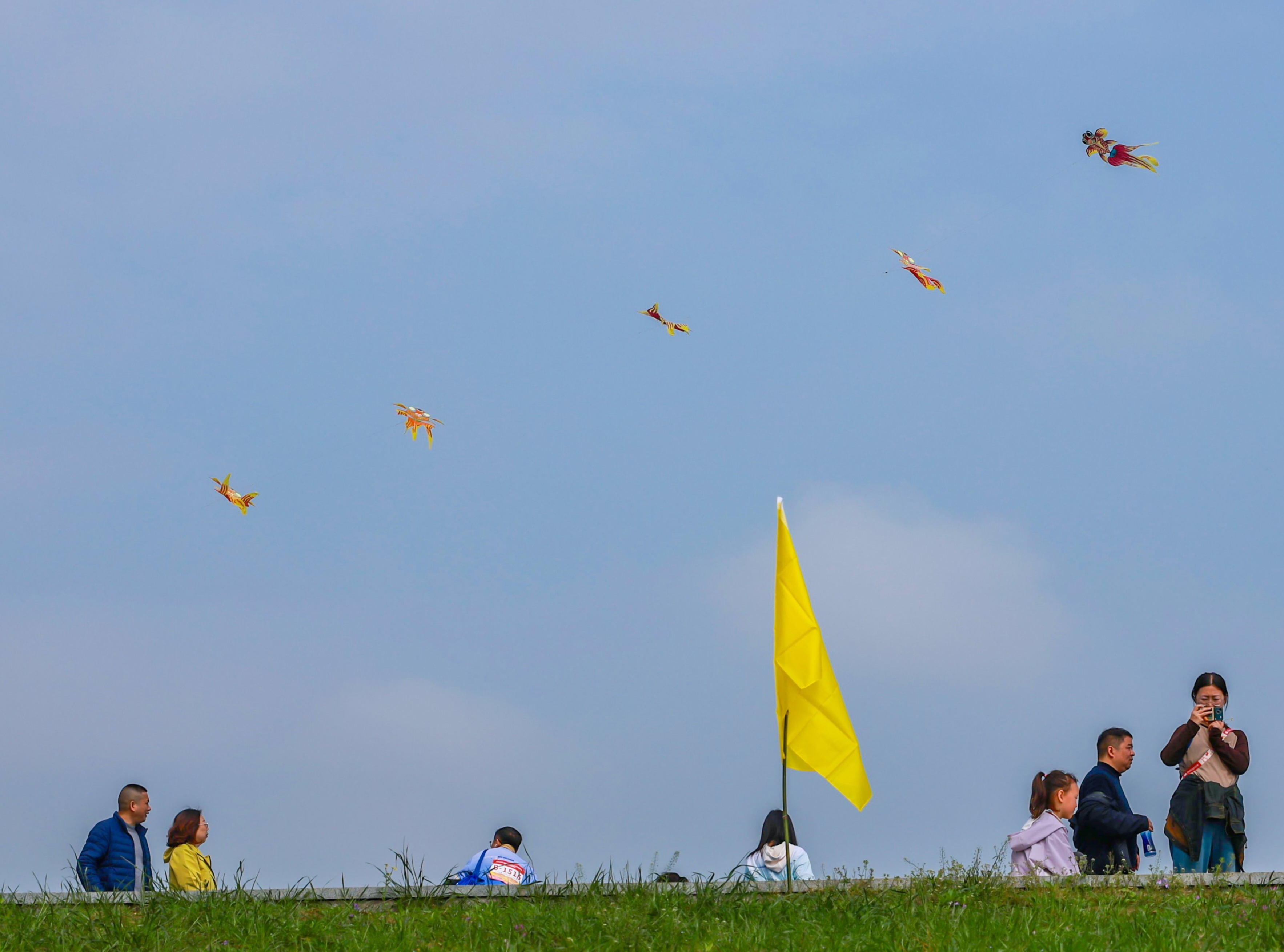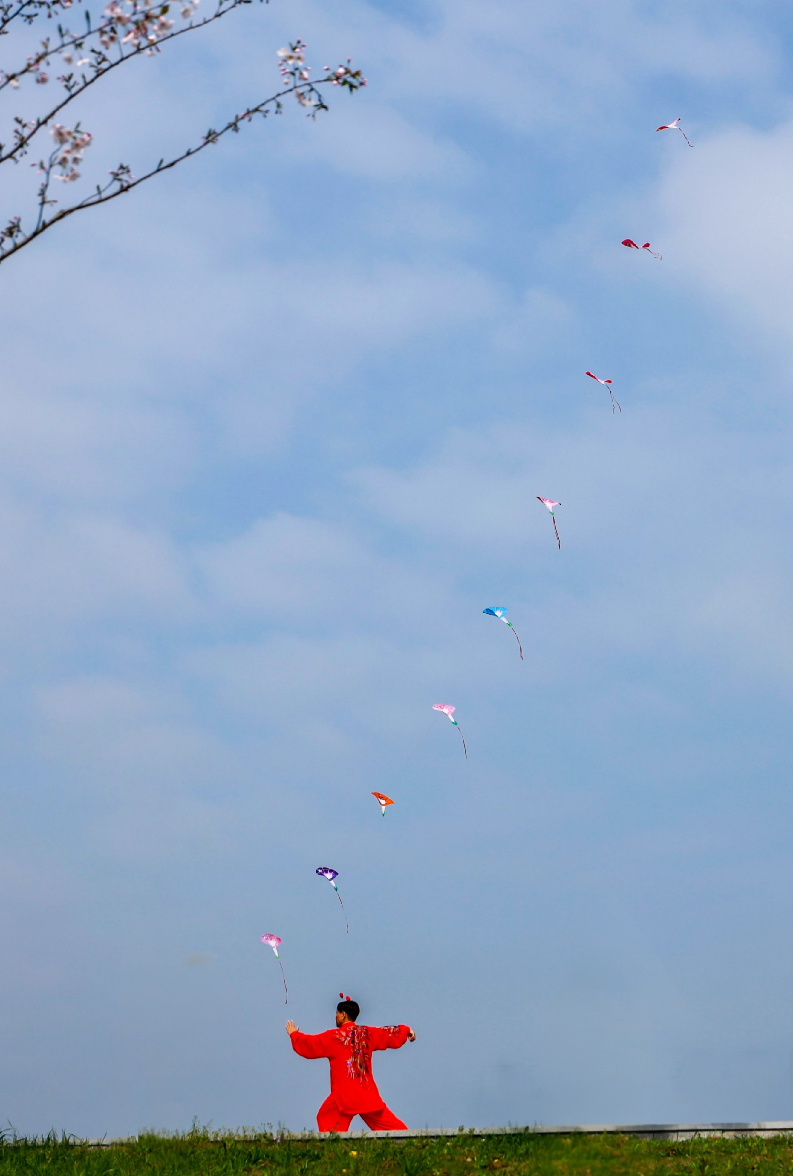 苕溪岸边春风拂过青草地,蓝天如洗,白云悠悠。红衣女士立于樱枝下,指尖牵着蝴蝶风筝,串连的纸鸢在风里轻舞。快门按下,定格这抹传统与春光交织的温柔——原来人间四月,是风在写诗,我们在读。