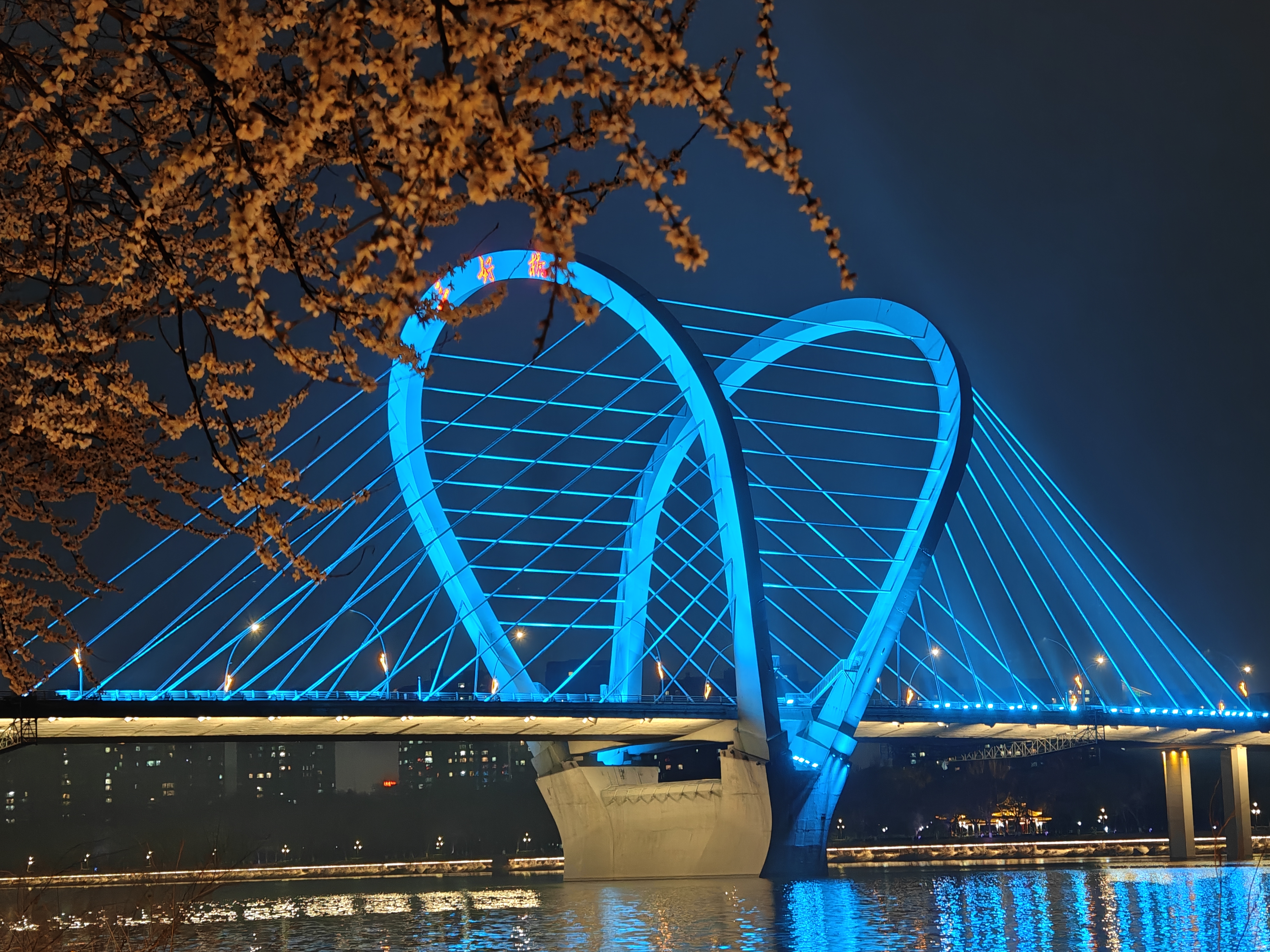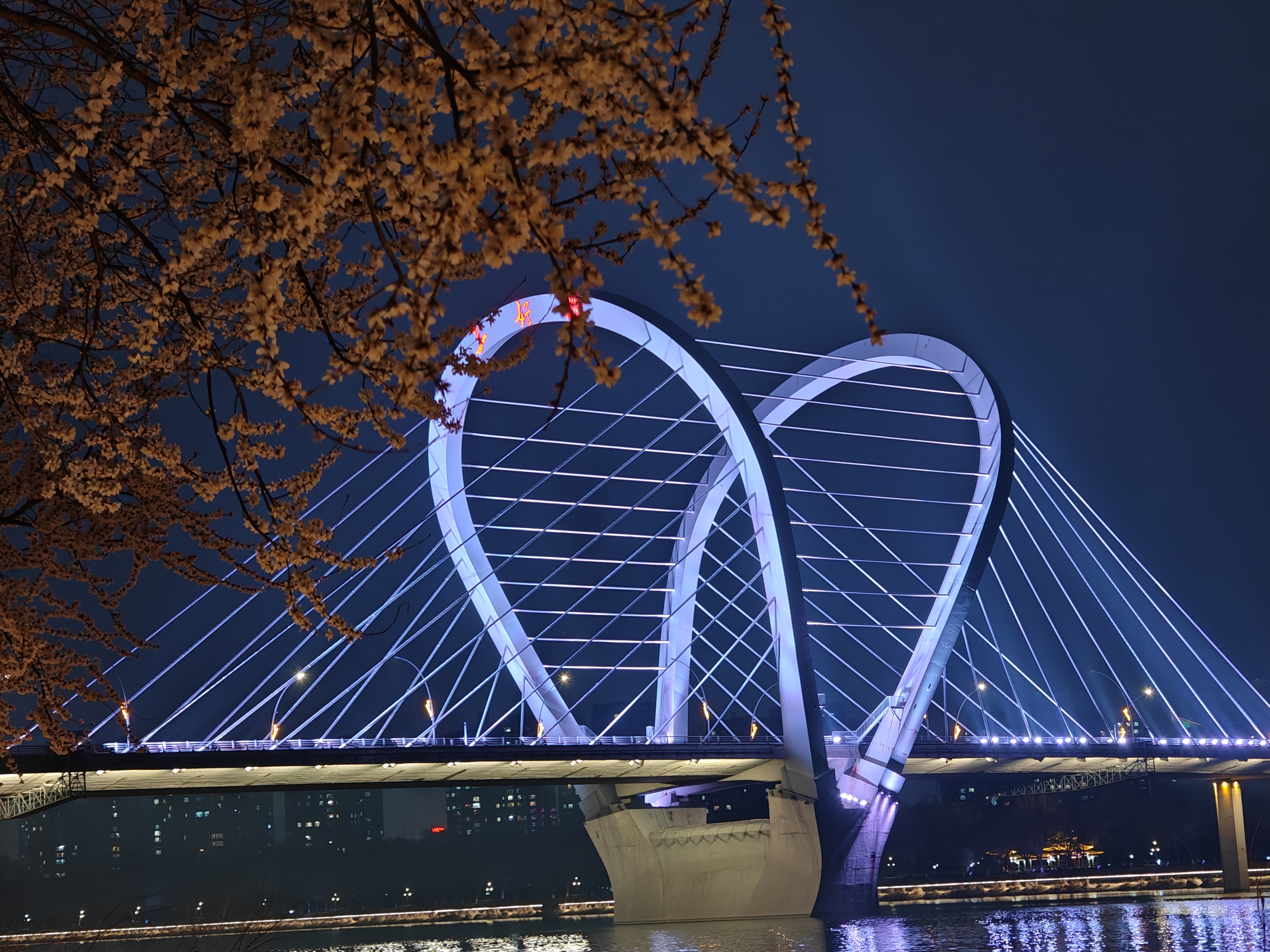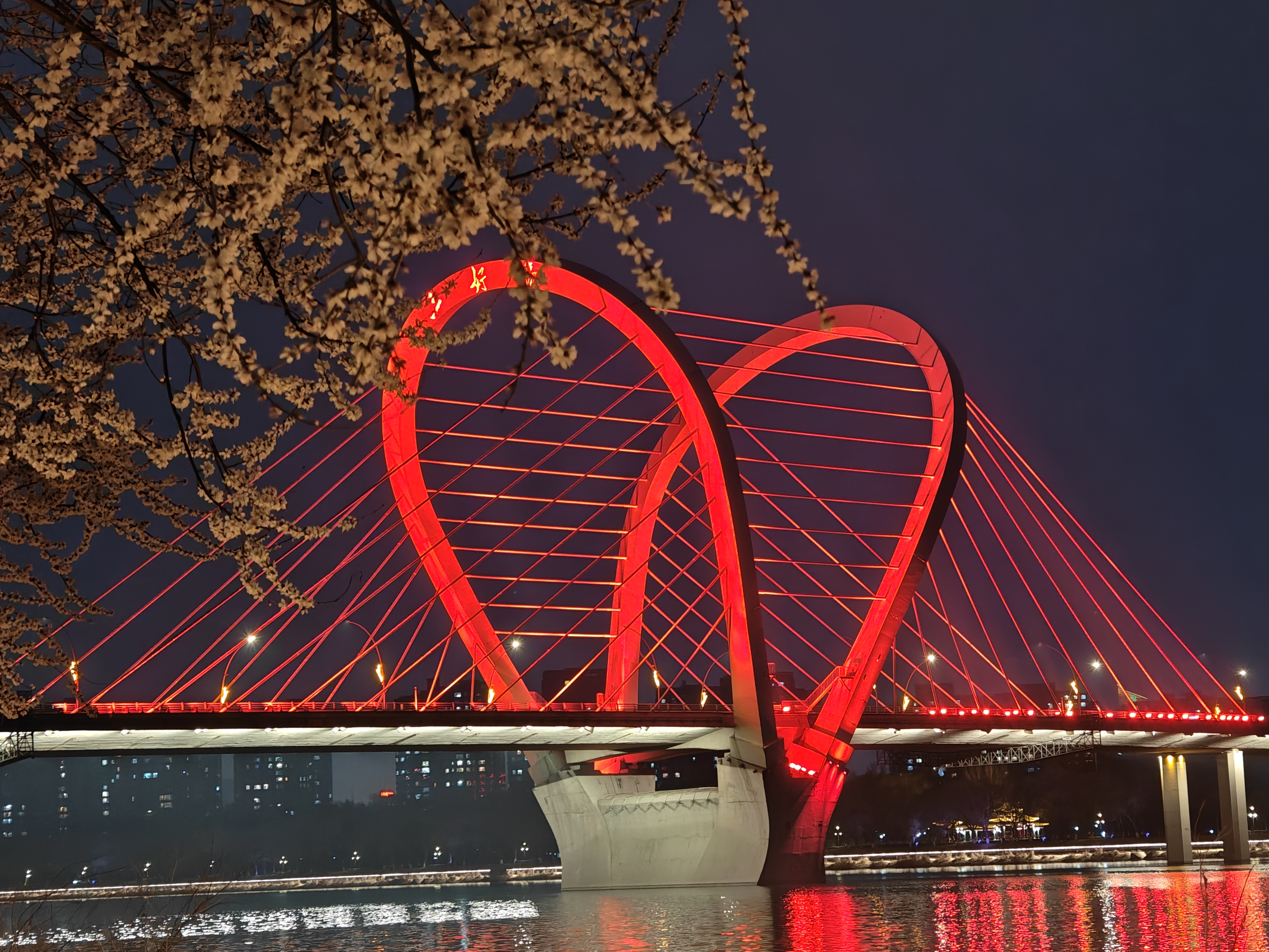 夜幕下的三好桥与河边的桃花遥相辉映,拍摄于4月9日沈阳