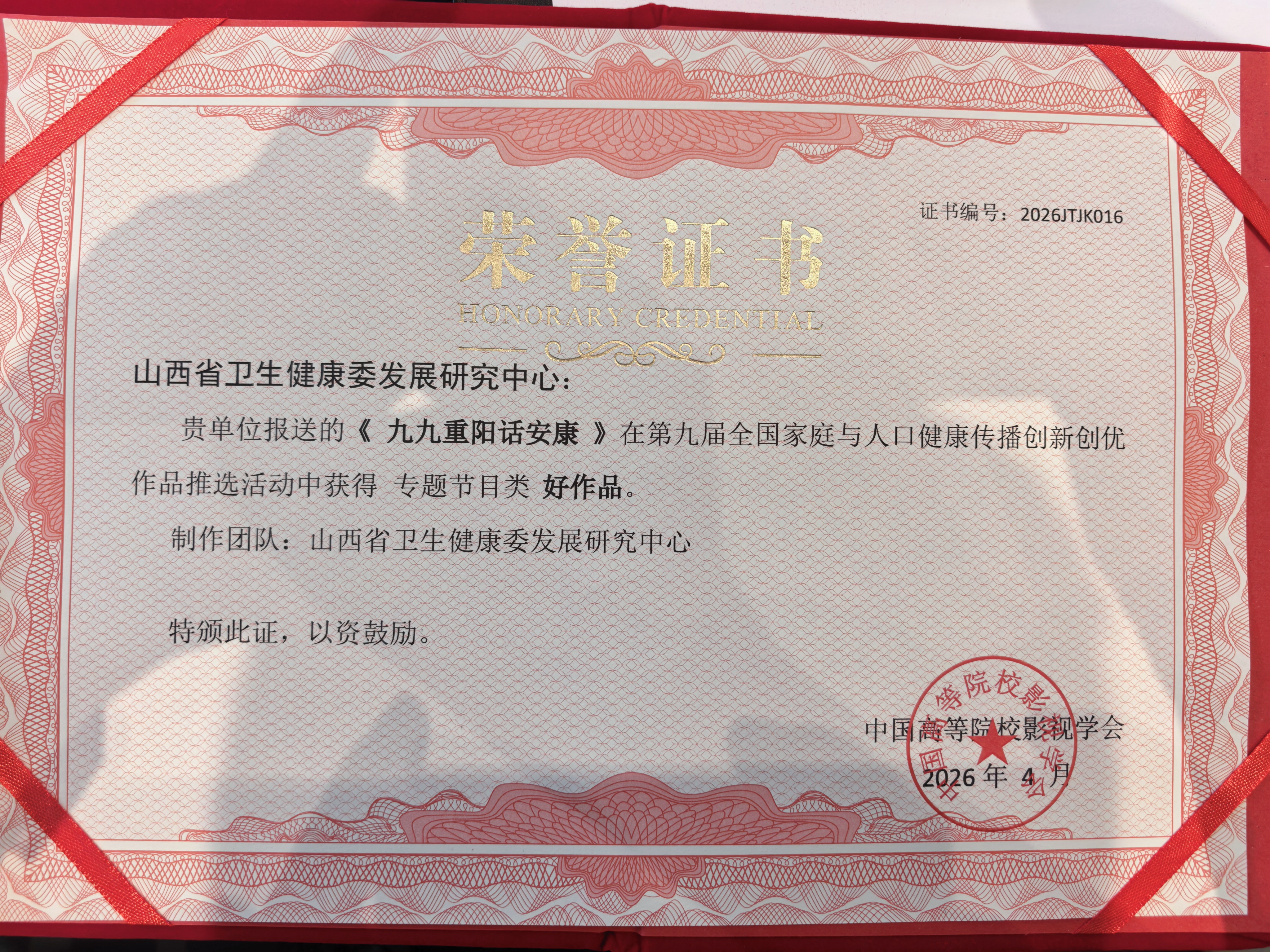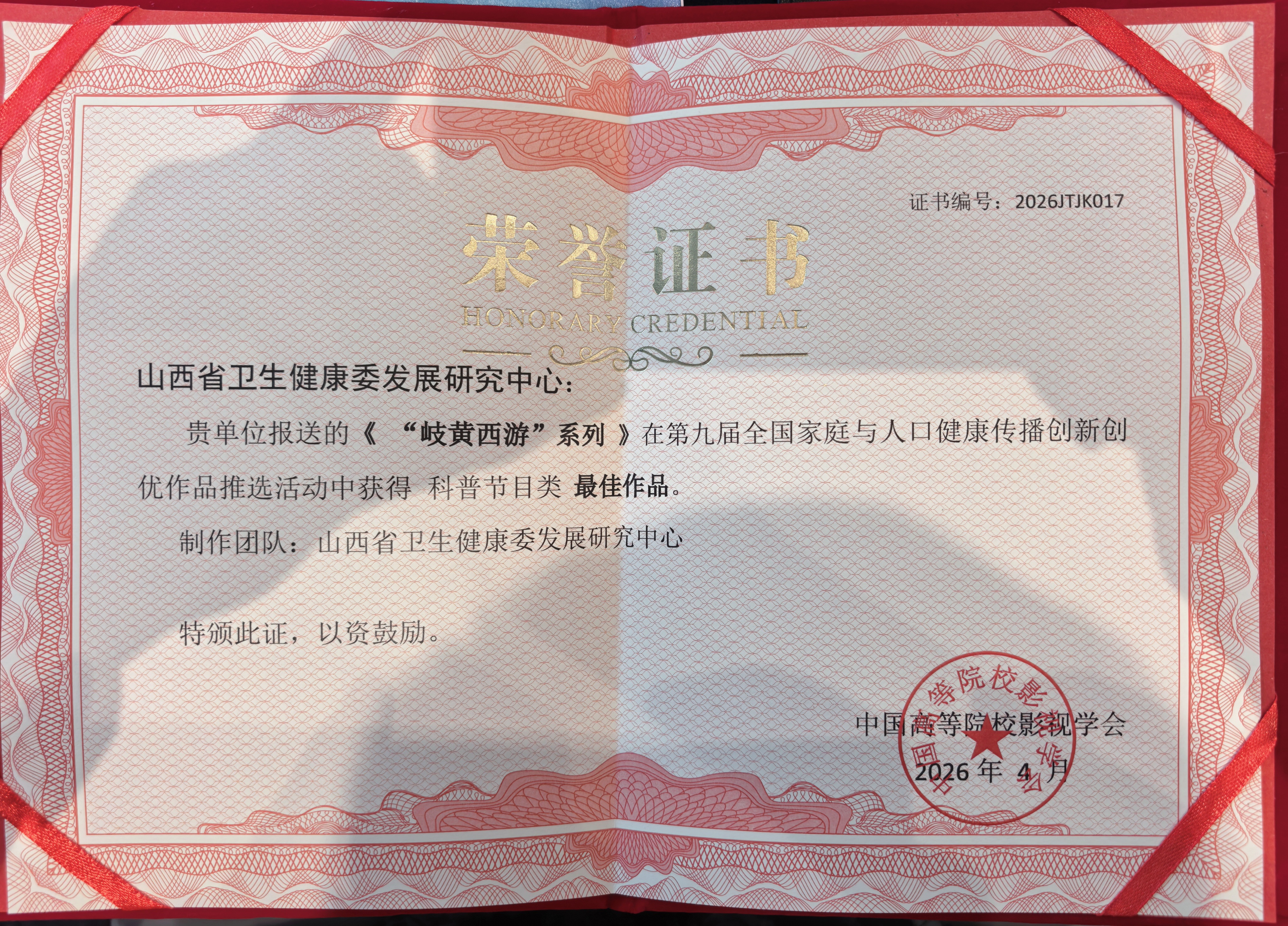 山西省卫生健康委发展研究中心在全国健康传播活动中荣获佳绩 (供稿:郝东亮 阎耀) 4月2日-3日,第十届中国电视与新媒体健康传播活动暨第九届全国家庭与人口健康传播创新创优作品推选活动揭晓仪式在浙江绍兴举行。本次活动由国家卫生健康委人口文化与基层健康中心、中国传媒大学传媒艺术与文化研究中心联合主办,主题为“人工智能赋能健康传播高质量发展”。来自全国卫生健康系统、媒体及高校等领域的专家学者和业务骨干齐聚一堂,共同探讨健康传播的创新路径。 经全国专家严格评审,山西省卫生健康委发展研究中心报送的作品从众多参评作品中脱颖而出。其中,《“岐黄西游”系列》荣获科普节目类最佳作品,《九九重阳话安康》荣获专题节目类好作品。活动期间,该中心副主任樊瑞华作为获奖单位代表发言,以“智库赋能 聚力传播——人工智能赋能健康传播的山西实践与探索”为题,分享了山西省在健康传播领域的经验做法,获得与会领导、专家及同行的高度认可。 近年来,山西省卫生健康委发展研究中心紧紧围绕健康中国和健康山西建设要求,持续深耕家庭与人口健康传播领域,聚焦中医药文化、老年健康、慢病管理、公共卫生等重点方向,推出了一批群众喜闻乐见、传播力强的健康科普作品,有效提升了居民健康素养水平。 此次在全国性活动中摘得奖项并作经验交流,既是对山西省健康传播工作的充分肯定,也标志着新的起点。该中心表示,将以此为契机,进一步运用新媒体、新技术,打造更多精品健康传播内容,为推进健康山西建设、提升全民健康素养贡献更大力量。