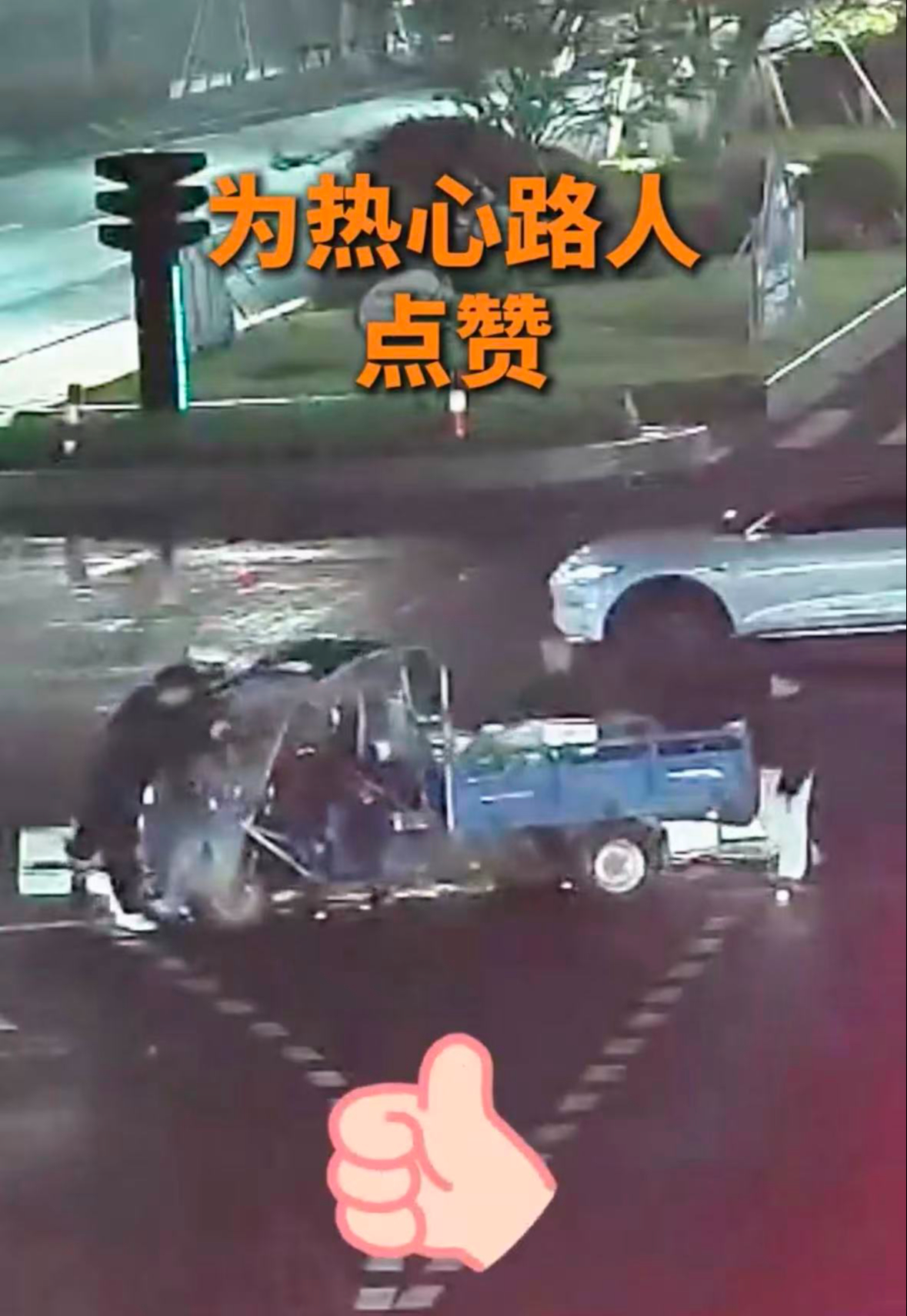 雨夜暖心一幕!4名热心路人合力救助侧翻三轮车 4月8日晚8时许,在温州龙港世纪大道与彩虹大道路口,上演了温暖人心的一幕。当晚降雨导致路面湿滑,一辆三轮车在途经该路口时,因驾驶员操作不当,车辆突发侧翻。沉重的车身倒在路面上,驾驶员独自无法扶正车辆,现场存在安全隐患。 危急时刻,4名路过的热心路人挺身而出,毫不犹豫穿过车流上前帮忙,分工协作、合力发力。顺利将侧翻的三轮车扶正,并帮忙清理散落货物,确保道路恢复畅通。待现场整理妥当,确认驾驶员无大碍、车辆恢复基本状态后,4名热心路人默默离开。此时交警也赶到现场,做好后续处置工作。 雨夜微凉,人心却暖。素不相识的路人挺身而出,用实际行动传递正能量,彰显了平凡人的善意与担当,值得我们点赞致敬!