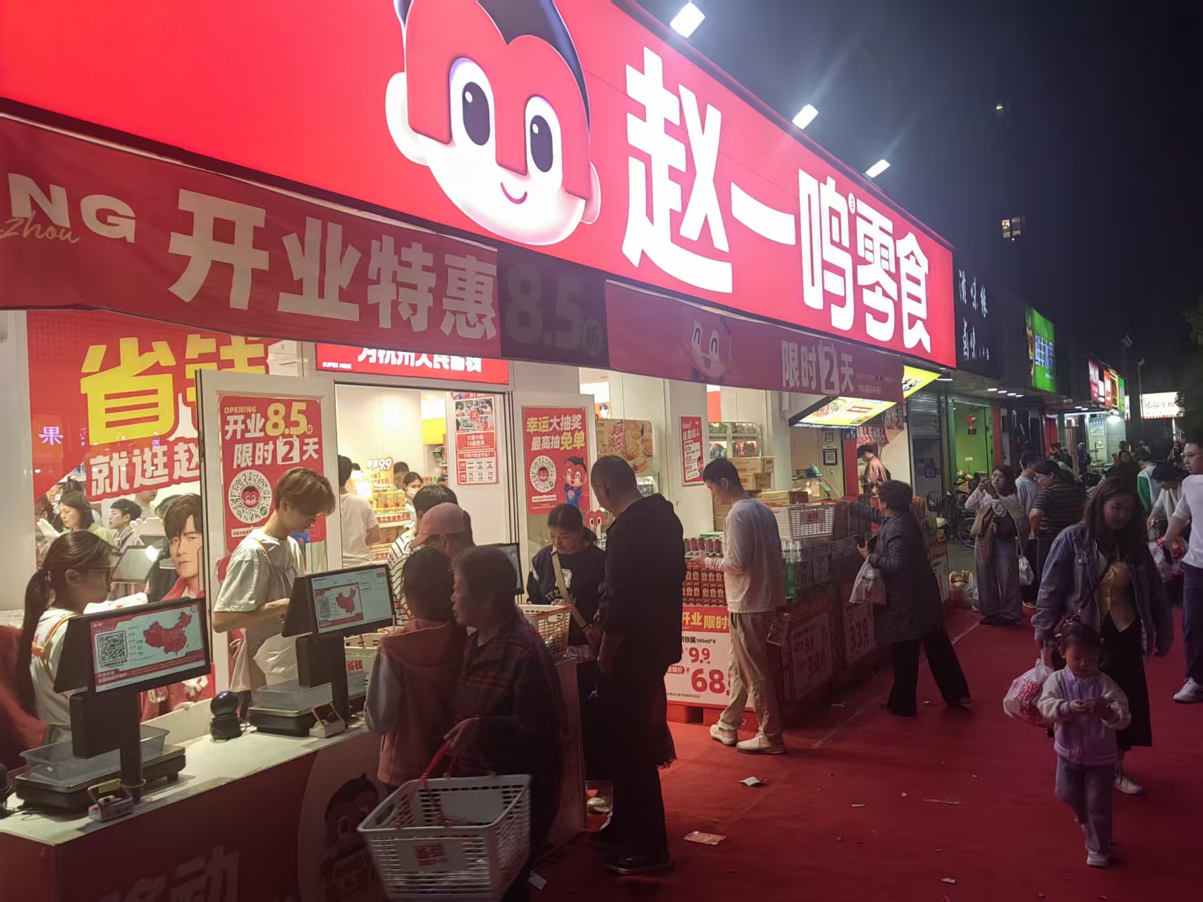 零食店开张,阿是蛮闹忙滴,我阿起噶了个闹忙,里面荡了圈看看,结果看看付钞票的人嘎多,吃不落排队伍,息锣的。