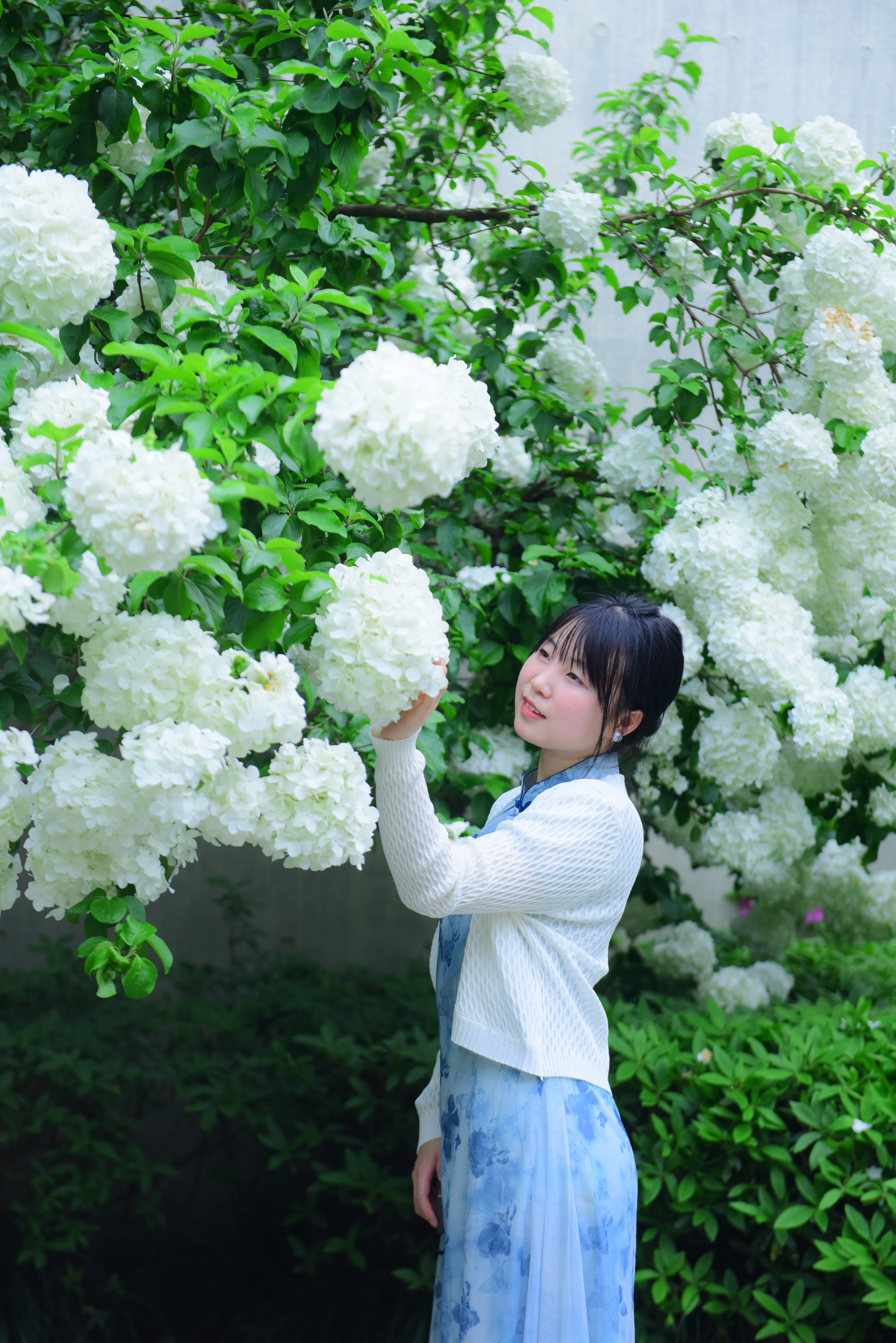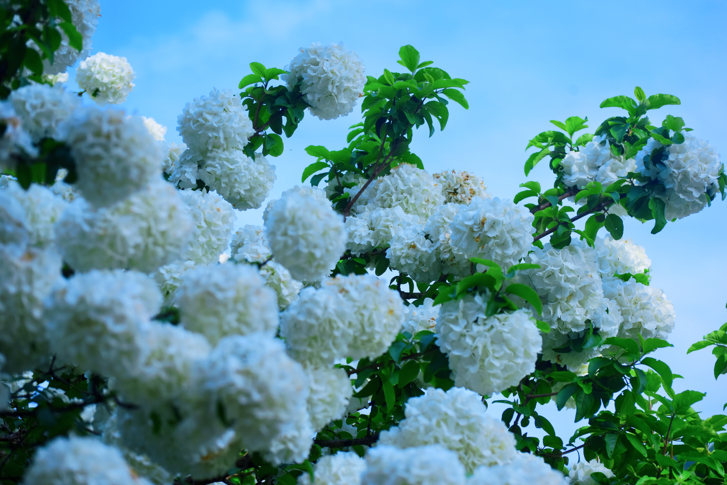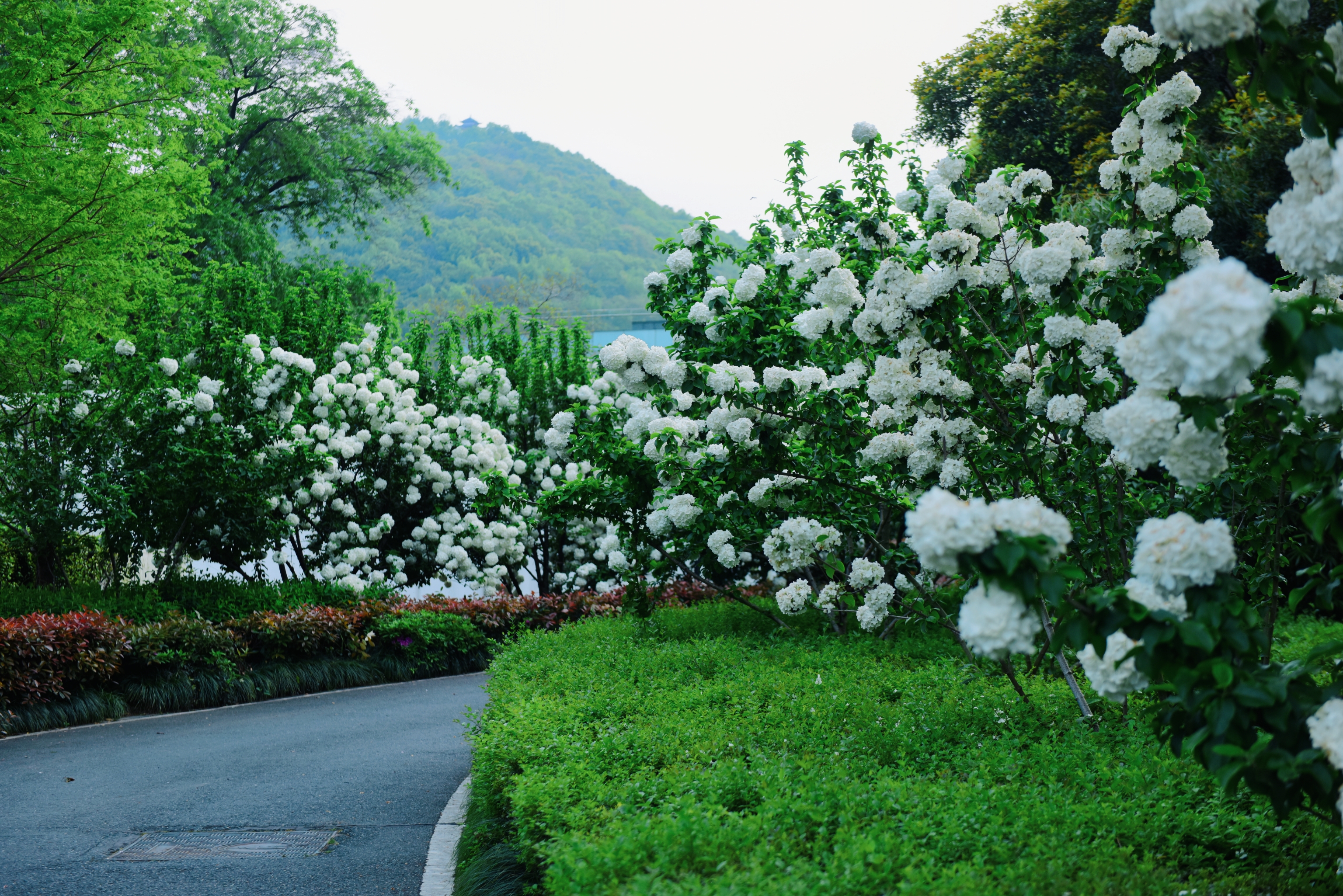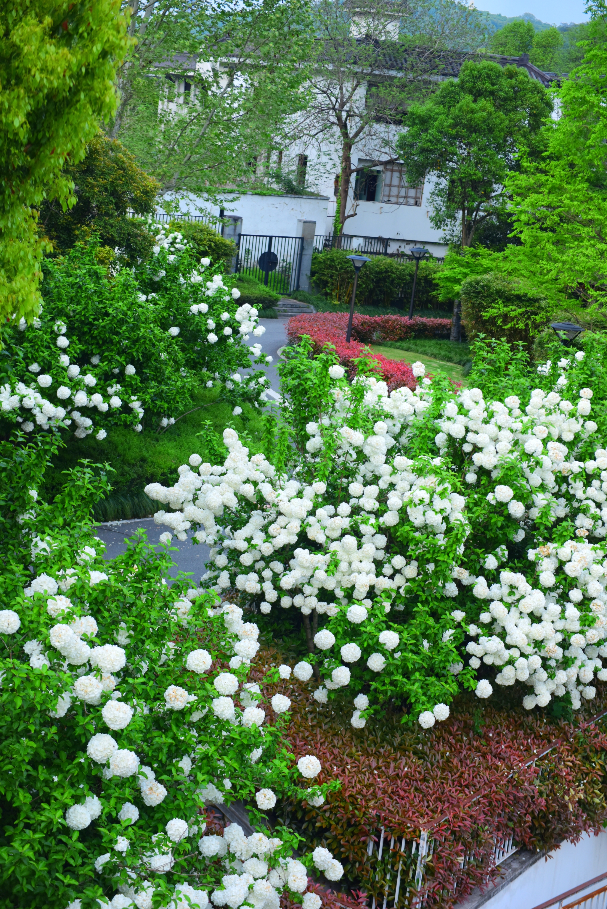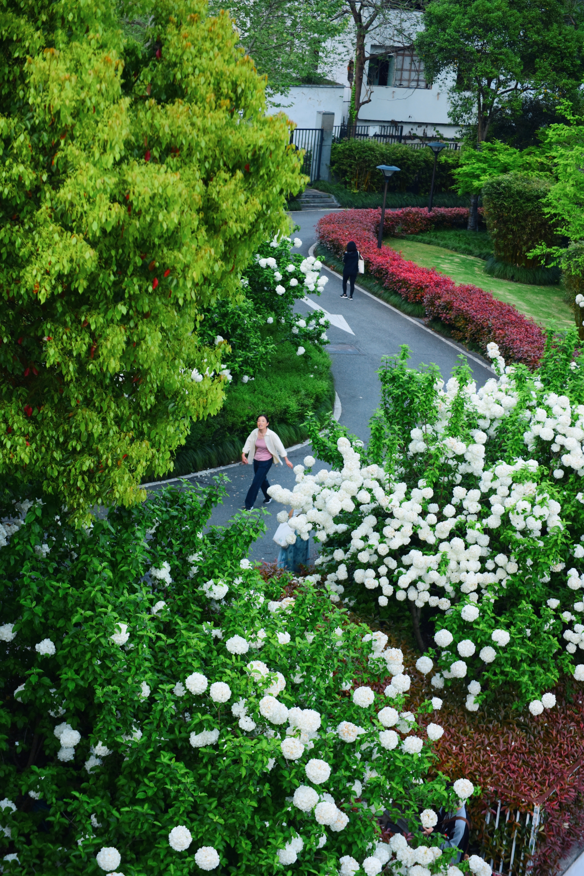 中国丝绸博物馆内的木绣球已“完美绽放”“开爆”“满目绣球”,洁白花朵密布枝头,如云似雪 。