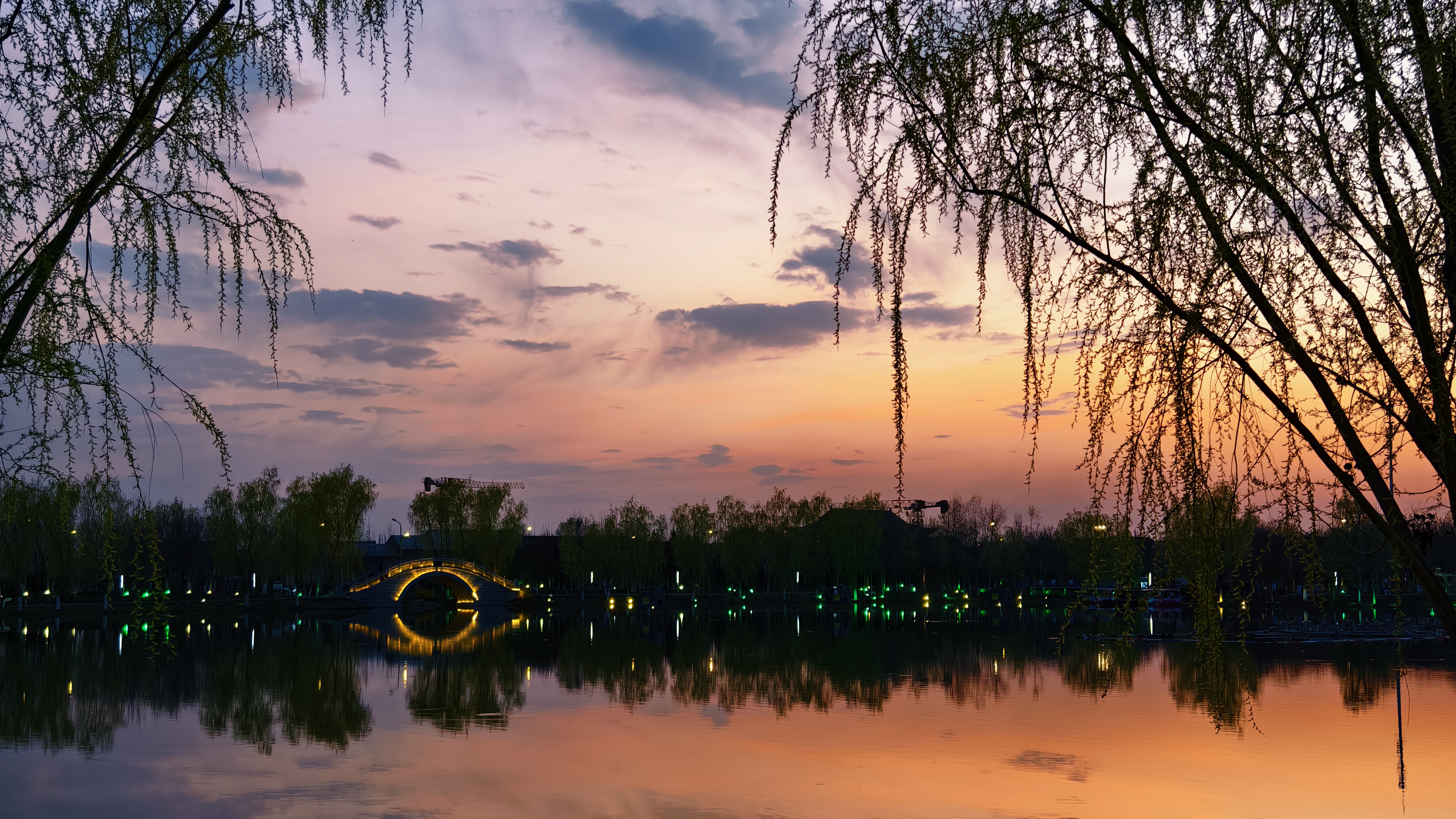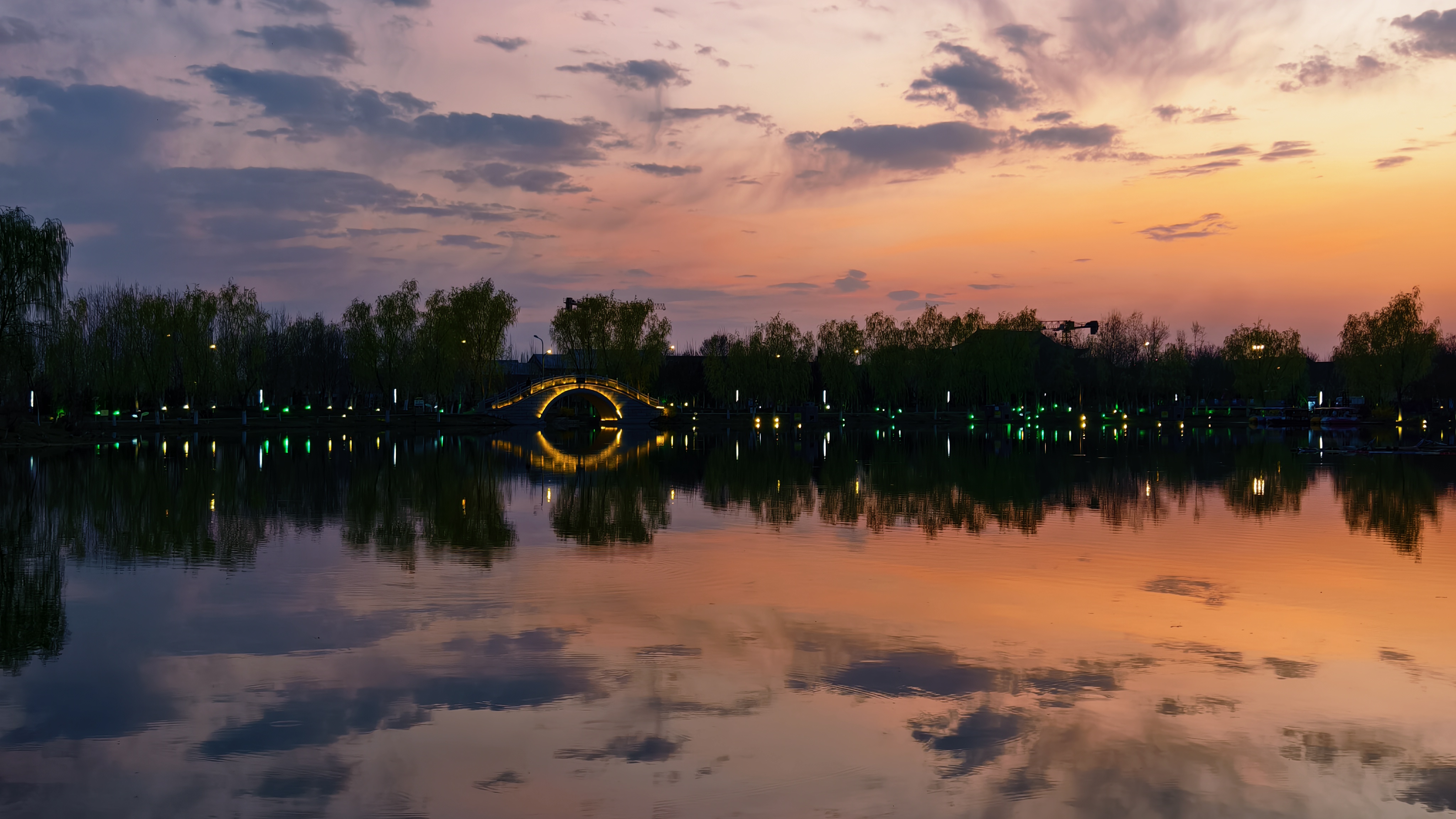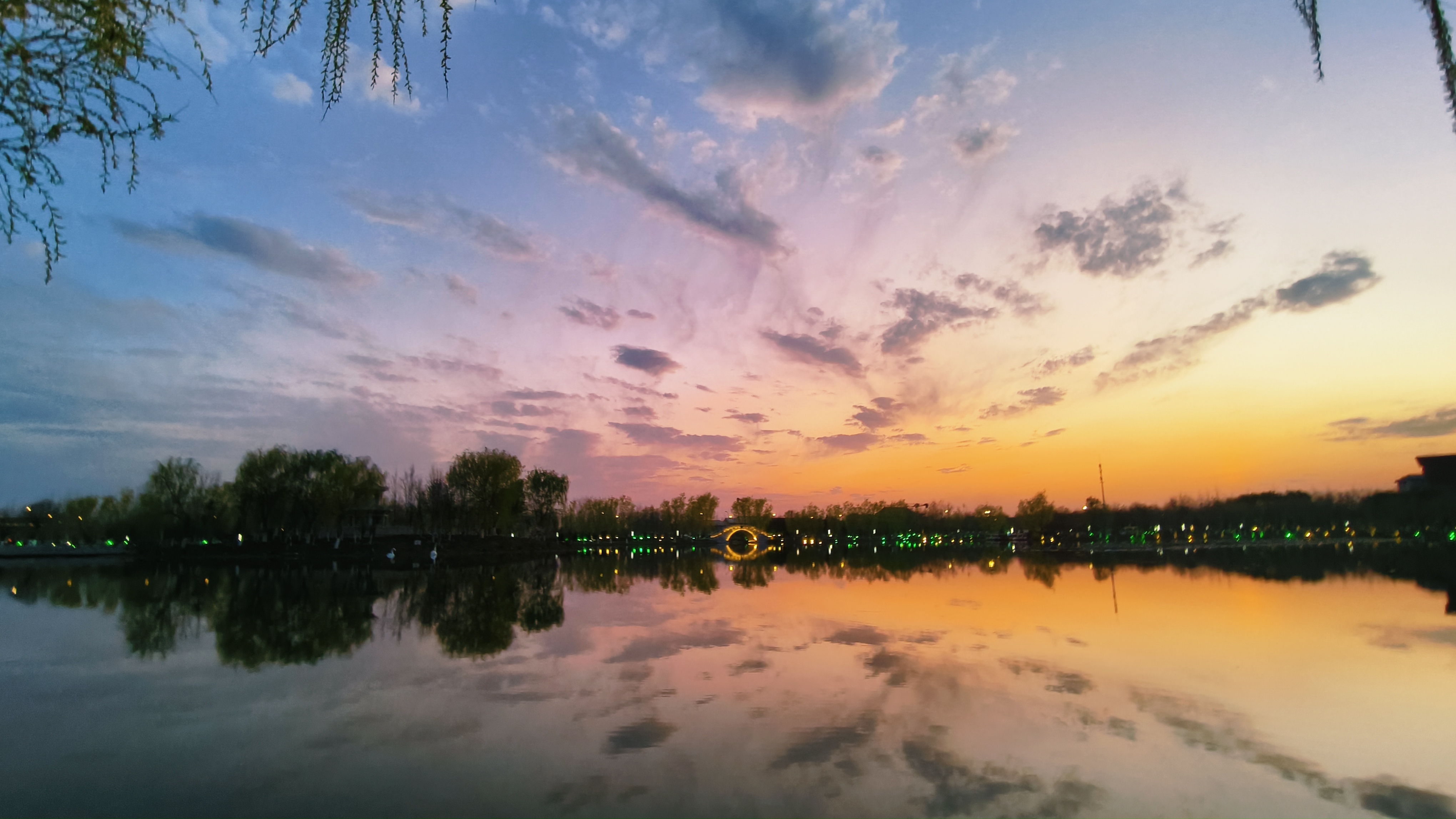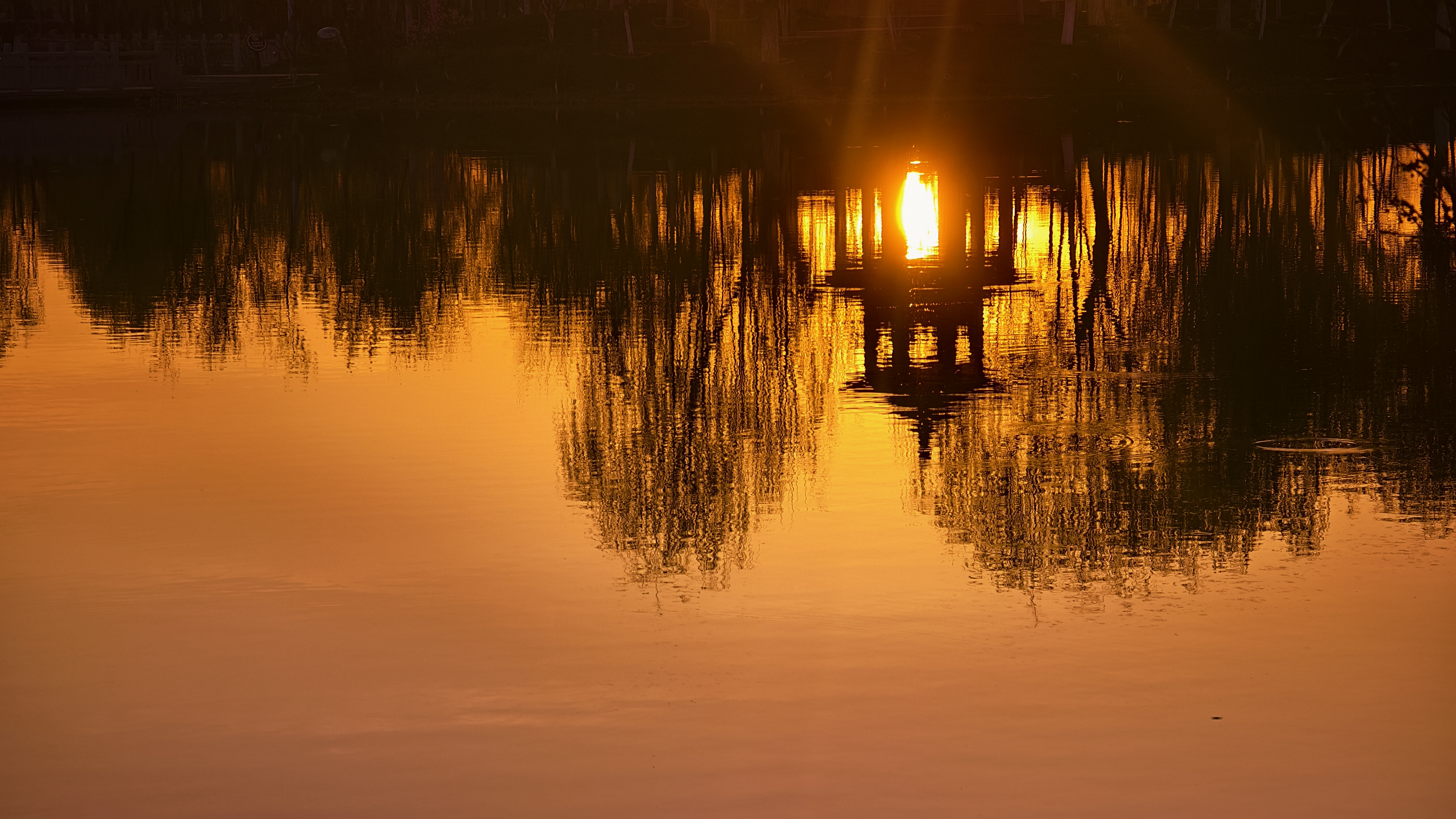 落日鎏金!傍晚的朱雀湖被落日余晖染成橘子色