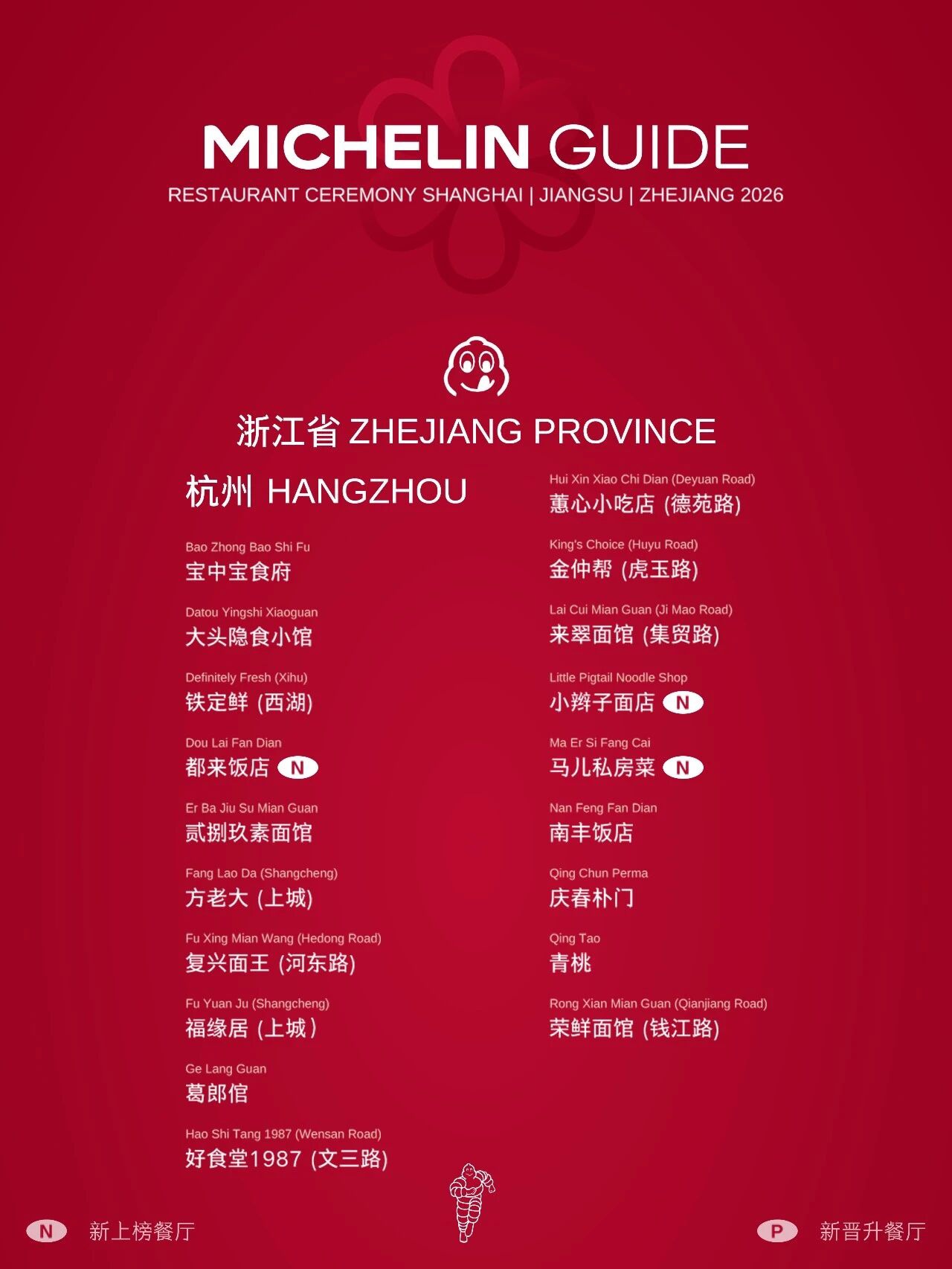 2026杭州米其林榜单:解香楼升二星,俞斌获导师厨师奖,新增9家必比登 📍先说重磅消息: ✨ 解香楼 晋升 米其林二星! 藏在紫萱度假村里的神仙餐厅,浙菜做得又仙又精致,宋嫂鱼柳羹直接封神🐟 ✨ 如院 继续稳坐二星,杭帮菜经典yyds! 🌟 一星阵容也稳得很,11家老面孔继续发光~ 但最让人欣喜的是—— 🔥 9家街边小店/苍蝇馆子 杀入必比登推荐!全是杭州人自己排队吃的: 🍜 小辫子面店 —— 一碗面吃得人眼泪汪汪 🥢 都来饭店、马儿私房菜、食为鲜、萧山味道 —— 本地人私藏食堂 🍚 童妈妈、小柏菜、小朱饭店、也龙井 —— 浙江家常味,妈妈的味道! 真的,米其林终于懂我们了!高级餐厅好,但烟火气才是杭州的灵魂啊💨 🏆 还有一个超级骄傲: 解香楼俞斌主厨 拿了 米其林导师厨师奖! 他是浙菜出圈的推手,徒弟遍布全国,respect!👨🍳 🌿 另外 朴竺 继续拿 米其林绿星,可持续餐饮也走在前列~ 📌 总结一句: 杭州早已经不是“美食荒漠”了! 从西湖边的高级宴席,到巷子里的拌川小笼, 这次米其林盖章:杭州,真的好吃。 💬 你们觉得还有哪家杭州小店值得上榜? 评论区告诉我,我去吃给你们看!👇