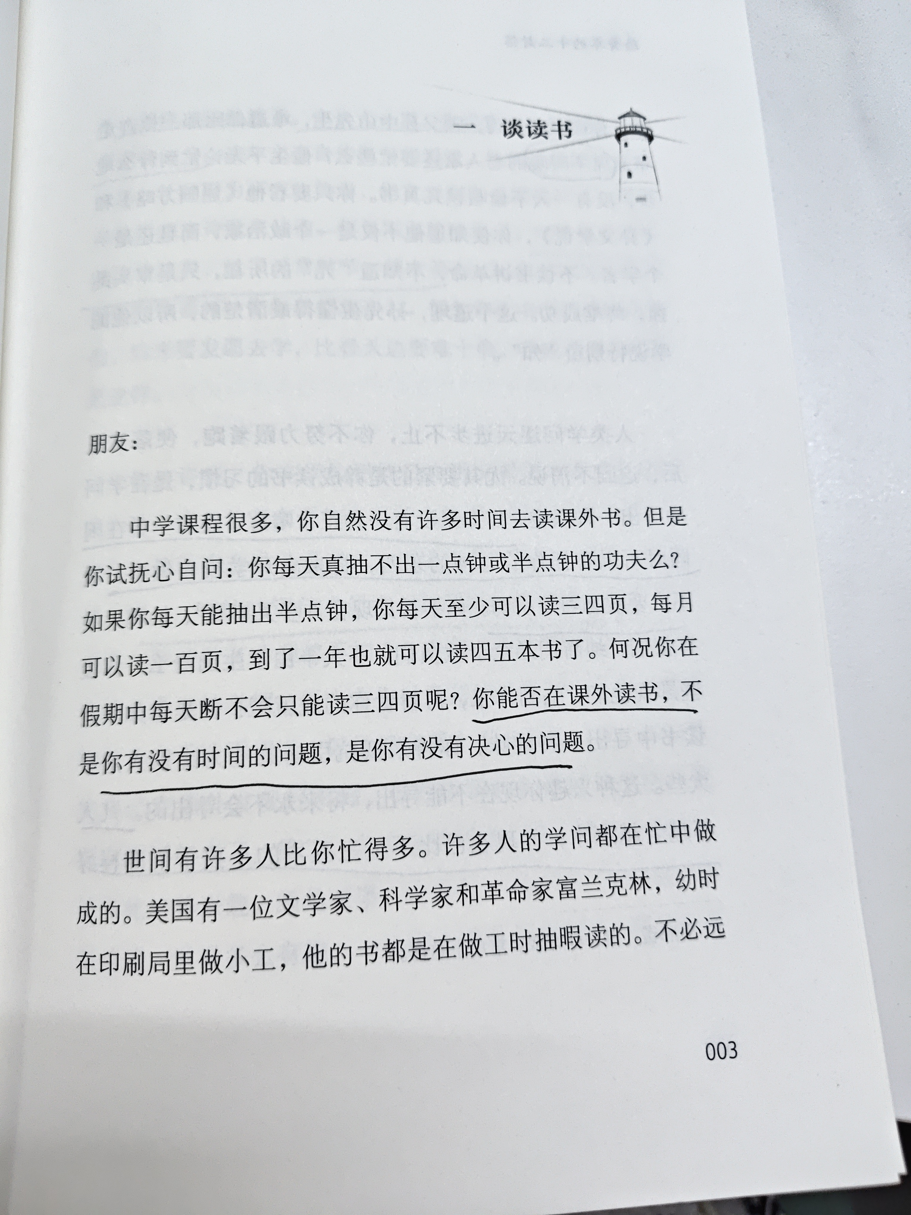 一个中年人决定读朱光潜先生的《给青年的十二封信》是不是挺好玩的,有重要返老还童的感觉了。第一封信就是《谈读书》。读书不是时间问题,是决心问题。