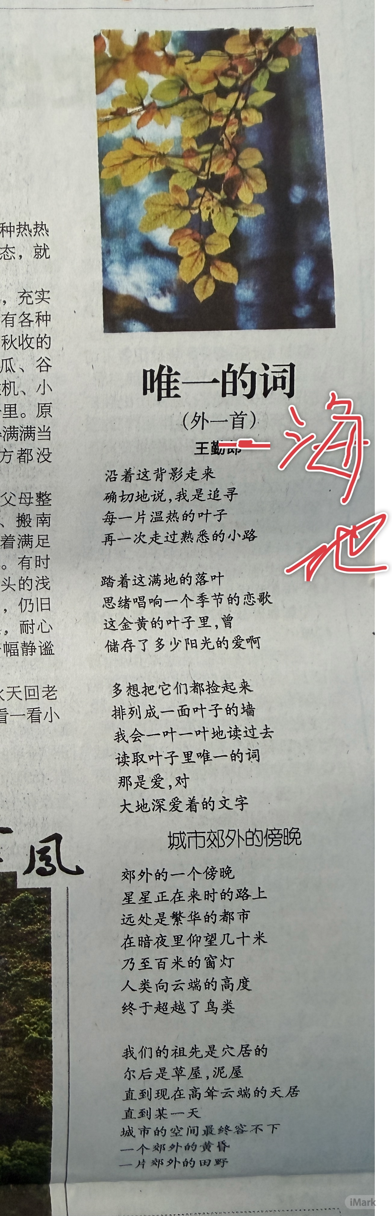 唯一的词 /海地 沿着这背影走来 确切地说,我是追寻 每一片温热的叶子 再一次走过熟悉的小路 踏着这满地的落叶 思绪唱响一个季节的恋歌这金黄的叶子里,曾 储存了多少阳光的爱啊 多想把它们都捡起来 排列成一面叶子的墙 我会一叶一叶地读过去 读取叶子里唯一的词 那是爱,对 大地深爱着的文字
