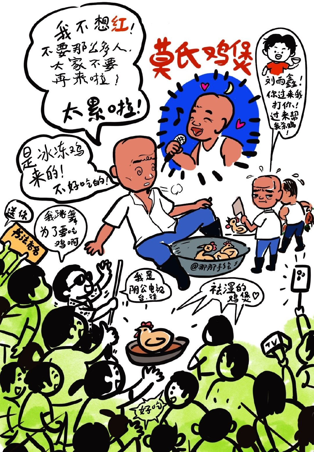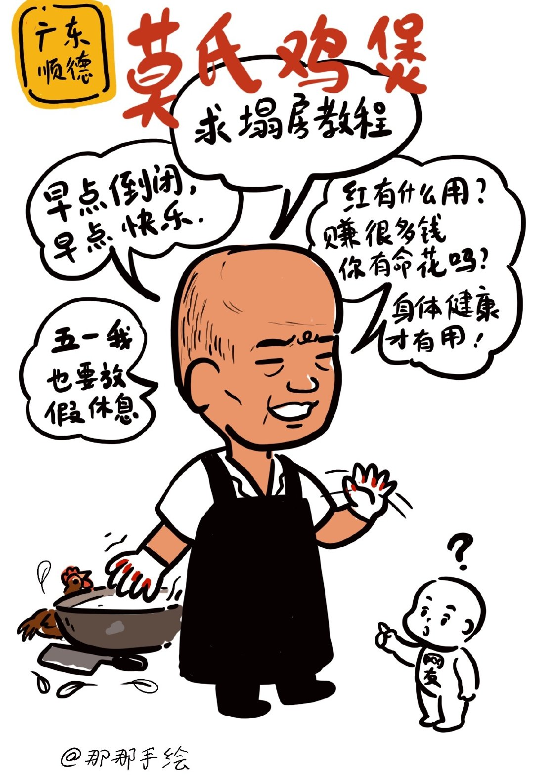 莫氏鸡煲老板这下又有得忙了,这几天我也常刷到广东佛山顺德的莫氏鸡煲的最不想火的老板相关视频!有意思,今漫画两幅,老板的观点给我跟现在人人都想拼流量高火并赚大钱的观念形成了反差感,我甚至觉得他性格很可爱,因为他本就是退休年纪并有退休金拿的,不愁吃穿的,子女也有自己事业,不需要他操心,而他可能只是为了打发时间开个小店面向周边邻里而已,晚饭后可早早下班去唱卡拉Ok,这样的养老生活确实很幸福的(我也对他家鸡煲的药膳很感兴趣,祛湿的,春夏养生正当时)