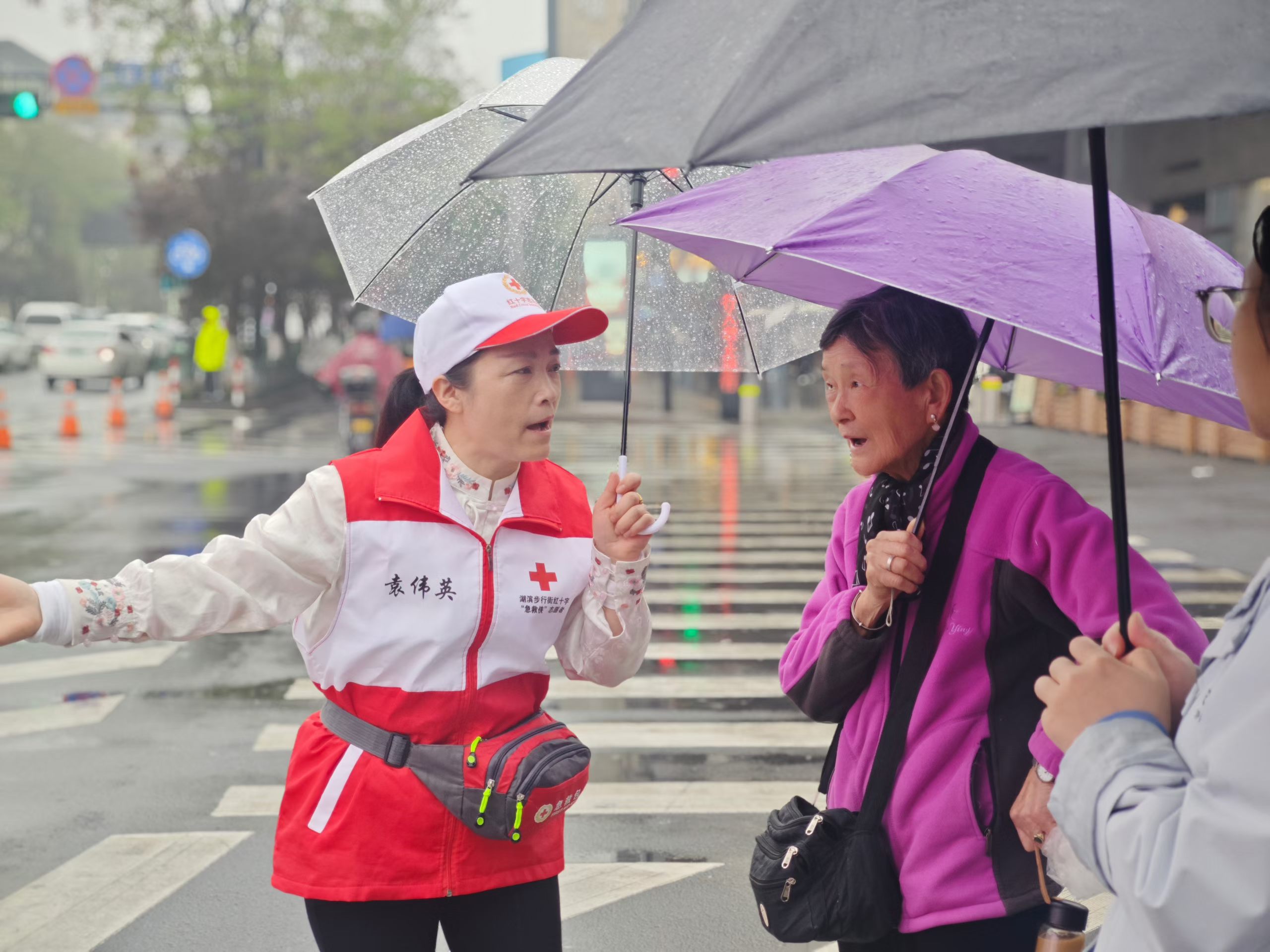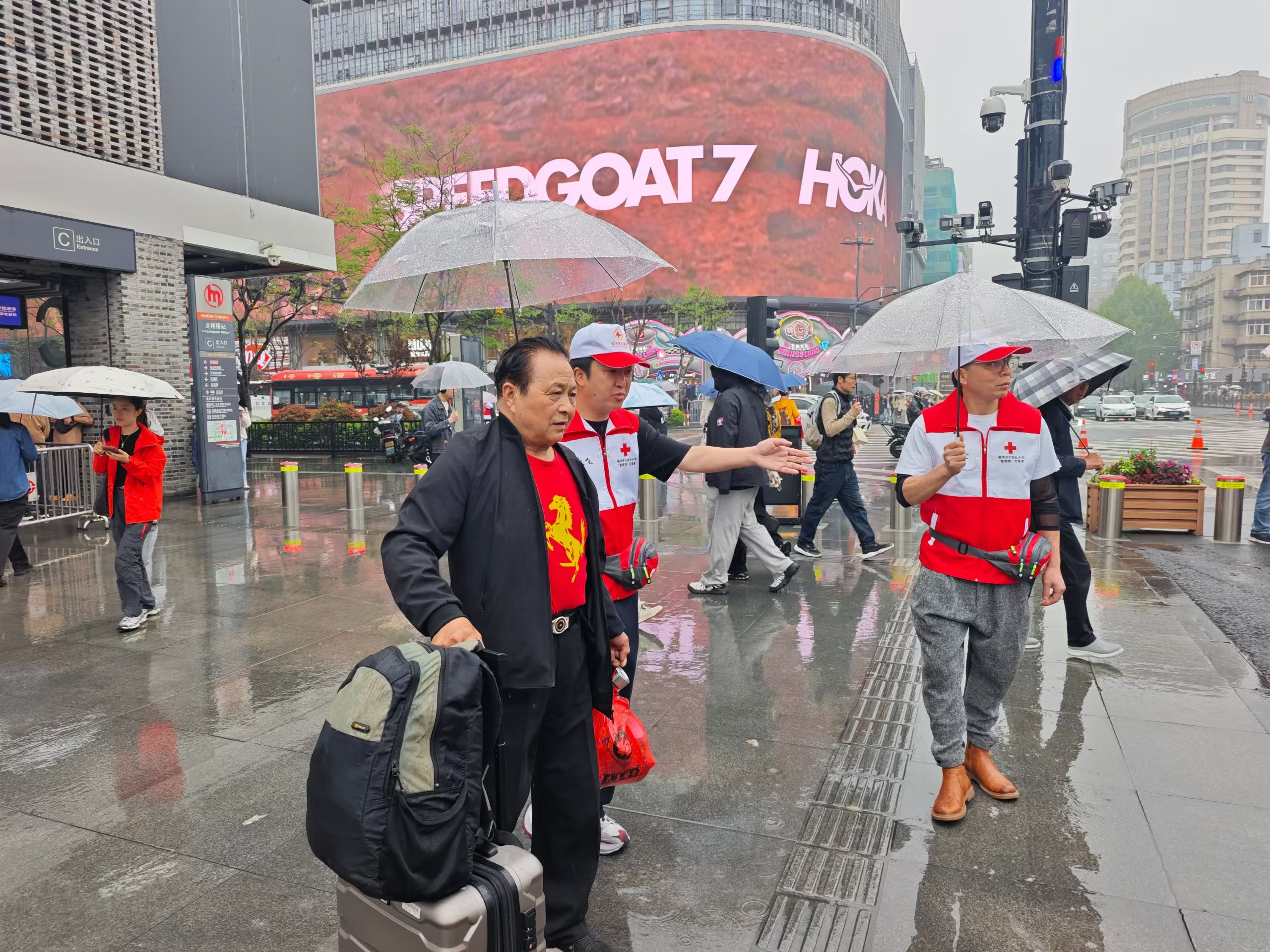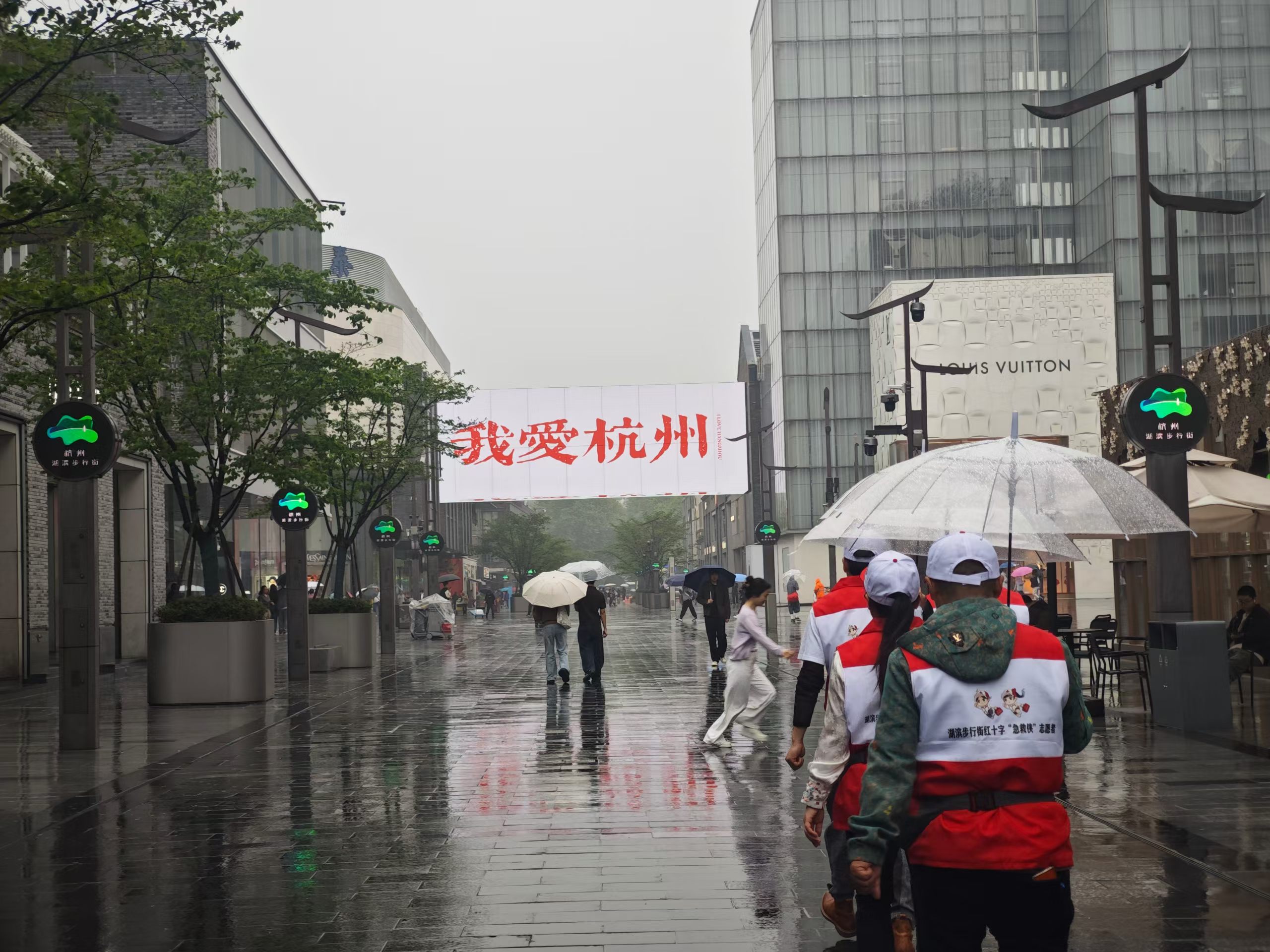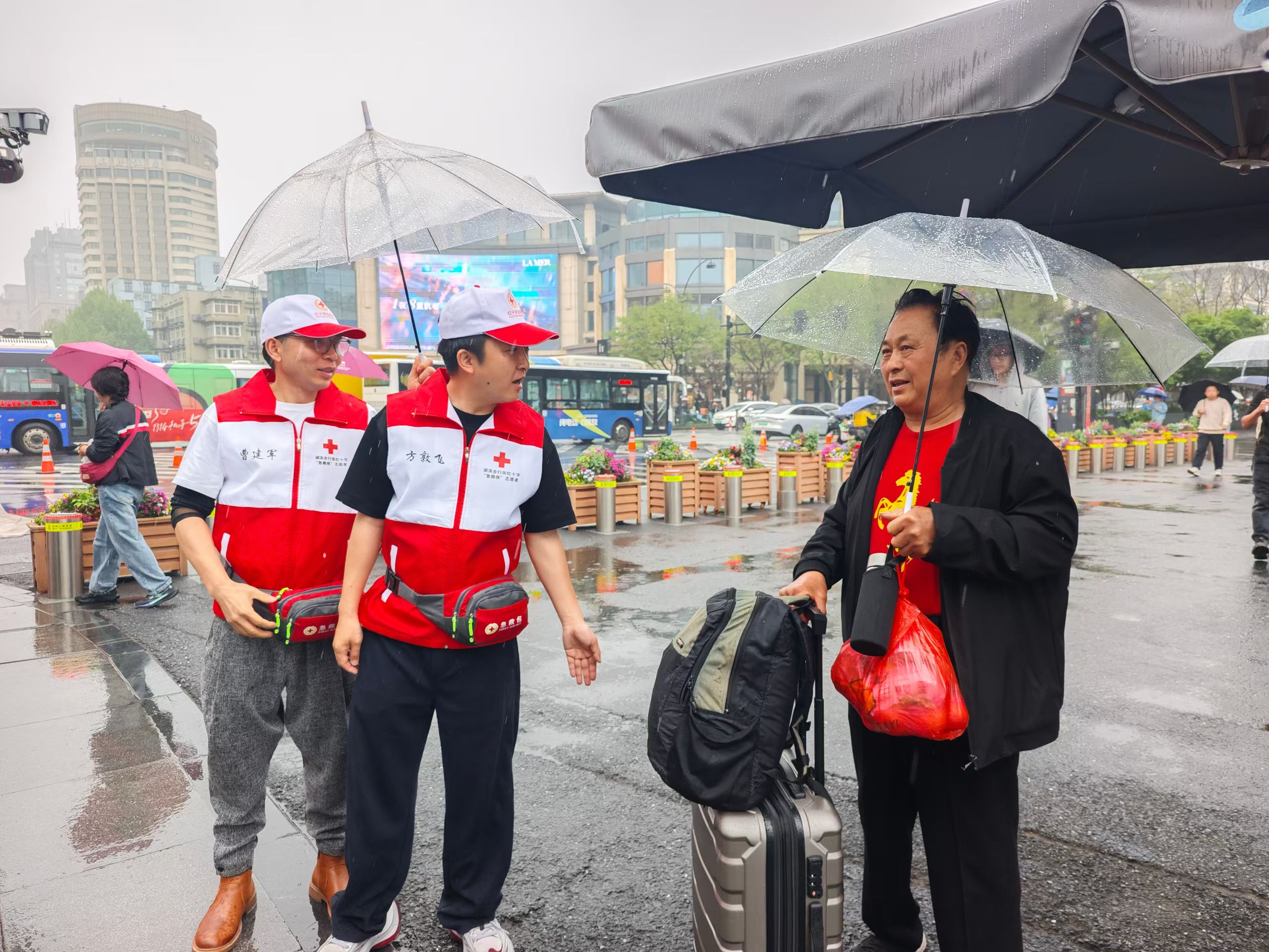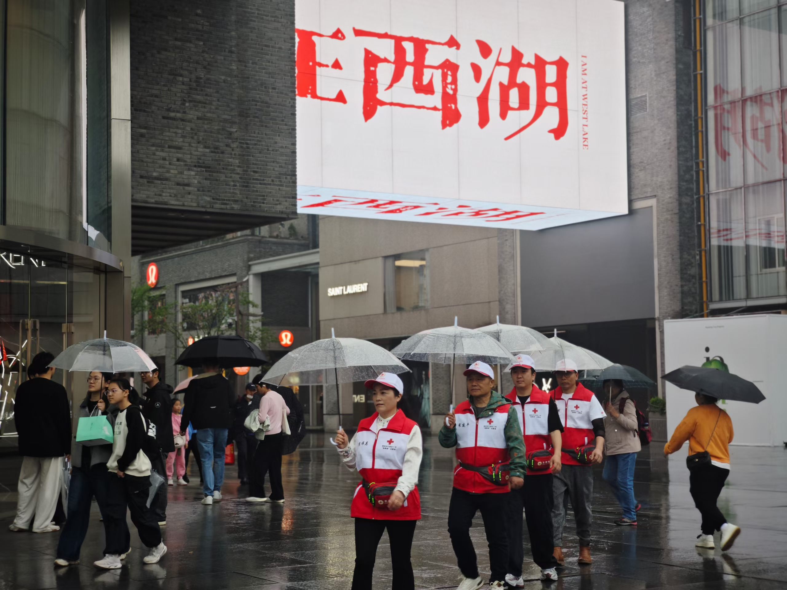 雨天的湖滨步行街,红十字“急救侠”始终坚守一线。 从早8点到晚8点,两小时一班轮班值守,风雨无阻巡逻护航。 每次上岗前都会开展岗前复训,强化应急联动,确保关键时刻拿得出、救得上、守得住。 一把伞温暖一座城。 北京游客雨天遇困,志愿者主动赠伞相助, 一把爱心伞、便民服务、平安巡逻, 用点滴善意撑起杭城的人文温度, 成为湖滨步行街最安心的红色风景❤️