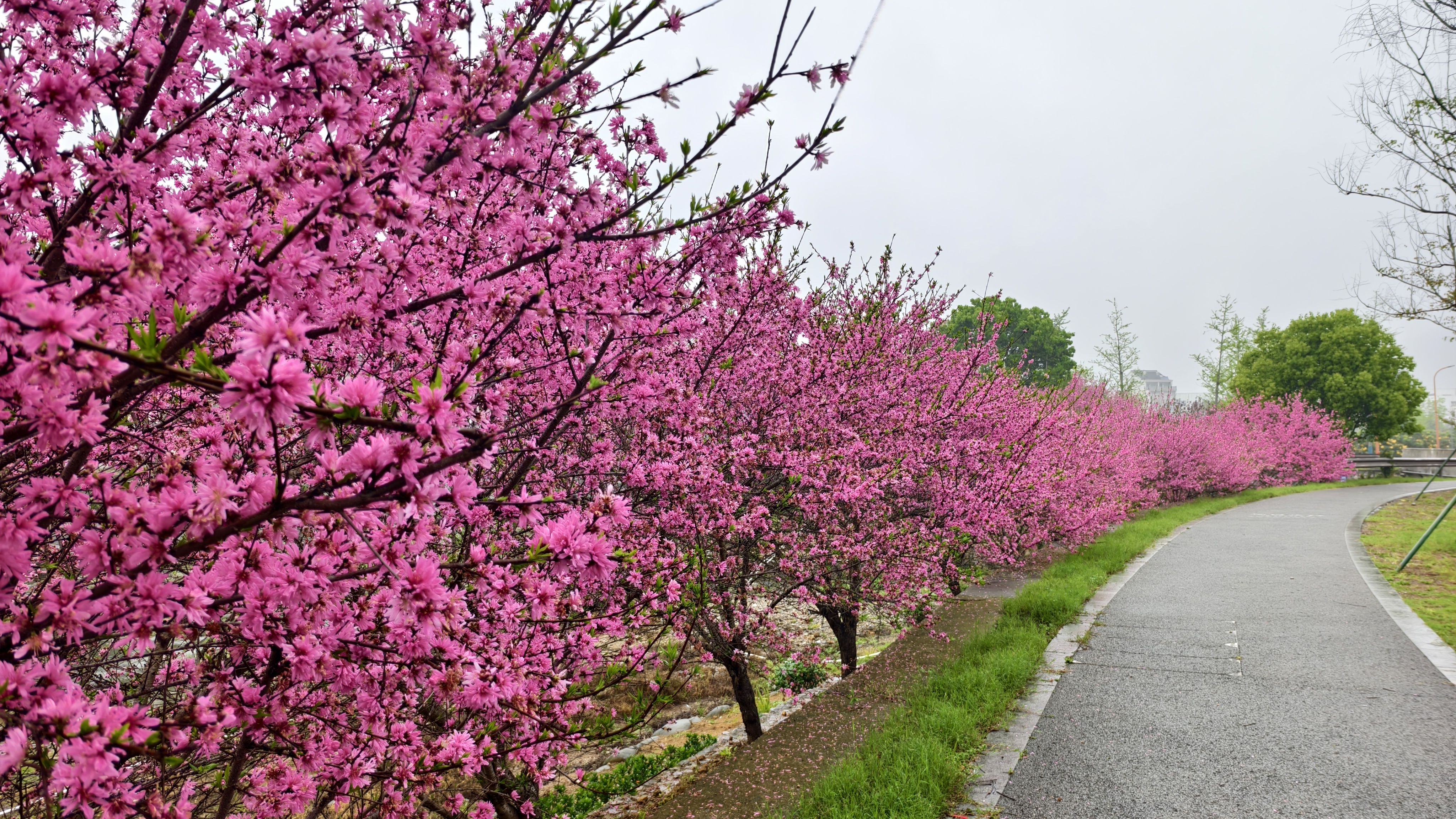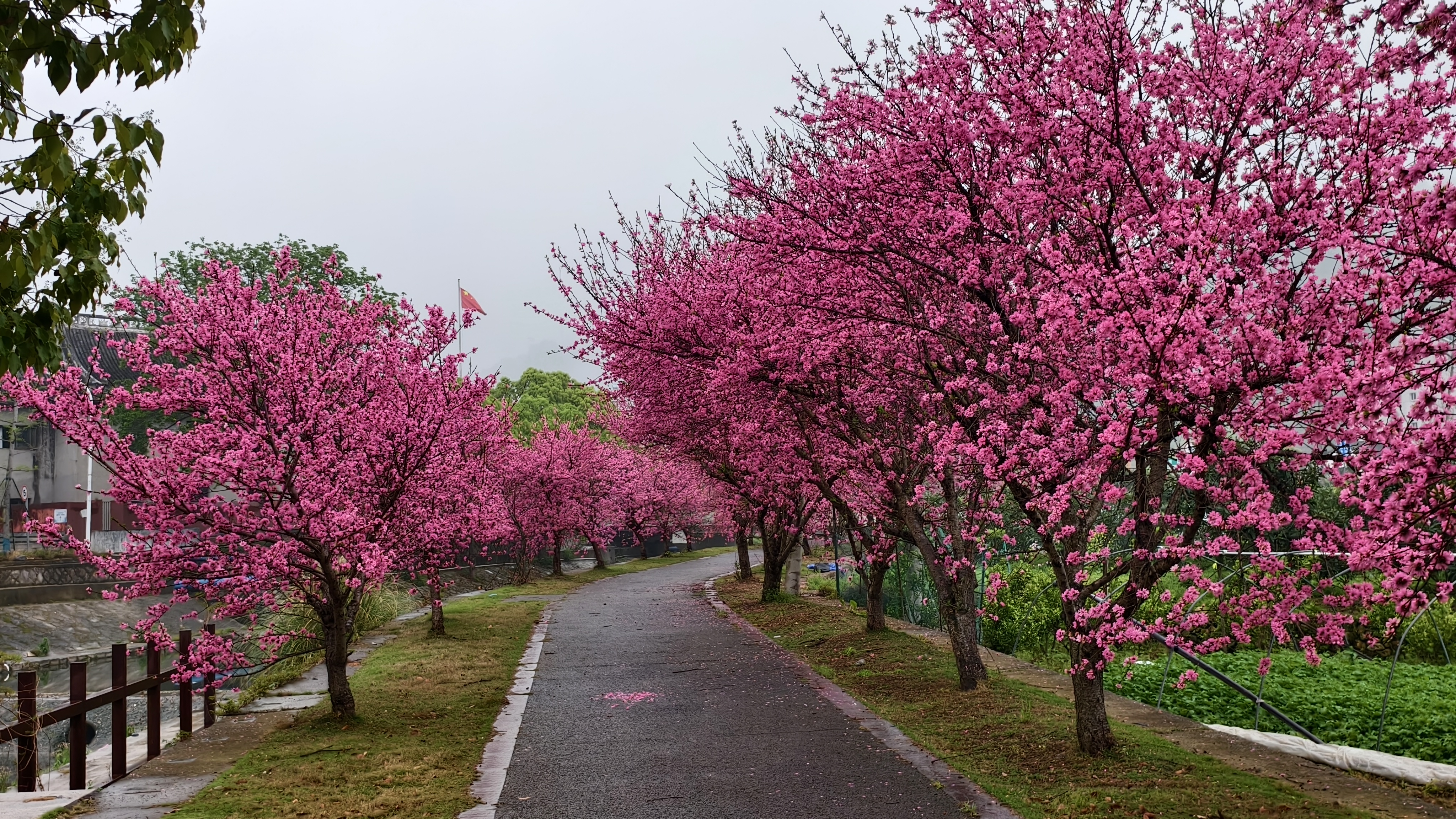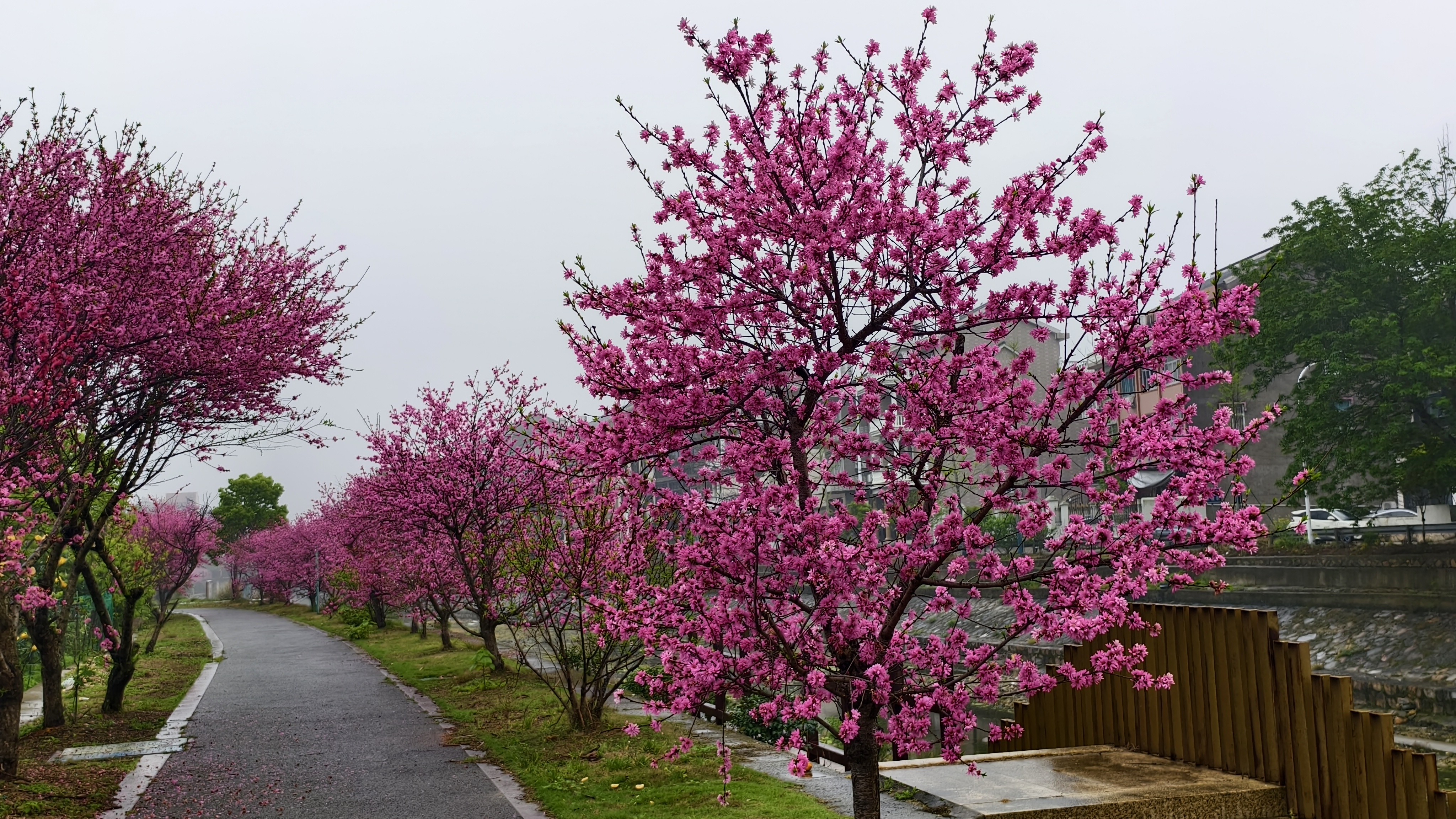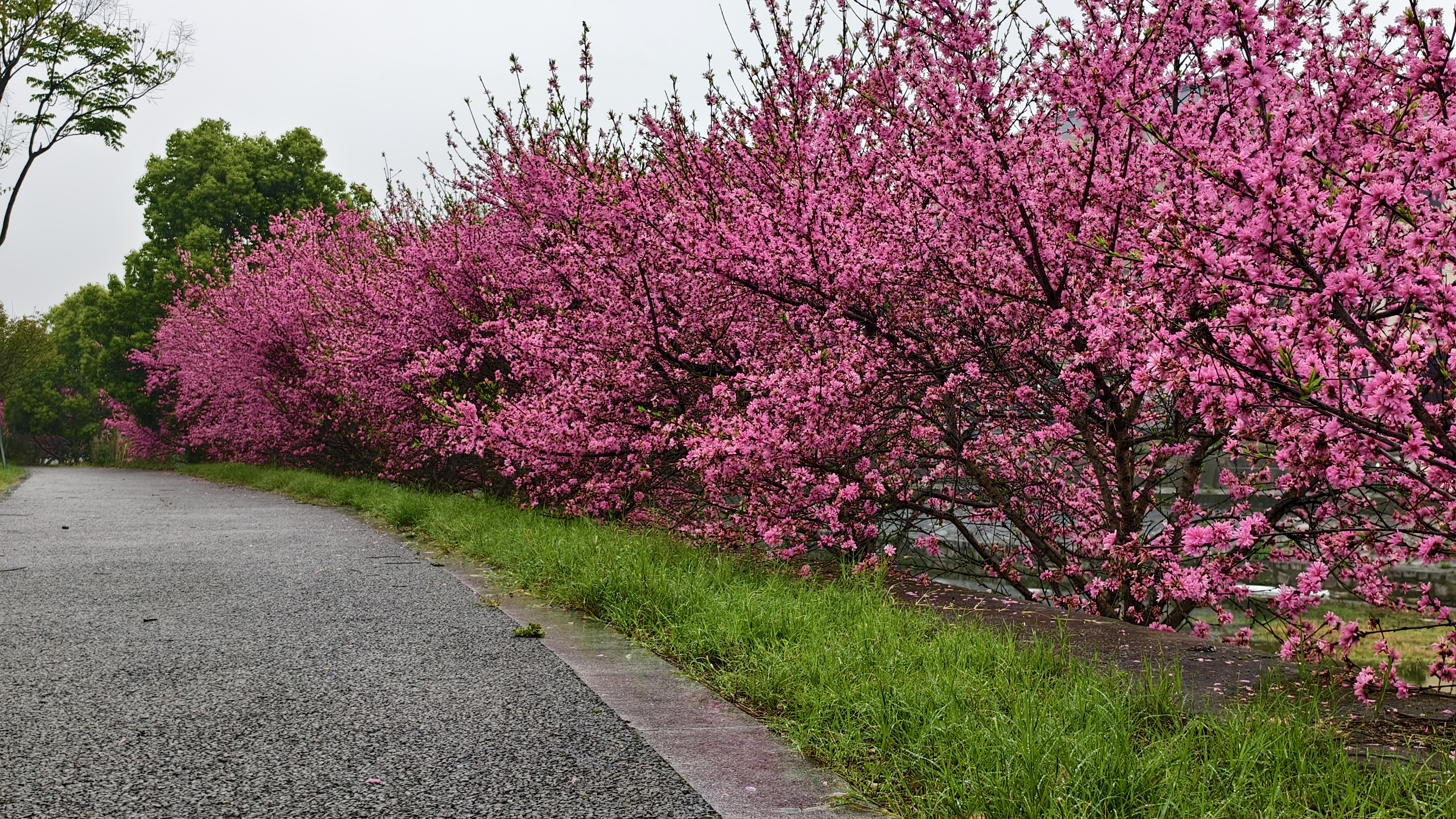 花溪荧光跑道边的菊花桃开得正艳,微雨中梨花带雨更显白净。