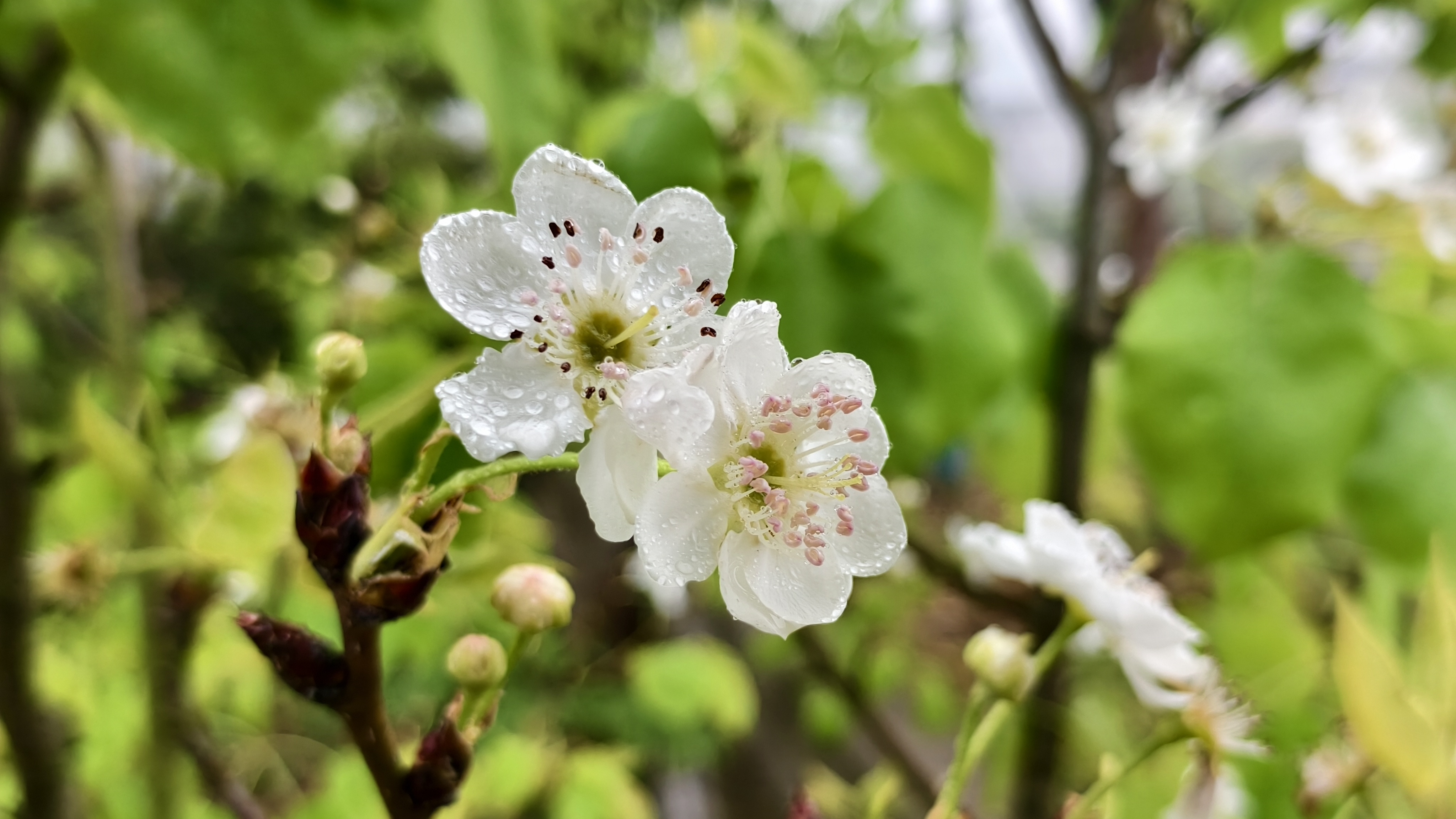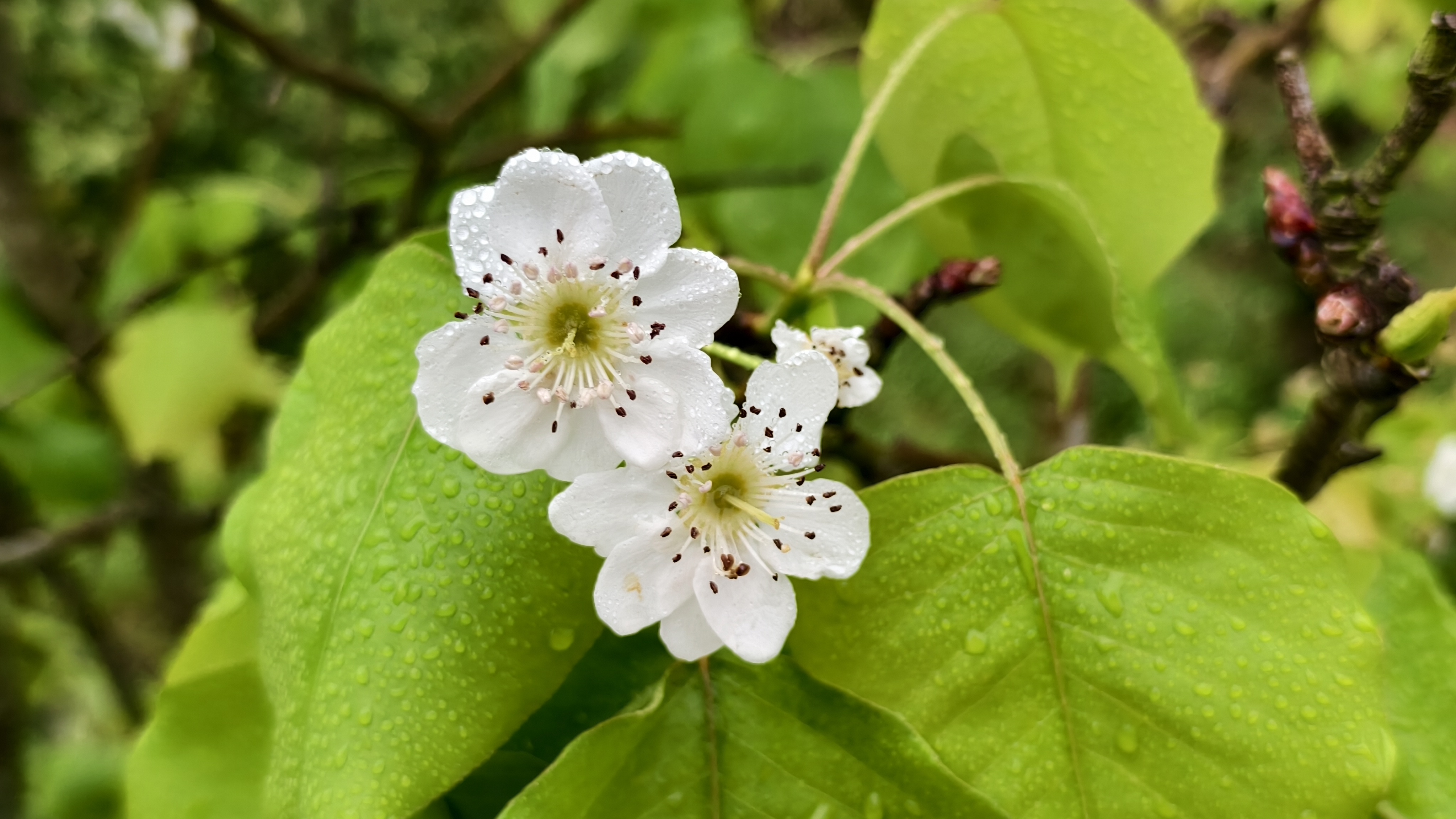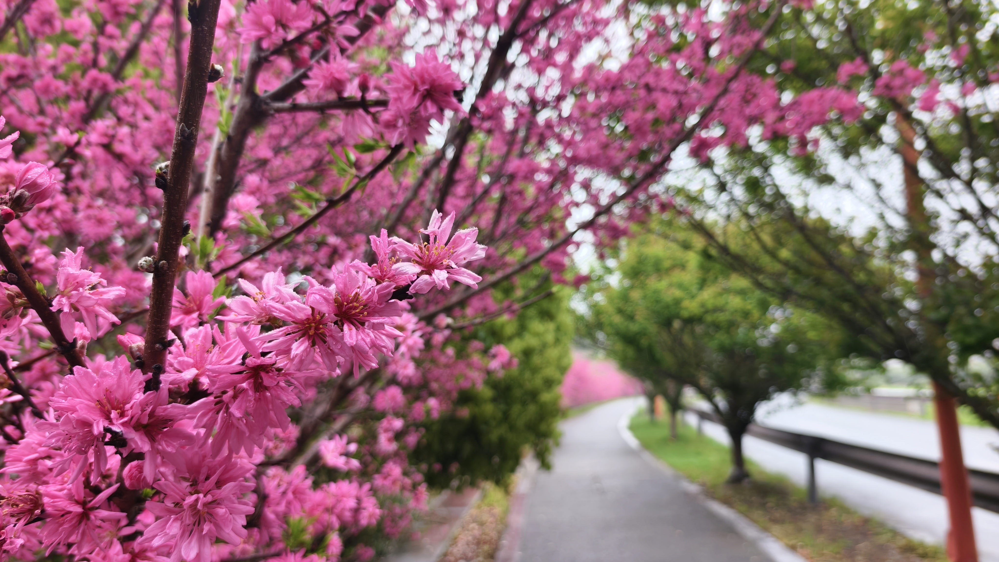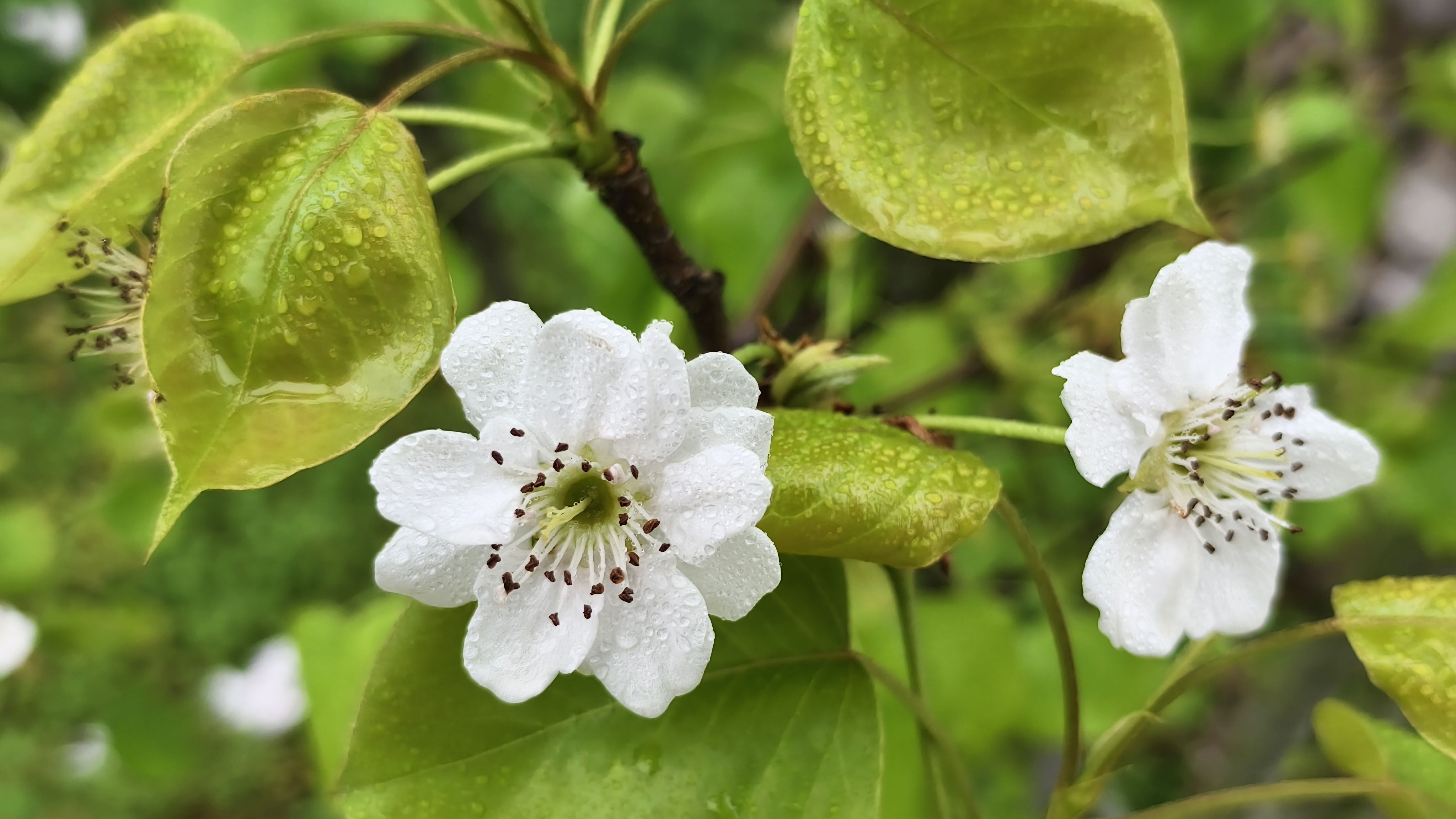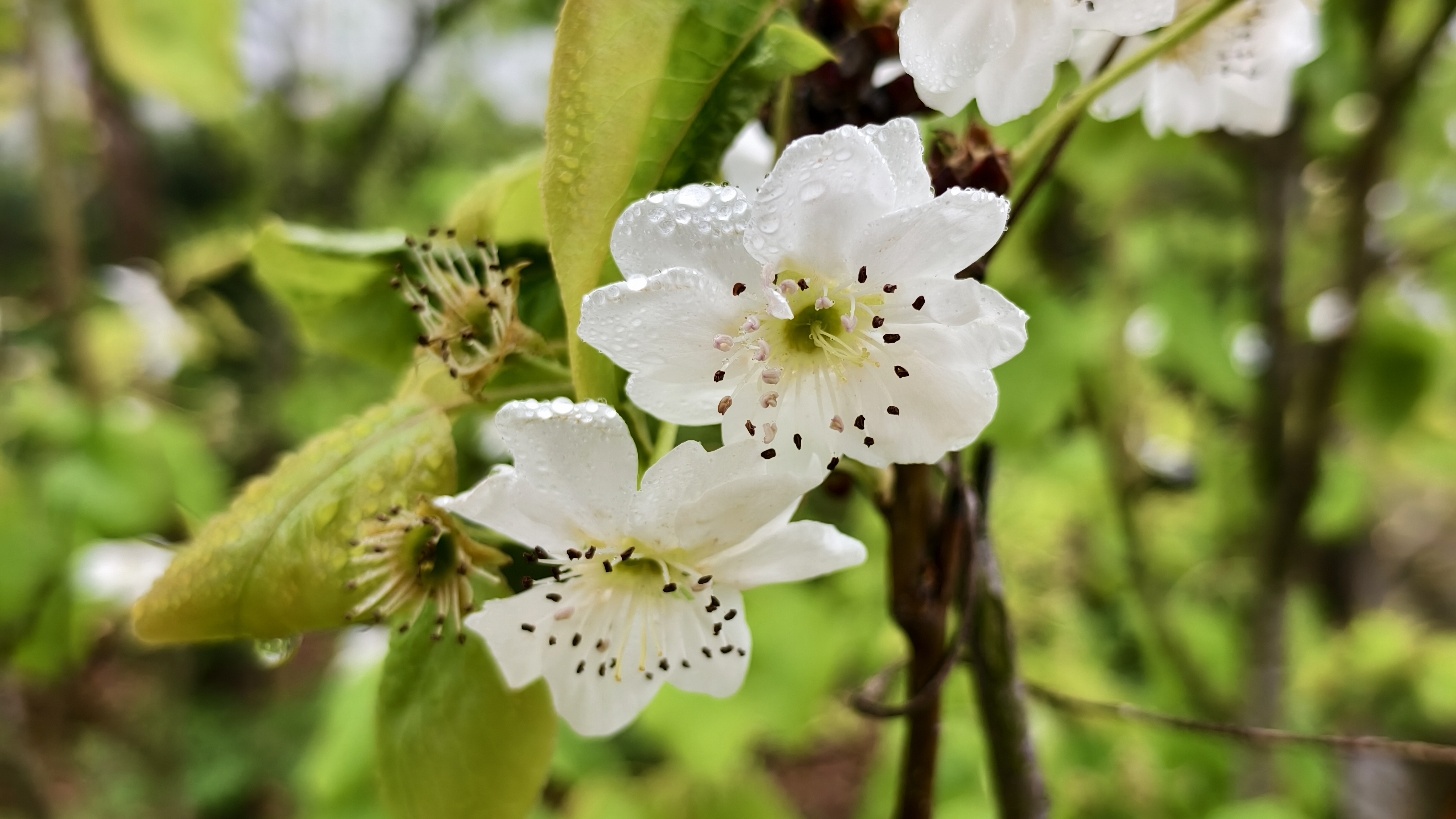 花溪荧光跑道边的菊花桃开得正艳,微雨中梨花带雨更显白净。