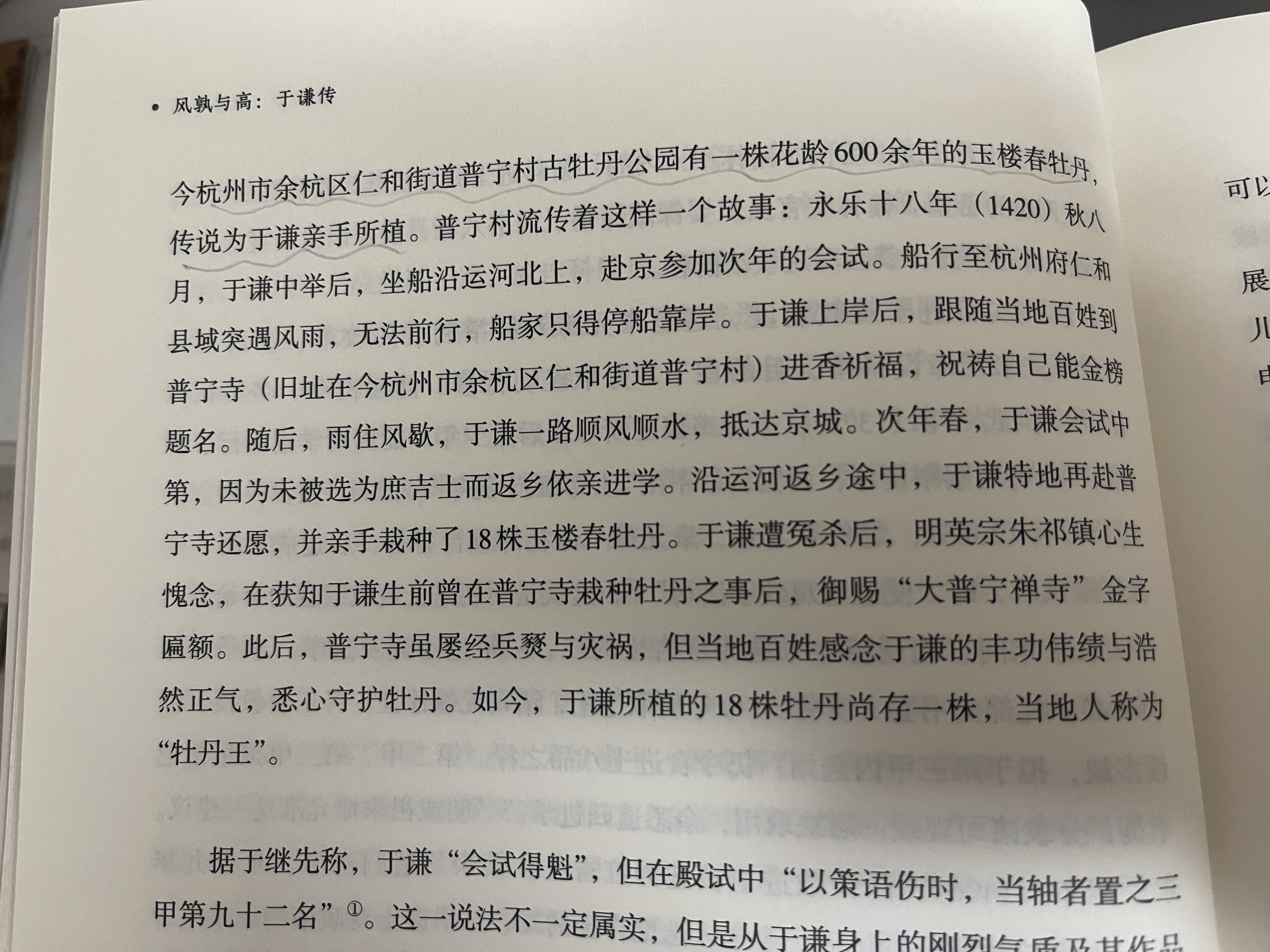 Day5: 今天继续阅读《风孰与高于谦传》。今天看到书中提到“杭州市余杭区仁和街道普宁村古牡丹公园有一株花龄600余年的玉楼春牡丹,传说为于谦亲手所植。”想起有个群里有人说去余杭看牡丹,那时我还纳闷为啥余杭会有个牡丹园,原来是因为于谦的缘故,又多了一个人文景点,这些天正好是赏牡丹的好时节,得抽空去看看,据说旁边还有于谦陈列馆,值得去看看。
