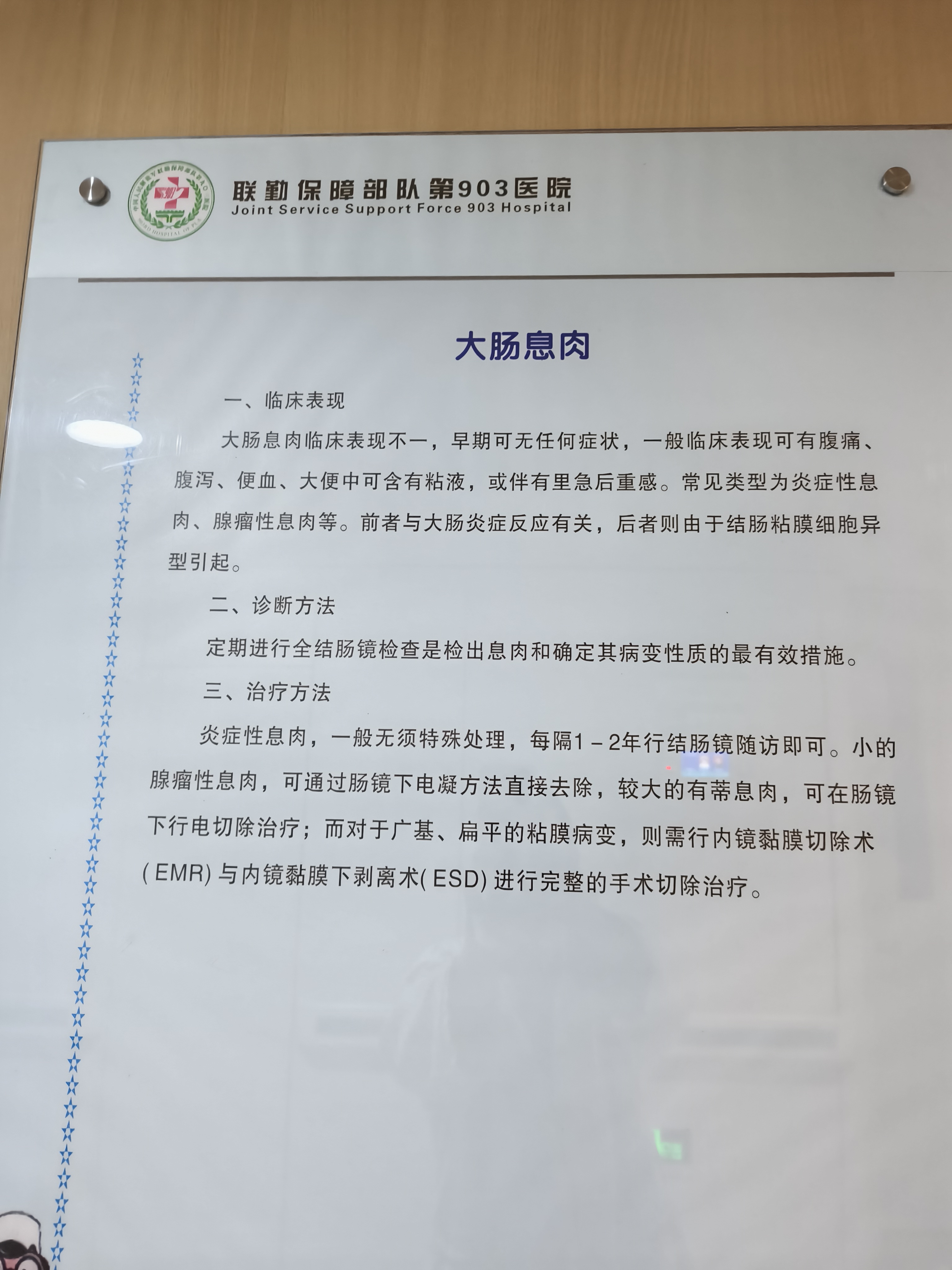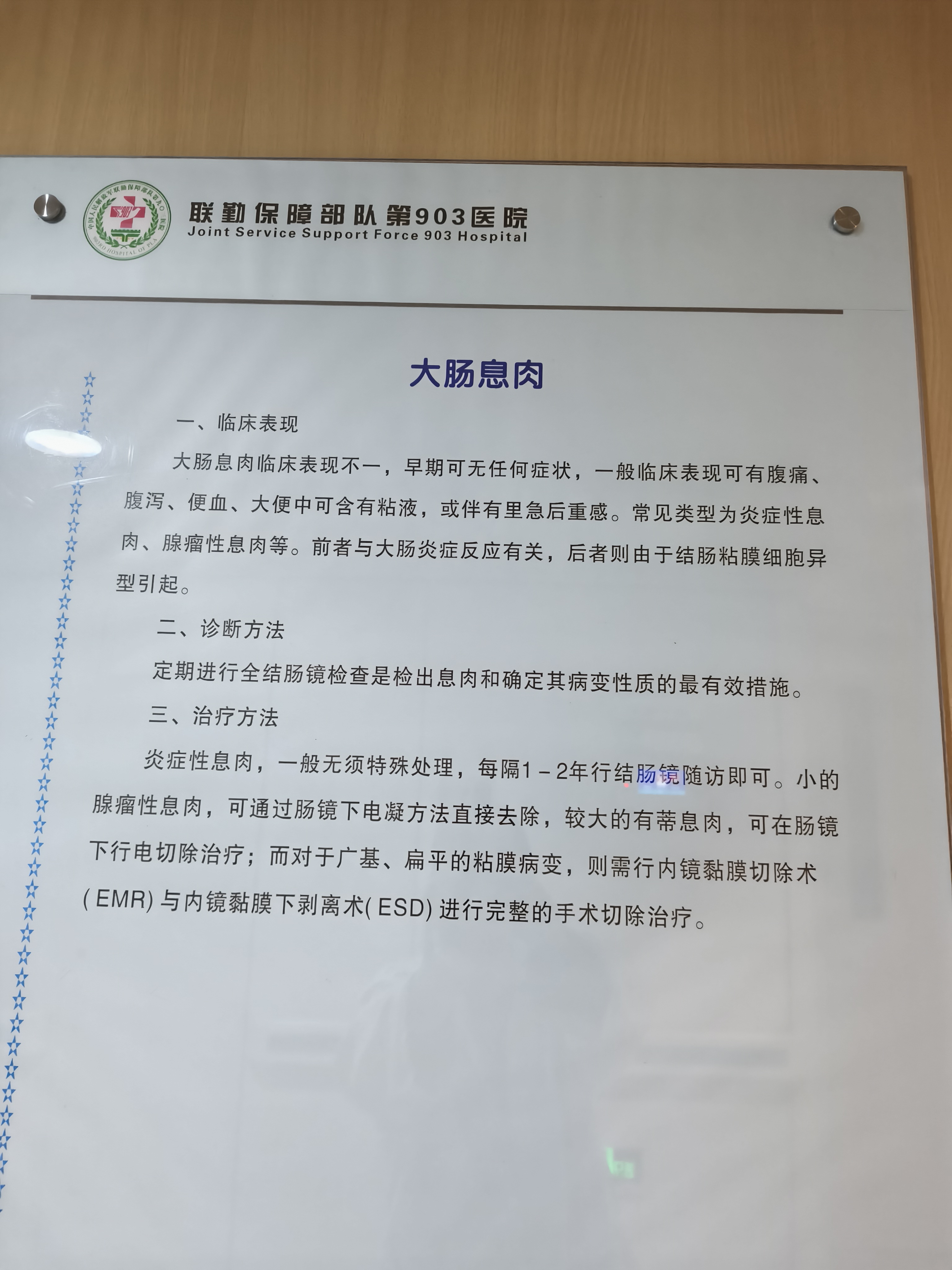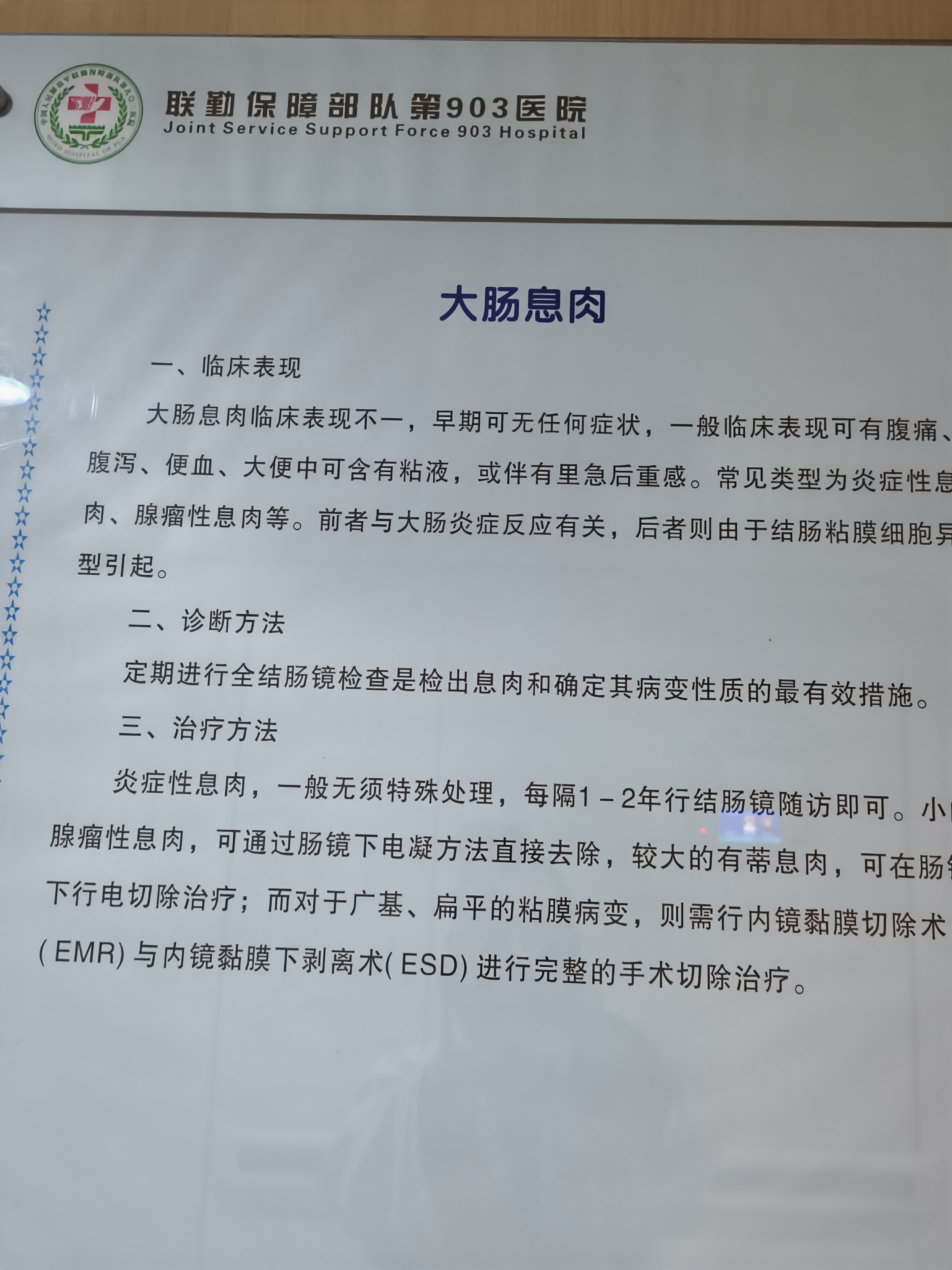 大肠息肉临床表现不一,早期可无任何痖状,一般临床表现可有腹痛,腹泻,便血,大便中可含有粘液,或伴有里急后重感。常见类型为炎症性息肉,腺瘤性息肉等。 定期进行全结肠镜检查是检出息肉和确定其病变性质的最有效措施。 炎症性息肉,无须特殊处理,1一2年进行结肠镜随访即可。小的腺瘤性息肉,可电凝方法去除,大的有蒂息肉,可行电切除治疗。