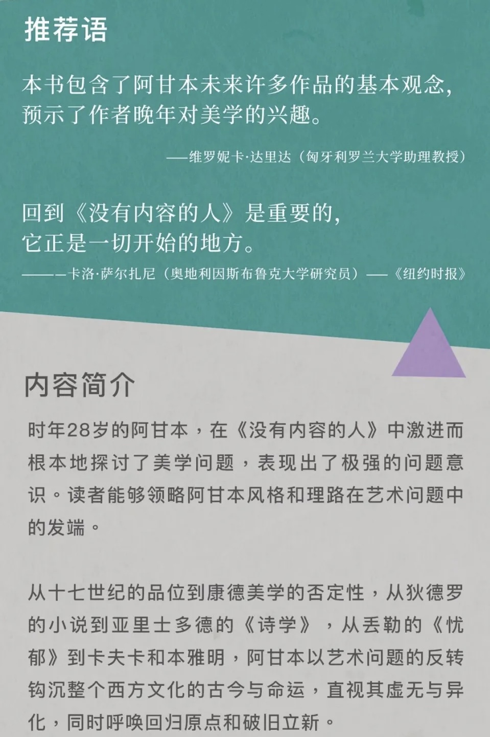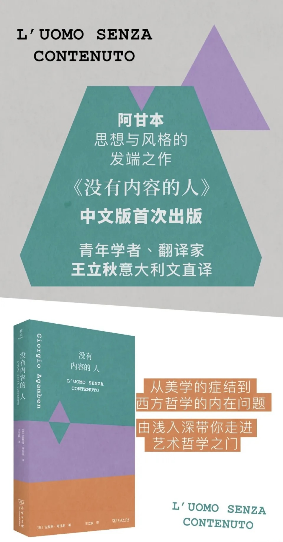 《没有内容的人》是潮新闻春风月榜2026年3月提名的好书之一 ,是意大利哲学家吉奥乔·阿甘本年仅28岁时出版的首部著作,也是一部系统探讨诗学和美学的奠基之作。在这部作品中,阿甘本以极具穿透力的批判眼光,揭示了现代艺术与审美经验面临的深刻危机,其锋芒和洞见至今仍不过时。 🎨 核心内容与思想脉络 阿甘本指出,美学在17世纪作为一门独立学科出现后,非但没有成为艺术的“避难所”,反而导致了一场深刻的“美学毁灭”。他详细追溯了艺术从古希腊到现代的变迁,梳理了“艺术家与旁观者”、“天才与趣味”、“形式与内容” 等关系的根本断裂。 🗝️ 主要论题与关键隐喻 · 审判者的诞生与艺术家的流放:阿甘本认为,问题根源在于现代美学催生了两个分裂的角色。“有趣味的人”(旁观者)凭借“无私趣”的审美标准对作品进行评判,而艺术家则被孤立到美学领域,创作日益内在化,最终沦为内心空洞的“没有内容的人”。 · “美术馆剧场”与“炼金术剧场”:这是书中解释现代艺术困境的核心隐喻。前者指作品脱离原生土壤,在博物馆白墙内沦为“有趣”但无生命的标本;后者指艺术家将创作变为追求纯粹形式的魔法,使作品与生活割裂。 · 从“神圣恐怖”到“审美趣味”:现代艺术失去了古希腊时期那种让人“神圣恐怖”的力量。如今的艺术被规训为纯粹审美对象,我们丧失了与之真实碰撞的能力。 📚 评价与影响 作为阿甘本庞大思想体系的“种子”,这部早期作品奠定了其批判现实的“发生研究”方法。由于其学术性与“硬核”程度,阅读体验常被形容为“阅读的痛苦”。读者需警惕其强烈的海德格尔色彩与对“词源学”的依赖,但恰是这种未完成的激进性使其成为理解阿甘本思想的重要入口。 大家还可以结合阅读阿甘本的《诗节》《婴儿期与历史》等早期著作,来更全面地理解他的思想轨迹。 📖 延伸阅读与版本信息 如果大家对这本书感兴趣,这里有一些版本和背景信息供参考: · 中文版本:目前主要有两个中译本,其译者与出版时间各不相同。 · 杜可柯译本:2015年由“仅供内部参考学习”发行,共139页。 · 王立秋译本:2025年由商务印书馆全新出版,共224页,内容上较旧版更为完整(这次春风月提名的就是此版本) 《没有内容的人》是一份来自青年阿甘本的“美学诊断书”,它以毁灭性的批判为起点,帮助我们重新思考艺术与人的本质关联。希望这份导览能帮大家更好地进入这部作品,如果友友们对书中某个具体概念感兴趣,也欢迎和我继续探讨哦~