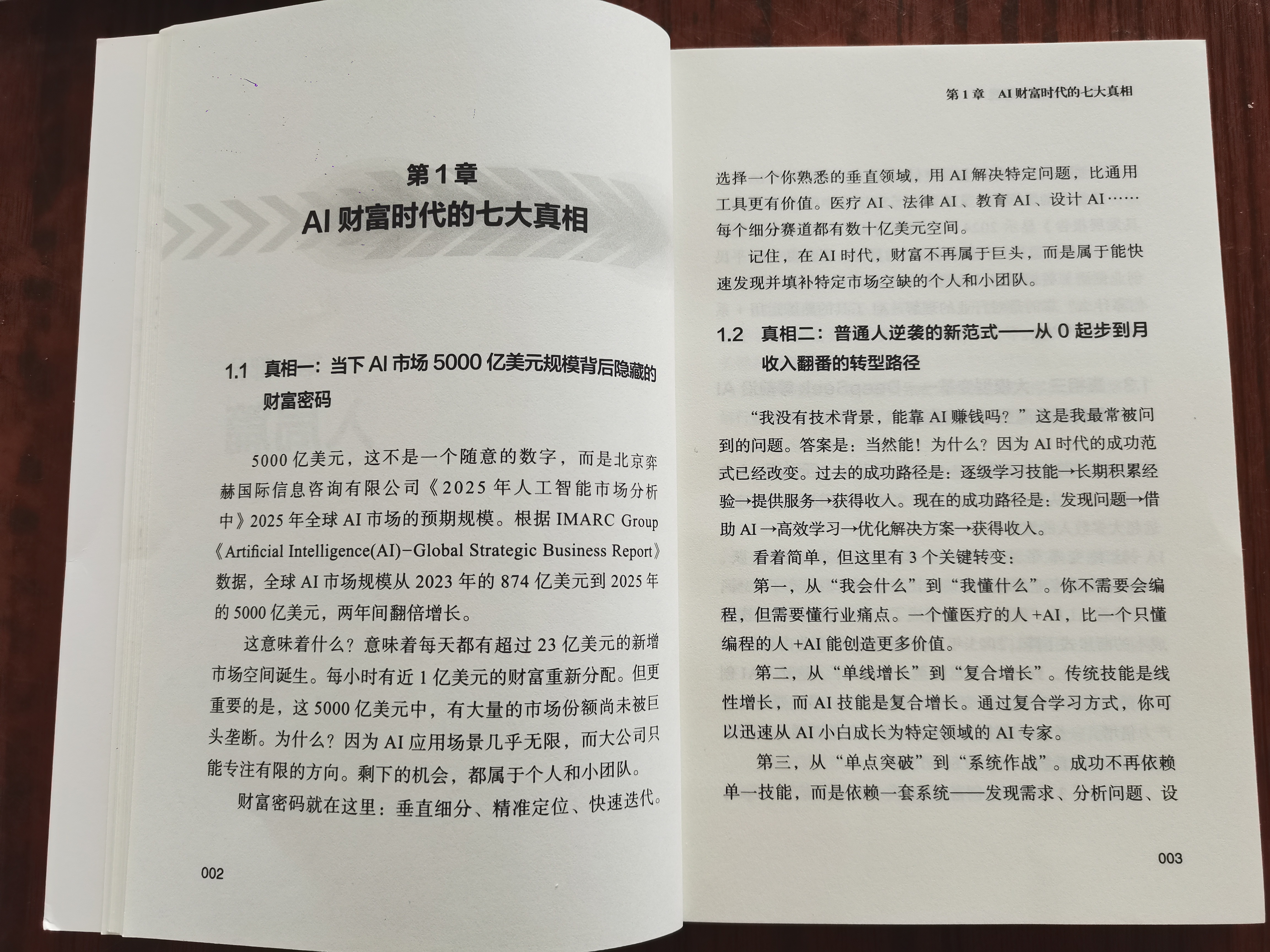 开始都这本书,启动赚钱模式!🤭 《用AI做副业赚钱》第一章核心内容及阅读理解: 一、AI财富时代七大真相 真相一:AI市场5000亿美元规模的财富密码 2025年全球AI市场规模预计达5000亿美元,较2023年874亿美元两年翻倍,每日新增超23亿美元市场空间,每小时近1亿美元财富重新分配。AI应用场景无限,大公司无法垄断全部市场,剩余机会归属于个人和小团队,核心财富逻辑是垂直细分、精准定位、快速迭代。 真相二:普通人逆袭的新范式 无技术背景也能靠AI赚钱,AI时代成功路径已革新。旧路径为“逐级学技能→长期积累→提供服务→获收入”;新路径是“发现问题→借助AI→高效学习→优化方案→获收入”,核心是打破技术门槛,普通人可凭行业认知实现收入翻番。 真相三:大模型变革重构创富生态 以DeepSeek等前沿大模型为代表的技术变革,正重塑商业与创富逻辑。大模型从技术工具变成核心生产力,不仅提升效率,更能创造全新商业场景,成为普通人AI副业的核心抓手与破局关键。 真相四:无代码起步,零技术驾驭AI 普通人无需学习编程代码,可通过九大无代码入门工具快速上手AI。这些工具可视化操作、门槛极低,能让零基础人群直接对接AI能力,开启AI副业实践。 真相五:筛选AI工具的6大决策法则 高投资回报的核心是选对工具,需从实用性、性价比、兼容性、更新频率、社区支持、安全合规6个关键指标筛选AI工具。精准选工具,能大幅降低试错成本,提升副业效率。 真相六:分辨AI创业陷阱与红利 AI时代既有真实红利,也存在泡沫陷阱。需精准识别伪风口、虚假收益承诺、过度营销等陷阱,抓住垂直领域落地、AI工具赋能、需求匹配这三大真实红利,避免踩坑。 真相七:AI时代重新定义个人竞争力 AI时代个人竞争力不再是单一技术能力,而是行业经验+AI工具+商业思维的复合能力。学会用AI放大自身专业价值、搭建商业系统,才是核心竞争力,也是普通人逆袭的核心底气。 二、阅读理解 本章核心是打破“AI是技术精英专属”的认知误区,明确七大真相的核心逻辑:AI时代是普通人的财富窗口期,市场规模爆发带来海量机会,大公司无法覆盖所有细分场景;普通人无需技术背景,借助无代码工具、选对AI工具、立足垂直领域,用行业经验+AI工具放大价值,搭建商业系统,就能实现AI副业增收。核心行动指南是:立足自身优势领域,用AI解决具体问题,避开陷阱、精准选工具,构建复合竞争力,抓住AI时代红利。