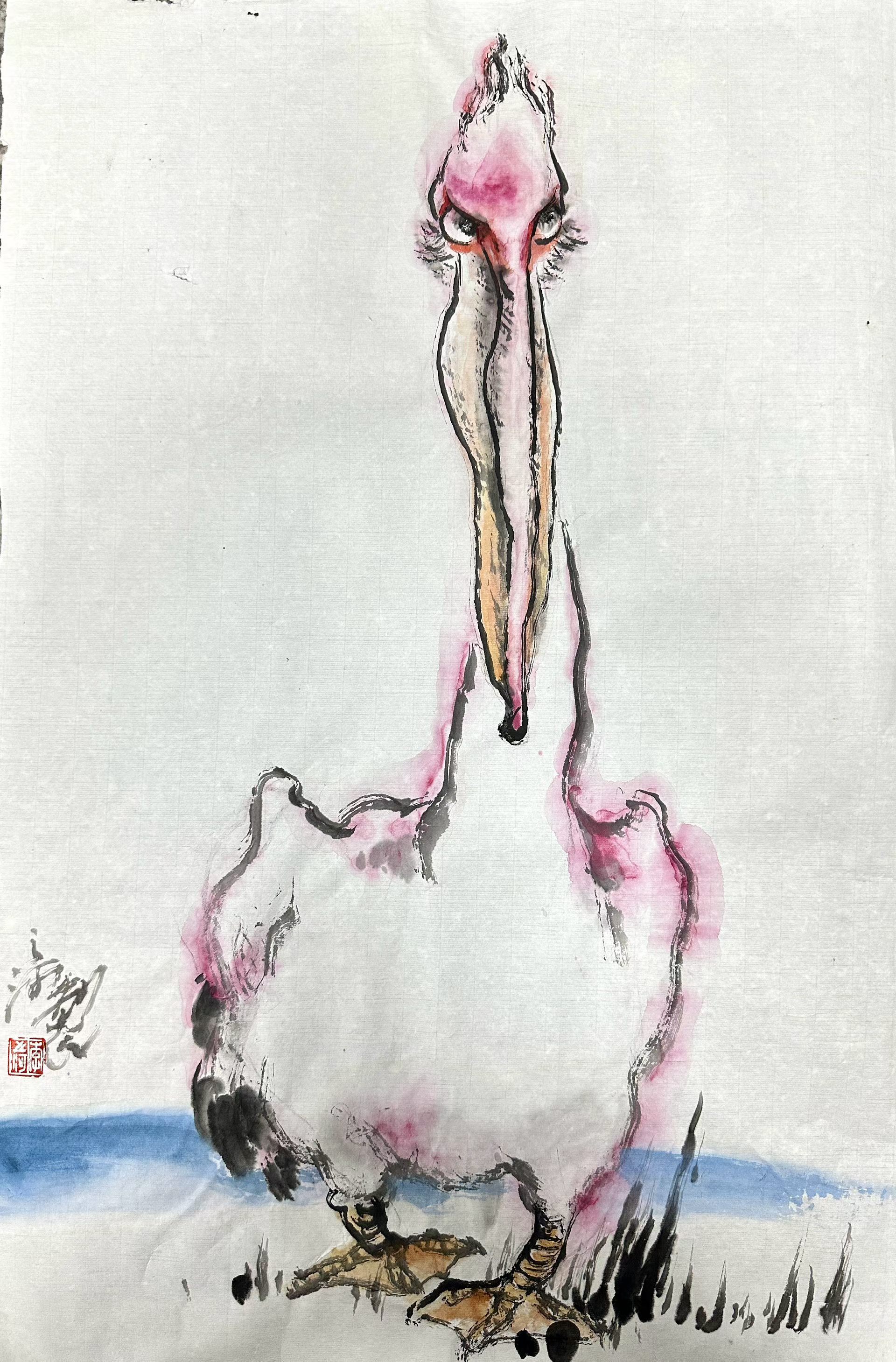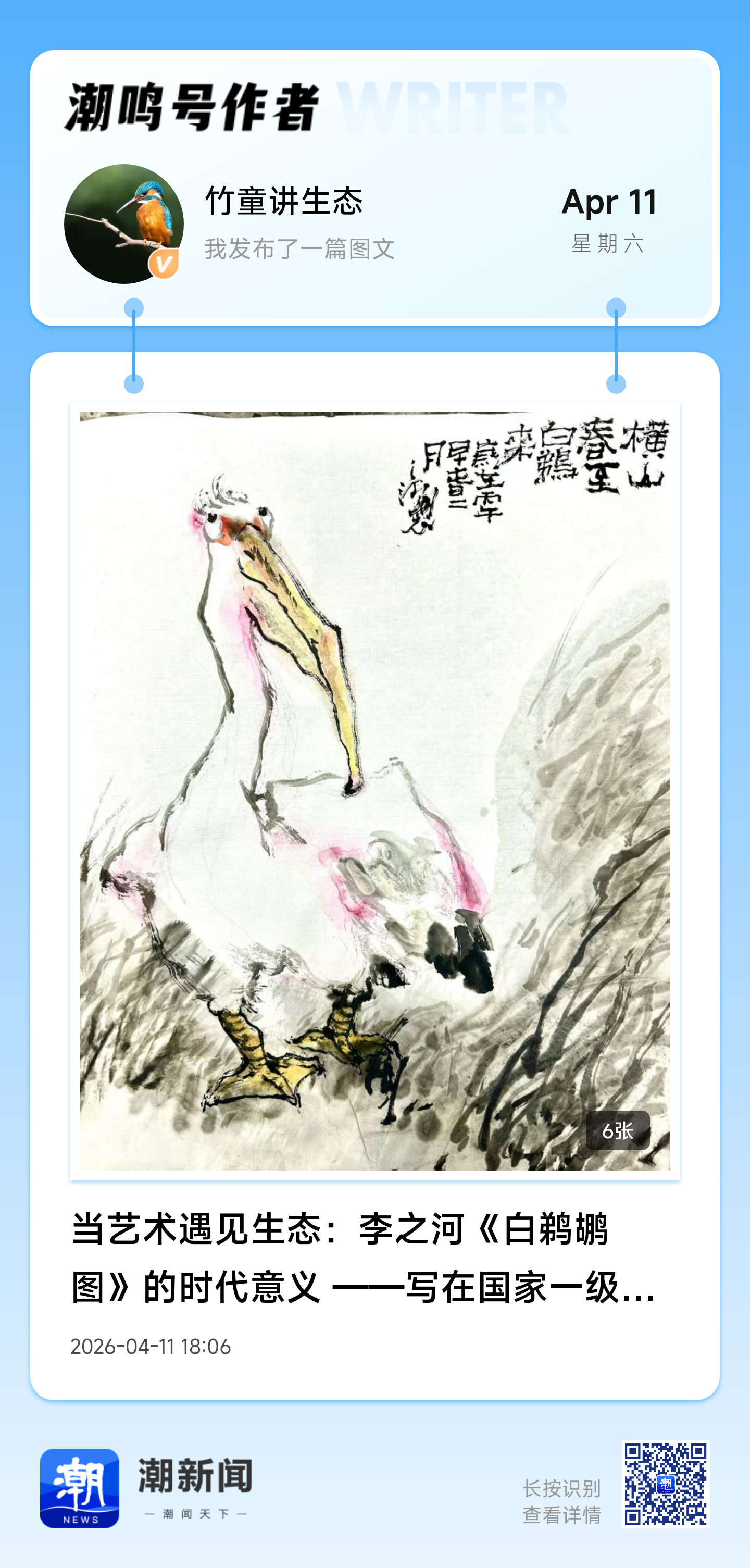 从快门到笔墨:一场关于生态守护的"艺术接力" ——《白鹈鹕日记》第五篇 横山漾的晨雾还未散尽,长枪短炮的阵列已在水岸排开。这是白鹈鹕现身湖州的第八天,来自全国各地的摄影师仍络绎不绝——最多时四十余位摄影师同时蹲守,只为捕捉那对"网红鸟"展翅的刹那。而在镜头之外,另一场更为静穆的创作正在发生。 李之河先生今天又画了一幅。 继昨日首幅《白鹈鹕图》引发美术界关注后,这位湖州人物画领域的"老资格"再度挥毫。两幅作品,两种姿态:第一幅是伫立凝思的特写,第二幅则是对望交流的温情。笔墨愈发酣畅,情感愈发浓烈——这已不仅是艺术创作,更是一位老艺术家对生态议题的连续发声。 一、为什么是"连续创作"? 熟悉李之河的人都知道,这位1958年生于湖州、1993年即加入中国美术家协会的资深艺术家,也是湖州第一位参加中国美协的画家,向来以严谨著称。他的艺术履历堪称厚重:从早年荣获"鲁迅版画奖"(80-90年代优秀版画家),到作品连续入选第七、九、十、十一届全国美展;从2007年被浙江省文联推选为"浙江版画名家",到2017年受中国美协派遣赴巴黎艺术城研修——每一步都踏实而审慎。 如此资深艺术家,为何对白鹈鹕题材"连画两幅"? 答案或许藏在横山漾的现场。当我们看到那些照片:摄影师们或蹲伏于油菜花丛,或架设于配电箱旁,长焦镜头如望远镜般齐刷刷指向水面——这种全民关注的热情,需要被艺术"定格"并"升华"。李之河深知,摄影记录的是瞬间,而绘画承载的是永恒;快门捕捉的是外形,笔墨传递的是灵魂。 二、用独特的笔墨语言表达想法 有趣的是,李之河先生的创作以丰富的笔墨语言和丰富的造型能力形成了微妙呼应。那些在水墨中晕染的粉色——既保留了白鹈鹕的物种特征,又赋予其近乎图腾般的象征意味——何尝不是一种"艺术生态"?最底层是对生物多样性的关切,中间层是对江南水乡的眷恋,最表层则是艺术家对时代议题的敏锐捕捉。 这种"不写实"的变形处理,恰恰打破了"生态艺术必须写实"的窠臼。当那只夸张变形的鹈鹕头颅从宣纸中探出,观者感受到的不是解剖学的精确,而是生命的尊严与脆弱。这正是艺术的独特力量:它不必像科普图鉴那样准确,却能在情感深处种下守护的种子。 三、"生态合伙人"的艺术维度 湖州正在推进的"生态合伙人"计划,在此刻显现出更深层的意义。当专业摄影师用镜头构建视觉档案,当李之河这样的资深艺术家用笔墨创造文化符号,当志愿者团队提供科研支持——这种"知识化、专业化、有社会影响力"的多元协作,正在重塑“在湖州看见美丽中国”湖州生态保护的公众参与模式。 值得强调的是,李之河的"带头"并非一时兴起。作为原湖州市美协副主席、浙江省中国人物画研究会艺委会委员,他的创作具有示范效应。当一位曾以版画闻名、后又深耕水墨的老艺术家,愿意连续两日伏案创作同一题材,这本身就是一种"艺术宣言":生态保护不是某个群体的专职,而是整个社会的共同事业。 四、从横山漾到美术馆:一段未完成的旅程 两幅《白鹈鹕图》的命运引人遐想,或许将被某个机构收藏,成为湖州生态治理的见证;又或许将通过数字传播,抵达比四十位摄影师更广阔的受众。 无论如何,它们已经完成了最重要的使命:证明艺术可以成为生态保护的"扩音器"。在短视频和直播的今天,一幅水墨画的传播速度或许不及手机随手拍,但其文化穿透力却能跨越时空。当未来的观众在美术馆中驻足,他们看到的不仅是一只2026年春天造访湖州的水鸟,更是一个时代对人与自然关系的思考。 心愿 横山漾的水面终将恢复平静,白鹈鹕也将继续它们的迁徙之旅。但李之河的笔墨留下了。从第一幅到第二幅,从试探到酣畅,这位老艺术家用连续创作诠释了什么是"艺术参与"——不是旁观,不是点缀,而是全身心投入时代议题的真诚表达。 我们期待第三幅、第四幅……更期待在李之河的感召下,有更多画家、雕塑家、设计师加入这个行列,特别是年轻一代学生的加入。当艺术成为生态保护的媒介,当美术馆成为环保教育的课堂,那只横山漾的白鹈鹕,便真正飞进了人们的心里,并将在文化中永生。 【附记】 本文照片摄于2026年4月12日上午,横山漾现场。全国各地摄影师持续聚集,最多时达四十余人。李之河先生当日完成第二幅白鹈鹕创作,采用水墨设色,延续"夸大变形"的艺术处理,进一步强化了对野生鸟类保护的主题表达。