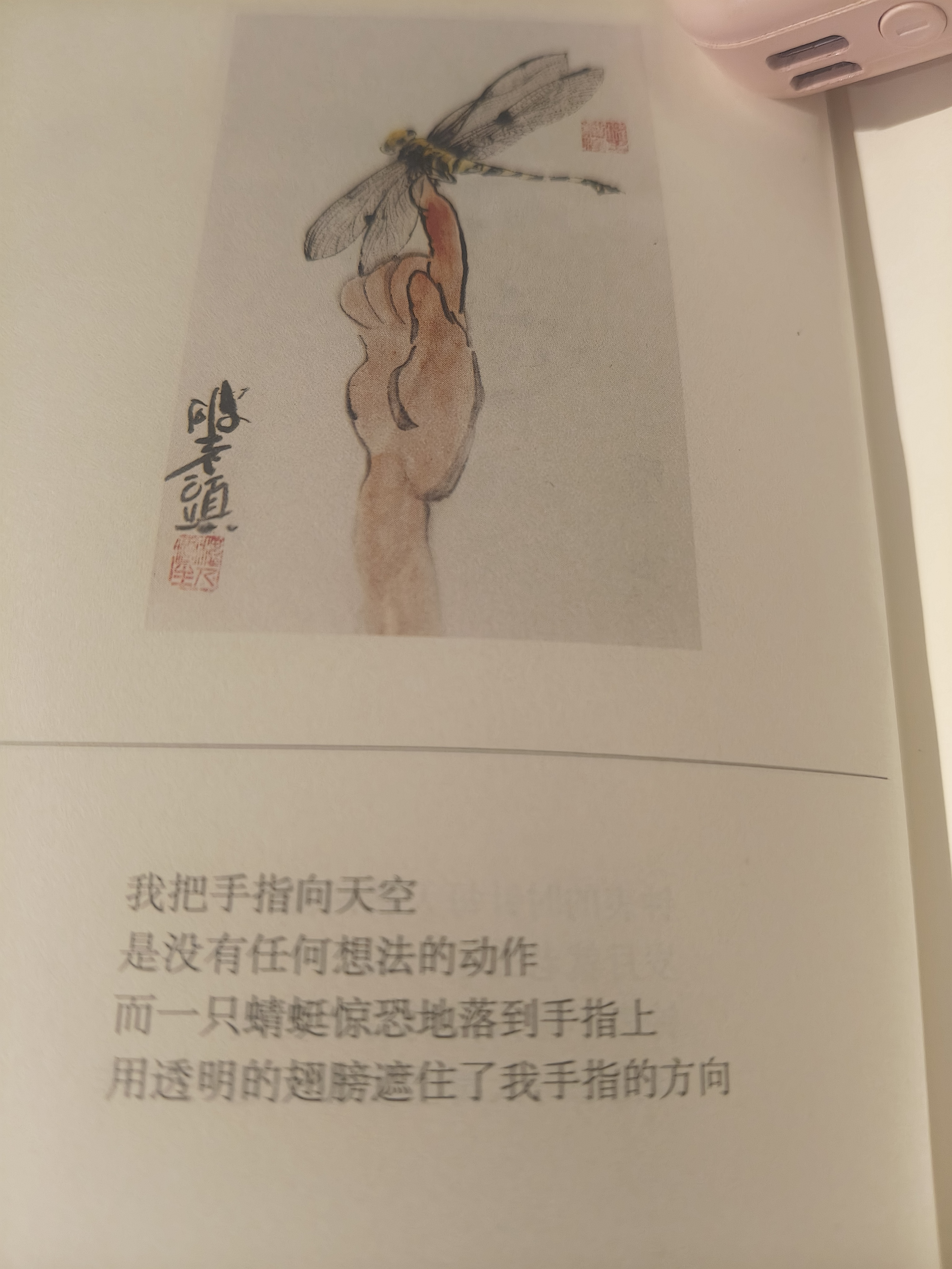 我把手指向天空,是没有任何想法的动作。而一只蜻蜓惊恐的落到手指上,用透明的翅膀遮住了我手指的方向。 蜻蜓遮住的是什么呢?这个留白太气魄了。