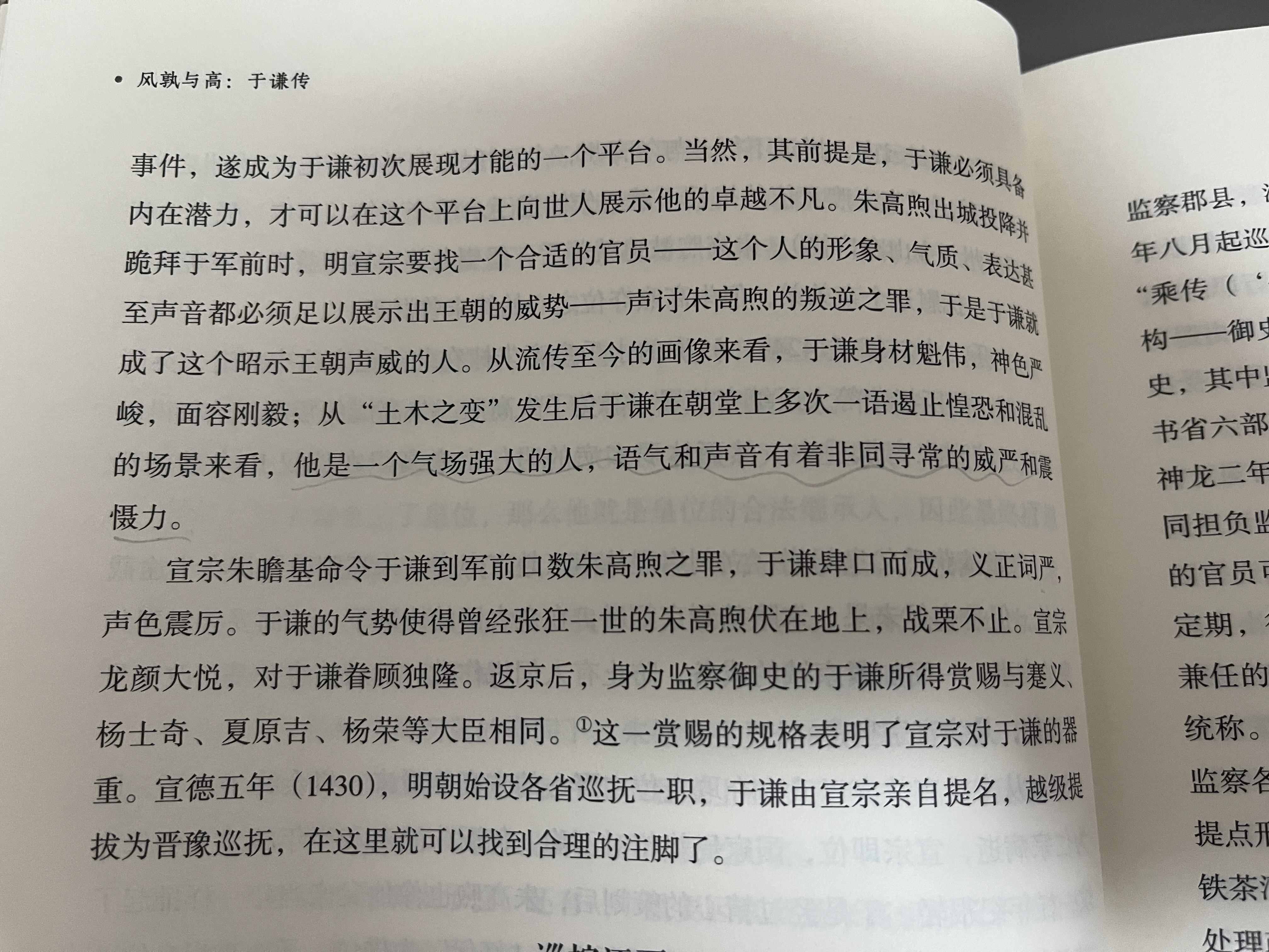 Day6: 今天继续阅读《风孰与高于谦传》。今天看了于谦是在“高煦之乱”时期开始被皇上重用。这一节收获有二,第一是通过这一节清晰了明朝朱棣及儿孙三代的登基秩序,第二是于谦抓住了皇上给的机会,表现出皇帝期望的形象,大气强、有震慑力,开启了人生顺途。这也说明只有自己准备好了,才不会浪费机遇。