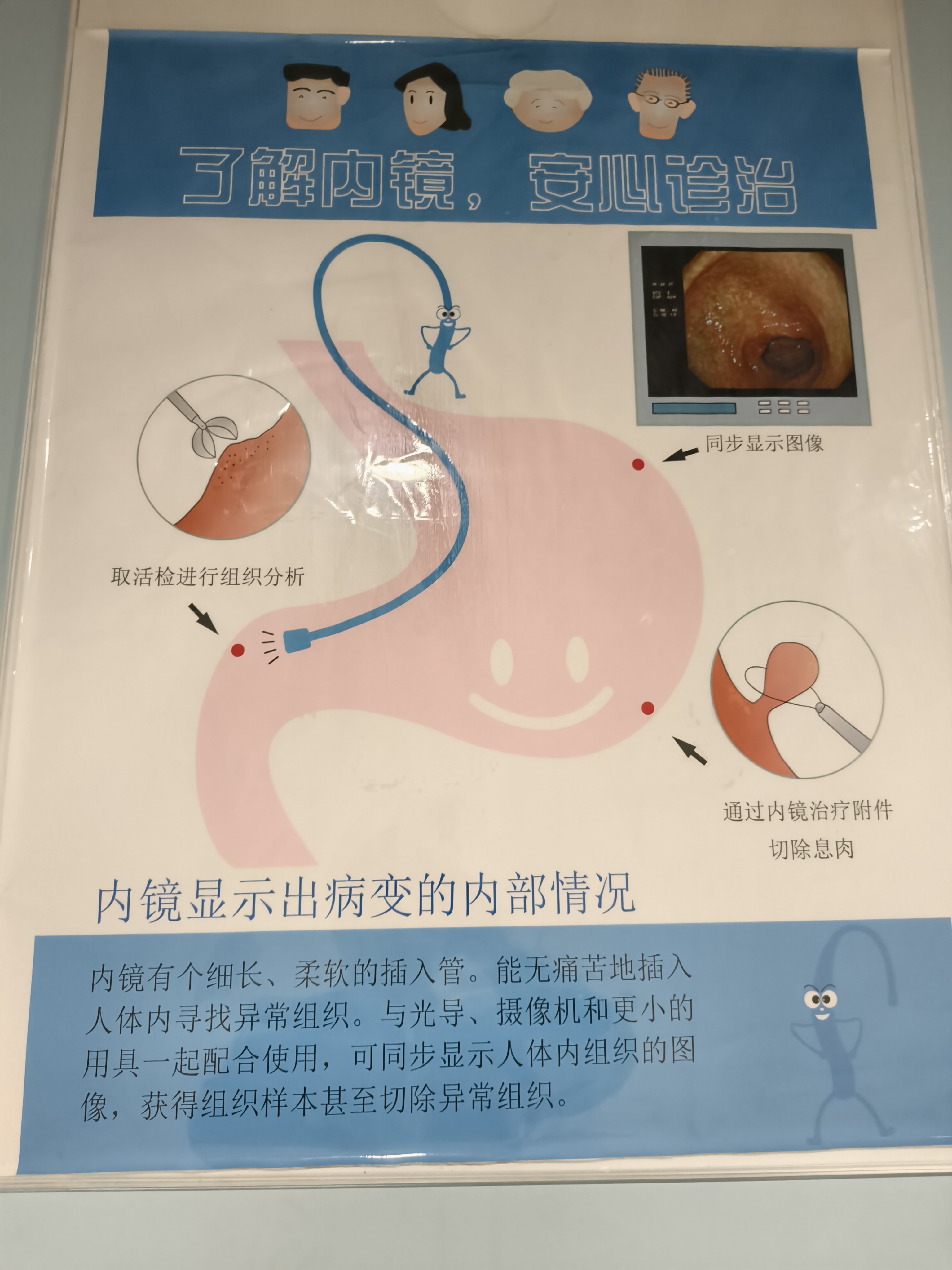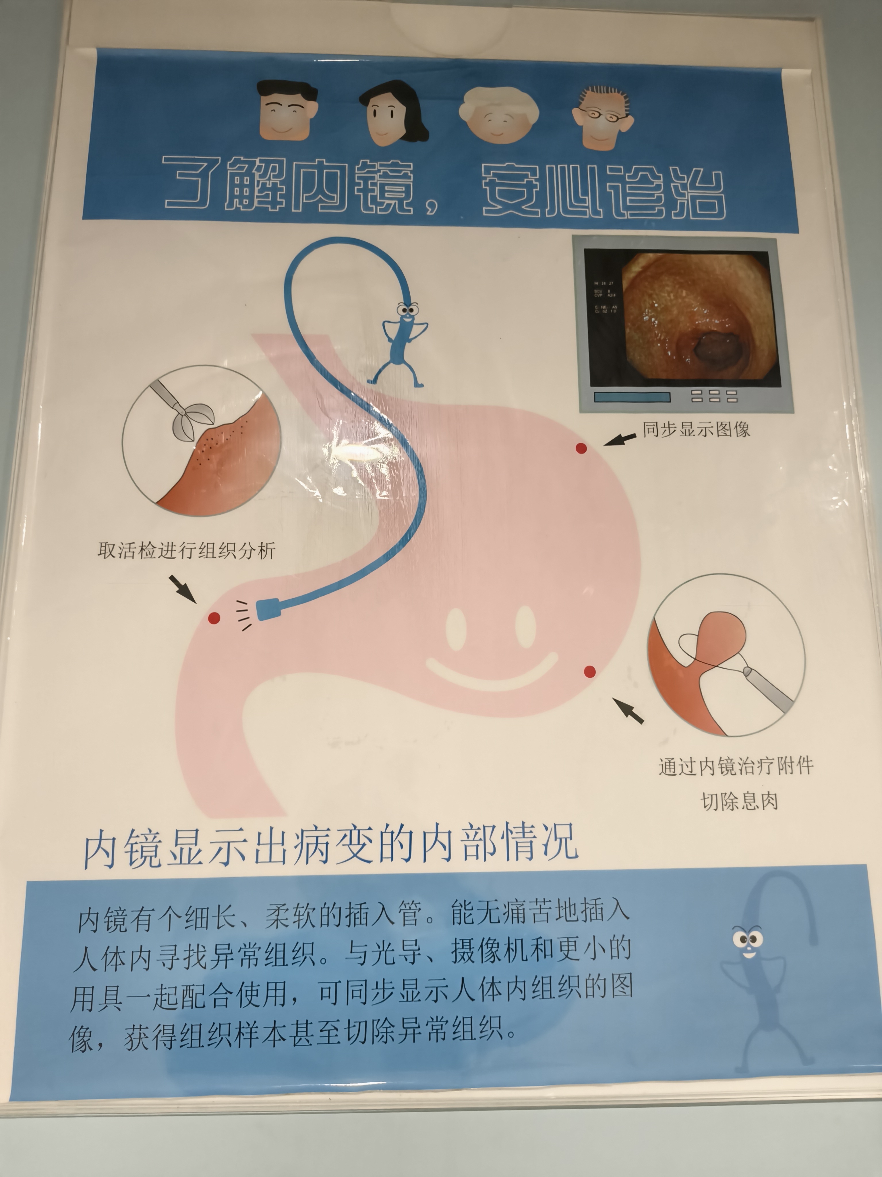 内镜有个细长柔软的插入管,能无痛苦地插入人体内寻找异常组织。与光导,摄像机和更小的用具一起配合使用,可同步显示人体内组织的图像,获得组织样本甚至切除异常组织。