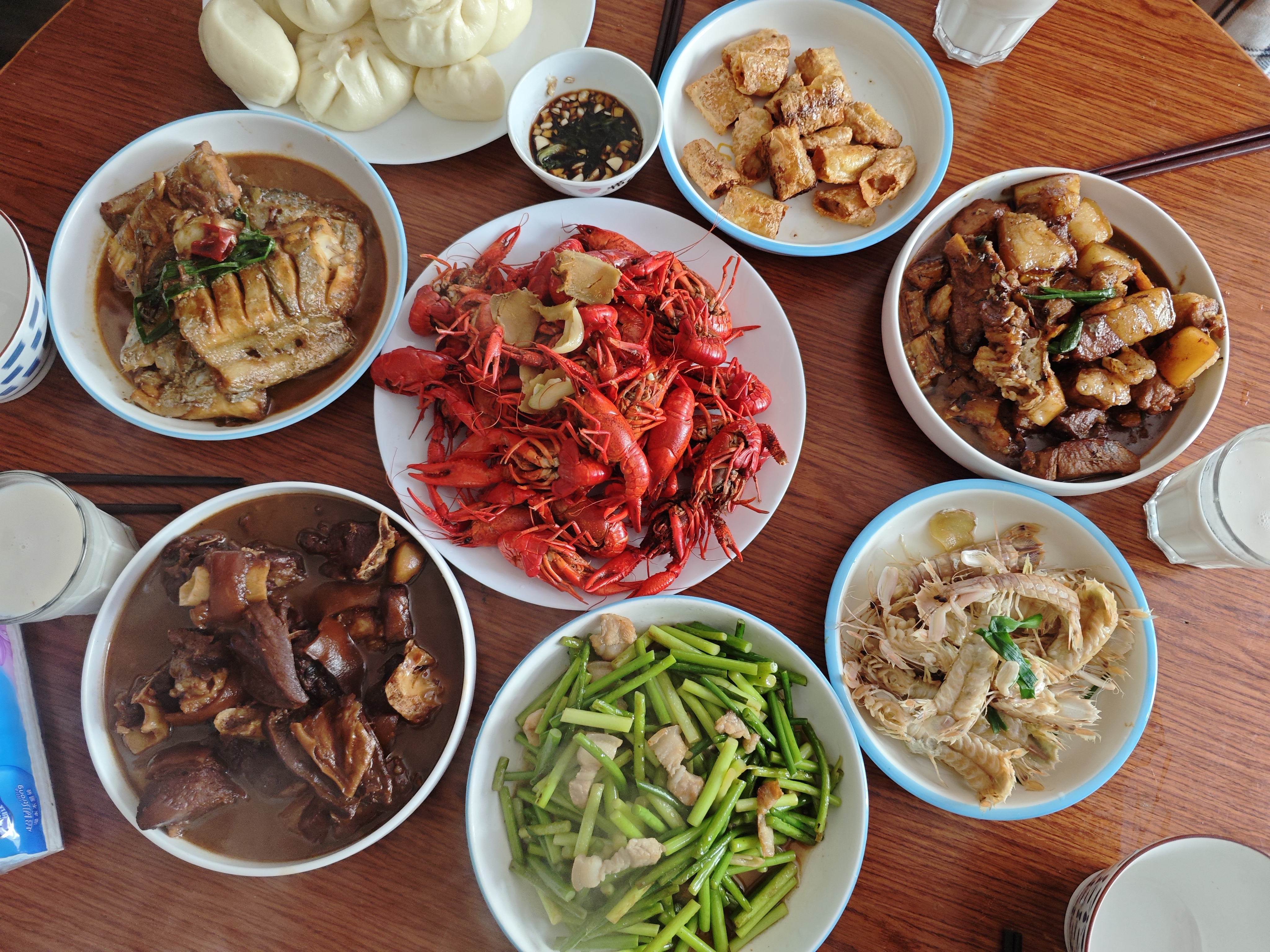 一桌烟火,春日温情 木桌的纹理里,藏着时光的温度。一桌家常菜,似一幅泼墨的生活长卷,将烟火气晕染得淋漓尽致。 最惹眼的是那盘小龙虾,艳红的壳在白瓷盘里堆叠成火焰的形状,蒜粒似碎玉散落其间,仿佛还带着油焖时的热辣气息,勾得人舌尖生津。旁侧的红烧带鱼卧在浓褐的酱汁里,鱼身划着刀纹,葱花与红椒似翡翠玛瑙,点缀出几分雅致,酱香透过空气,漫过鼻尖,那是岁月沉淀的醇厚味道。 红烧肉与炖羊肉的碗盏里,深褐的汤汁裹着油亮的肉块,肥瘦相间的纹理间,仿佛凝着慢火细炖的耐心。肉皮软糯,瘦肉酥烂,每一口都是时光的馈赠,是掌勺人把牵挂炖进骨血里的温柔。皮皮虾在蓝边碗里舒展着灰白的身躯,葱段似绿玉簪子,衬得海鲜的鲜气更足,仿佛刚从浪花里跃上餐桌。蒜苔炒肉的翠绿与浅黄交织,脆嫩的茎秆裹着肉香,是春日生机与人间烟火的拥抱。 金黄的煎豆腐块,外皮微焦,内里绵软,酱汁的咸香渗进每一丝孔隙,是朴素食材的华丽转身。白胖的包子挤在盘里,褶皱间藏着麦香,仿佛在等待一双双筷子,开启蓬松的柔软。小碟里的蘸料,蒜末与香醋交融,是解腻的点睛之笔,为这桌盛宴添了几分灵动。 玻璃杯里的乳白牛奶玉米汁,似凝住的月光,静静伫立在旁,等候与热菜的相遇。筷子斜倚碗沿,似在诉说即将开启的欢聚。 这一桌,是生活的诗行。每一道菜都有故事,每一缕香都含深情。它们从烟火灶台走来,带着掌勺人的心意,落在木桌之上,成为团聚的符号,温暖的注脚。在这里,食物不止是果腹的物什,更是情感的纽带,把亲情、友情,把平凡日子里的爱与暖,都烩进这一方餐桌,酿成岁月里最醇厚的回味。