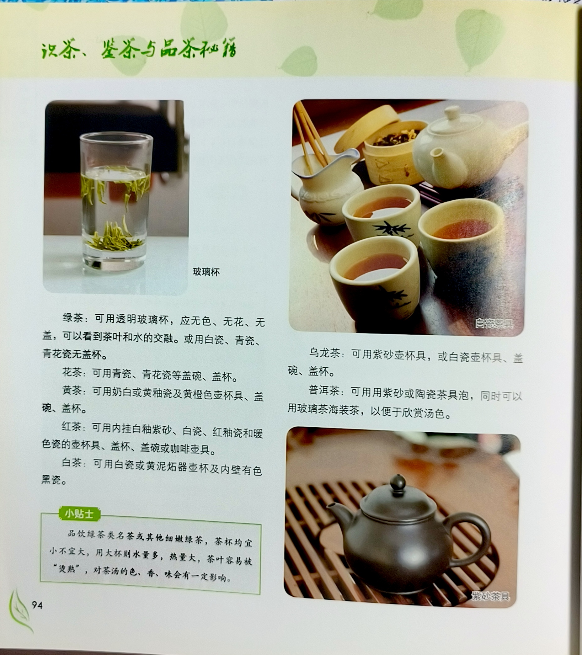 继续读茶相关的书籍。这本书静静地躺在书橱很多年了,以前读过,现在再读,温故而知新,又有新的收获,关于不同茶类对应的茶具选择建议。 茶具一般是指泡茶用的器具,包括茶杯、茶壶、茶碗、茶盘。应根据不同类型的茶选择合适的茶具,以充分发挥茶的品质、香味和口感。 绿茶:建议使用透明玻璃杯,可以观察茶叶与水的交融和茶叶在水中的舒展,也可用白瓷、青瓷、青花瓷的无盖杯。 喝绿茶或其他细嫩茶叶时,茶杯宜小不宜大。用大杯水量多、热量大,茶叶容易被烫熟,会影响茶汤的色、香、味。 花茶:建议用青瓷、青花瓷等盖碗盖杯,可以闻香。 黄茶:可用奶白色或黄釉瓷及黄橙色的壶杯、盖碗盖杯,颜色与黄茶更匹配。 红茶:可用内挂白釉的紫砂、白瓷、红釉瓷和暖色瓷的茶具。 白茶:可用白瓷或黄泥器具。 乌龙茶:建议用紫砂壶、白瓷壶或盖碗盖杯。 普洱茶:可以用紫砂或陶瓷茶具泡,同时也可用玻璃茶海装茶,便于欣赏茶色。