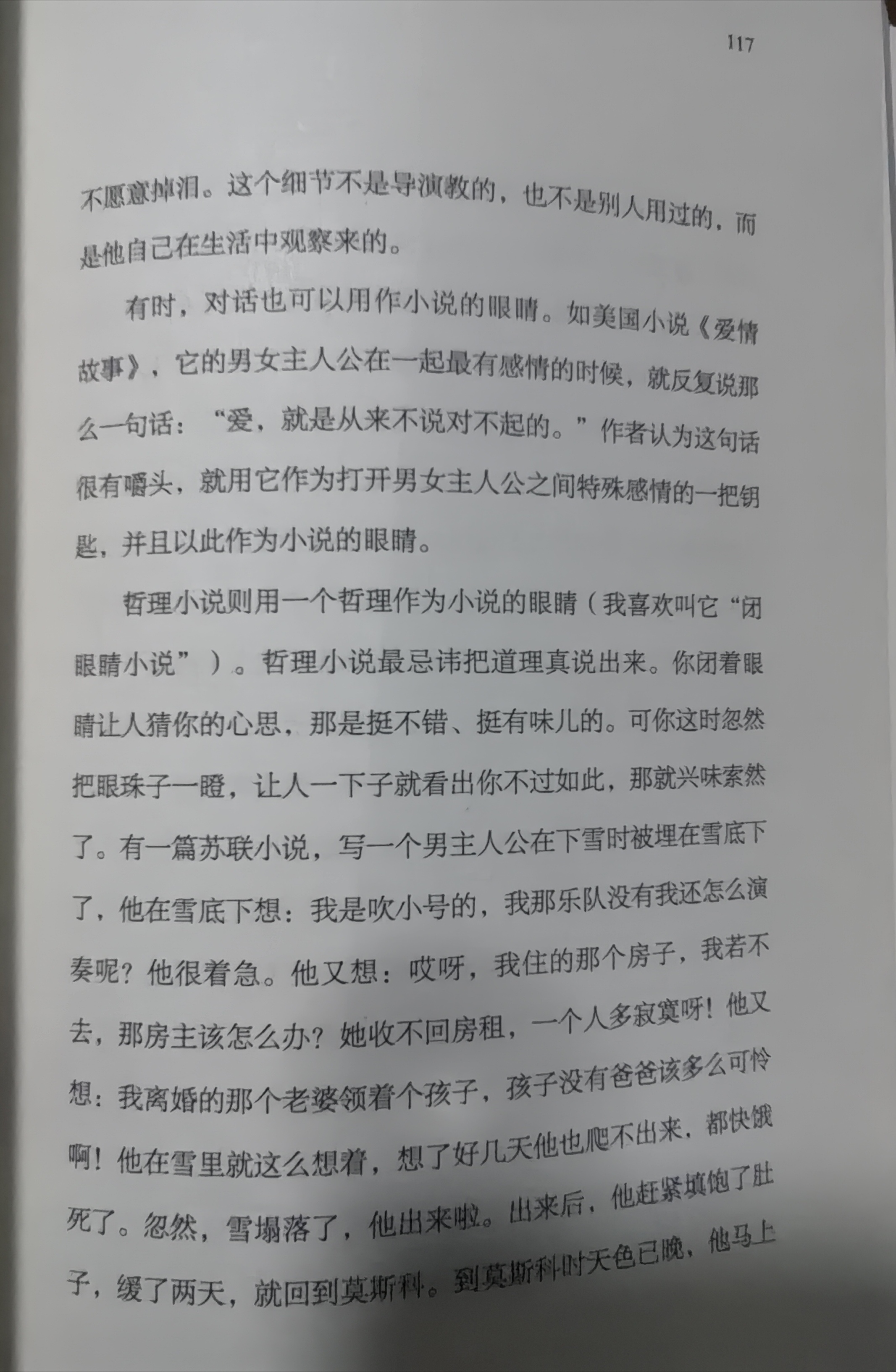 哲理小说则用一个哲理作为小说的眼睛(我喜欢叫它"闭眼睛小说")。哲理小说最忌讳把道理真说出来。你闭着眼睛让人猜你的心思,那是挺不错、挺有味儿的。可你这时忽然把眼珠子一瞪,让人一下子就看出你不过如此,那就兴味索然了。有一篇苏联小说,写一个男主人公在下雪时被埋在雪底下了,他在雪底下想:我是吹小号的,我那乐队没有我还怎么演奏呢?他很着急。他又想:哎呀,我住的那个房子,我若不去,那房主该怎么办?她收不回房租,一个人多寂寞呀!他又想:我离婚的那个老婆领着个孩子,孩子没有爸爸该多么可怜啊!