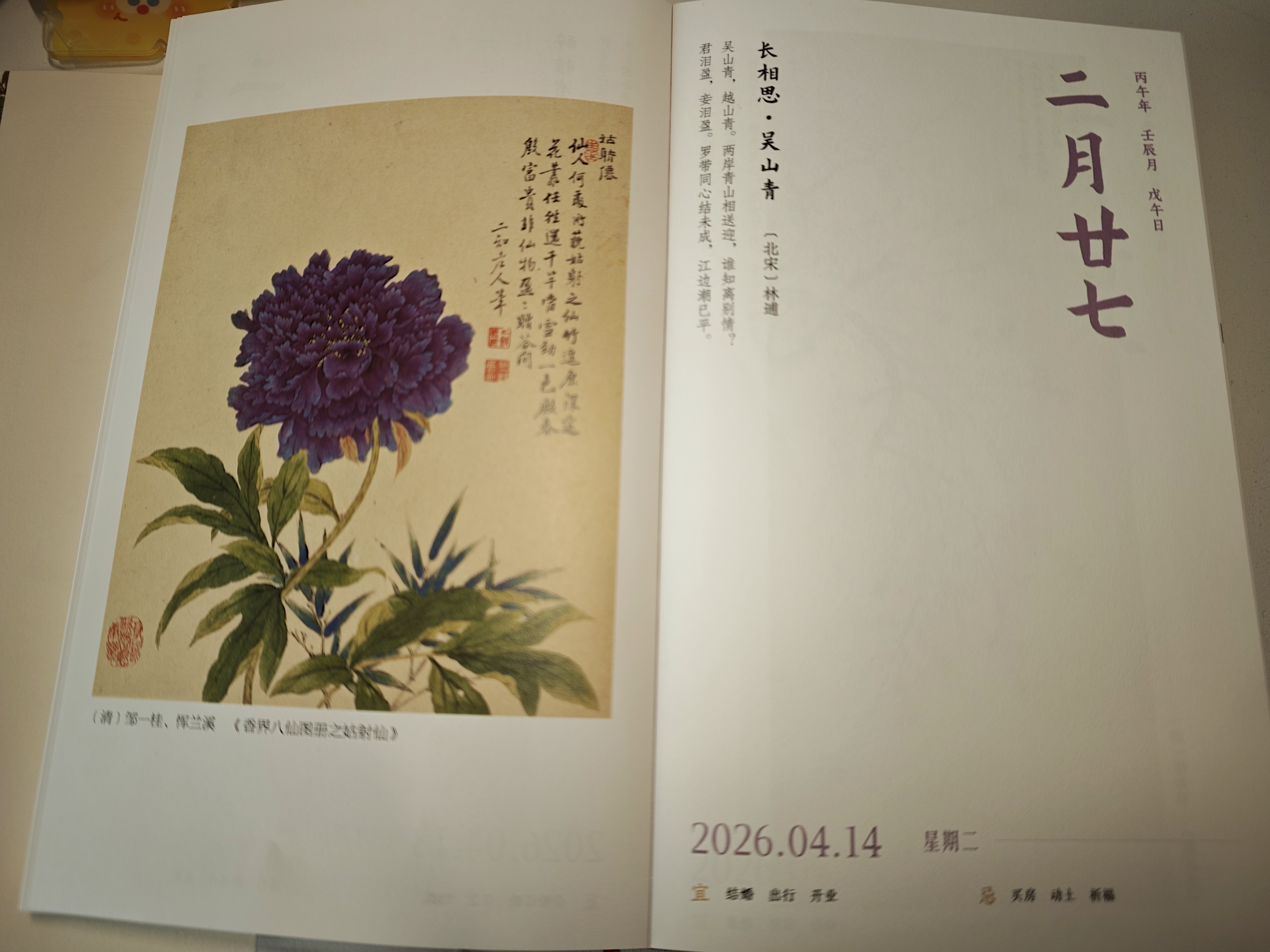 诗画书历|长相思·吴青山 《长相思·吴山青》【宋】 林逋 【原诗】 吴山青,越山青,两岸青山相送迎,谁知离别情? 君泪盈,妾泪盈,罗带同心结未成,江边潮已平。 【今译】 钱塘江北岸的吴山青翠,南岸的越山也青翠,两岸的青山隔江相对,仿佛在殷勤地送迎过往的船只。可是这亘古不变的青山啊,哪里懂得人间离别的愁苦? 你泪眼盈盈,我也泪眼盈盈,我们相爱的誓言还未兑现,罗带上的同心结还没打成,江边的潮水却已经涨满与岸齐平,催着行船要出发了。 【赏析】 这首词以一位女子的口吻,抒发了与情人被迫分离时的悲痛与无奈。全词虽短,却情景交融,读来令人回肠荡气。 作者林逋隐居杭州西湖孤山,二十年不入城市,种梅养鹤,自谓“梅妻鹤子”,世人皆以为他清心寡欲,与爱情无缘。然而,这首《长相思》却暴露了他内心世界的另一面。或许正是因为看透了人间情爱的刻骨铭心却又难以圆满,他才选择了隐居;又或许,这首词正是他对某段逝去情感的追忆与祭奠。这首词让我们看到,即便是不食人间烟火的隐士,内心深处也藏着最柔软、最炽热的情感。